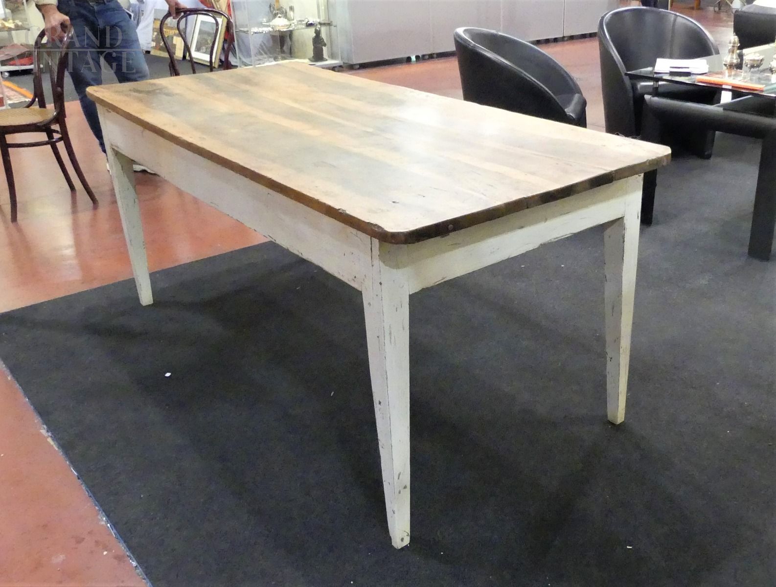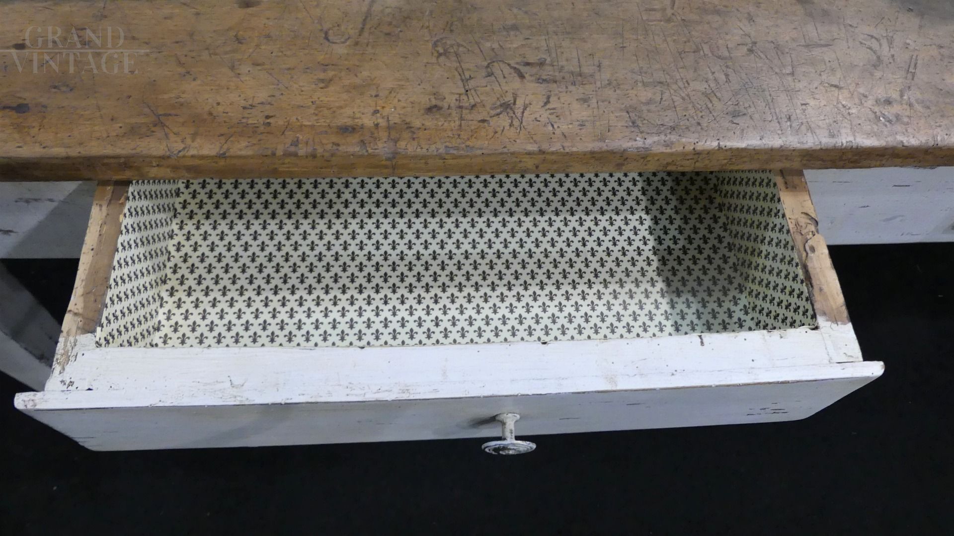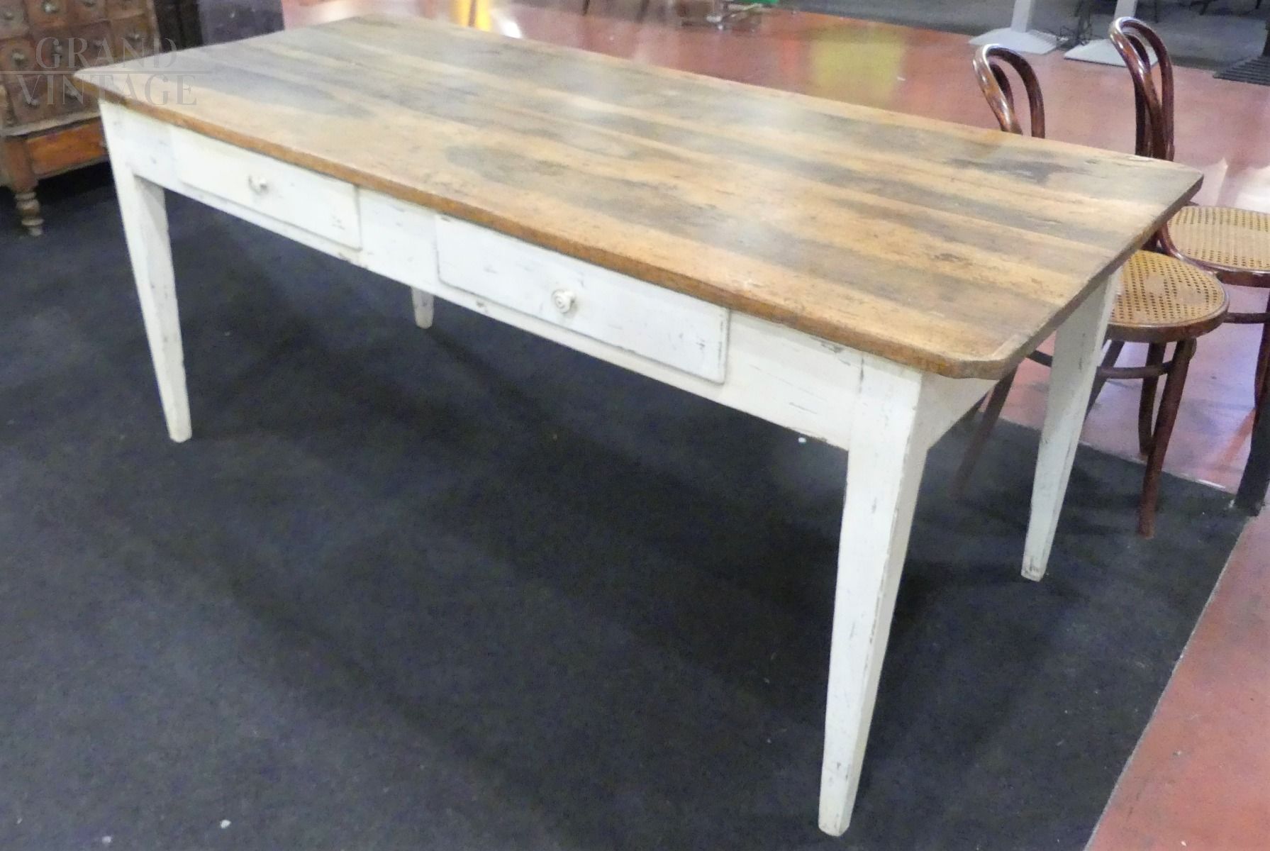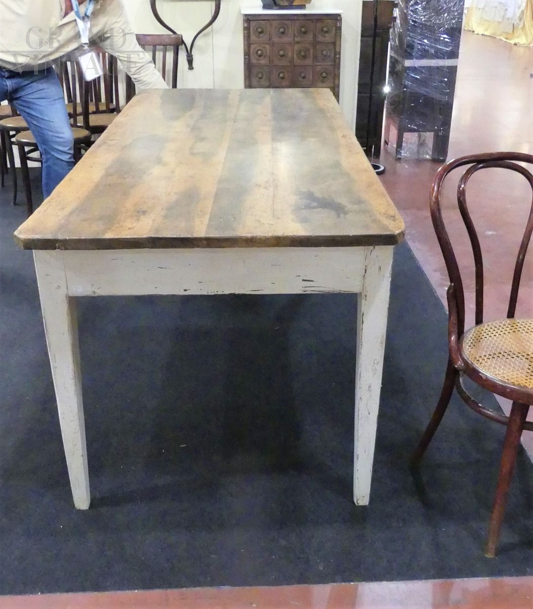 Large Tuscan kitchen table from the late 18th / early 19th century, original in all its parts, with white lacquered chestnut wood structure and solid walnut top, complete with two drawers.