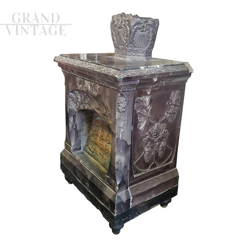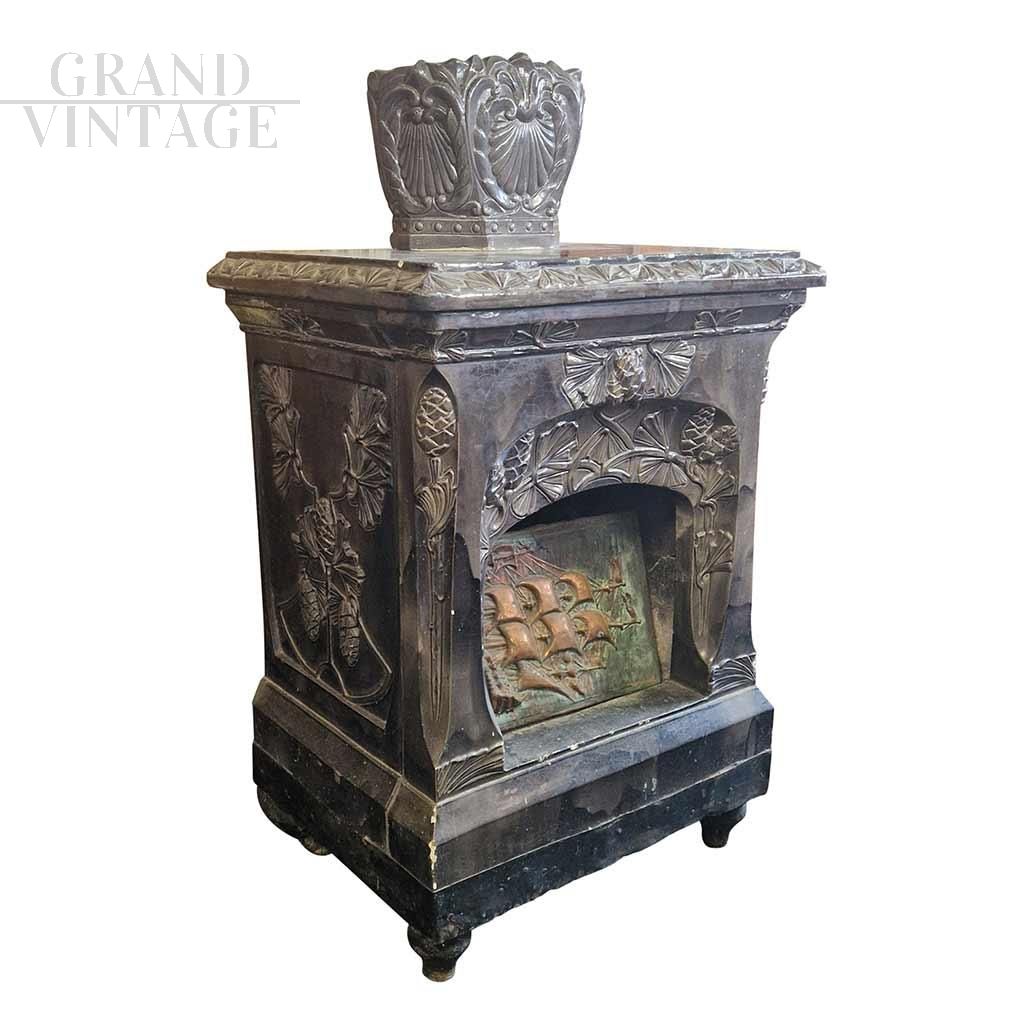 Antique majolica stove from the late 19th - early 20th century, with physiomorphic ornamental motifs and a large sailing ship in relief on the front of the combustion chamber closure.