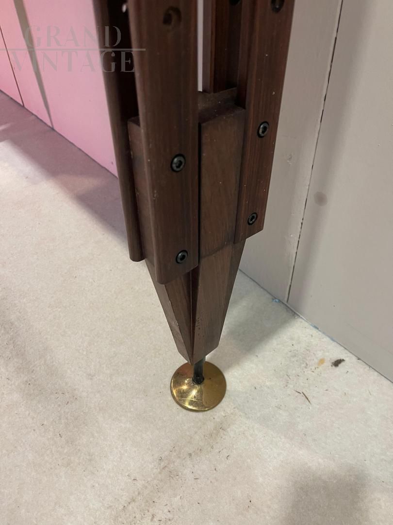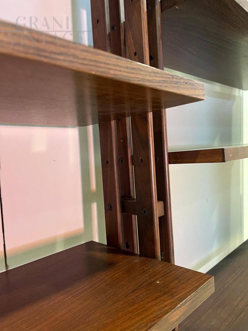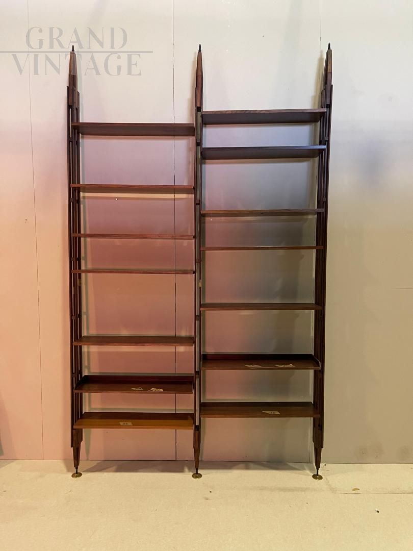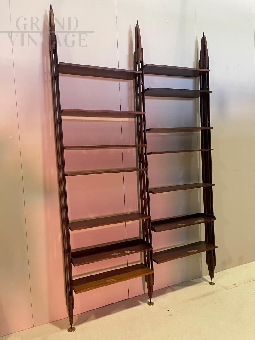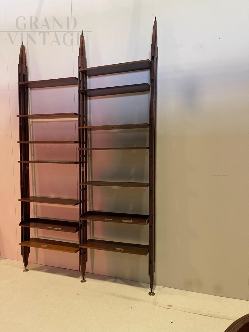 An icon of 1950s Italian design, the LB7 ceiling bookcase by Franco Albini is a refined example of balance between functional aesthetics and technical innovation. This self-supporting structure is designed to be pressure-fixed between the ceiling and the floor, without the need for holes or permanent anchors, while ensuring great stability. Made of solid teak wood, it has 14 height-adjustable shelves, which slide along vertical uprights with elegant hidden joints. The modular system allows for complete customization of the layout, adapting perfectly to domestic or professional spaces. The LB7 represents a perfect combination of craftsmanship and rational modernism, and is still sought after by many today.