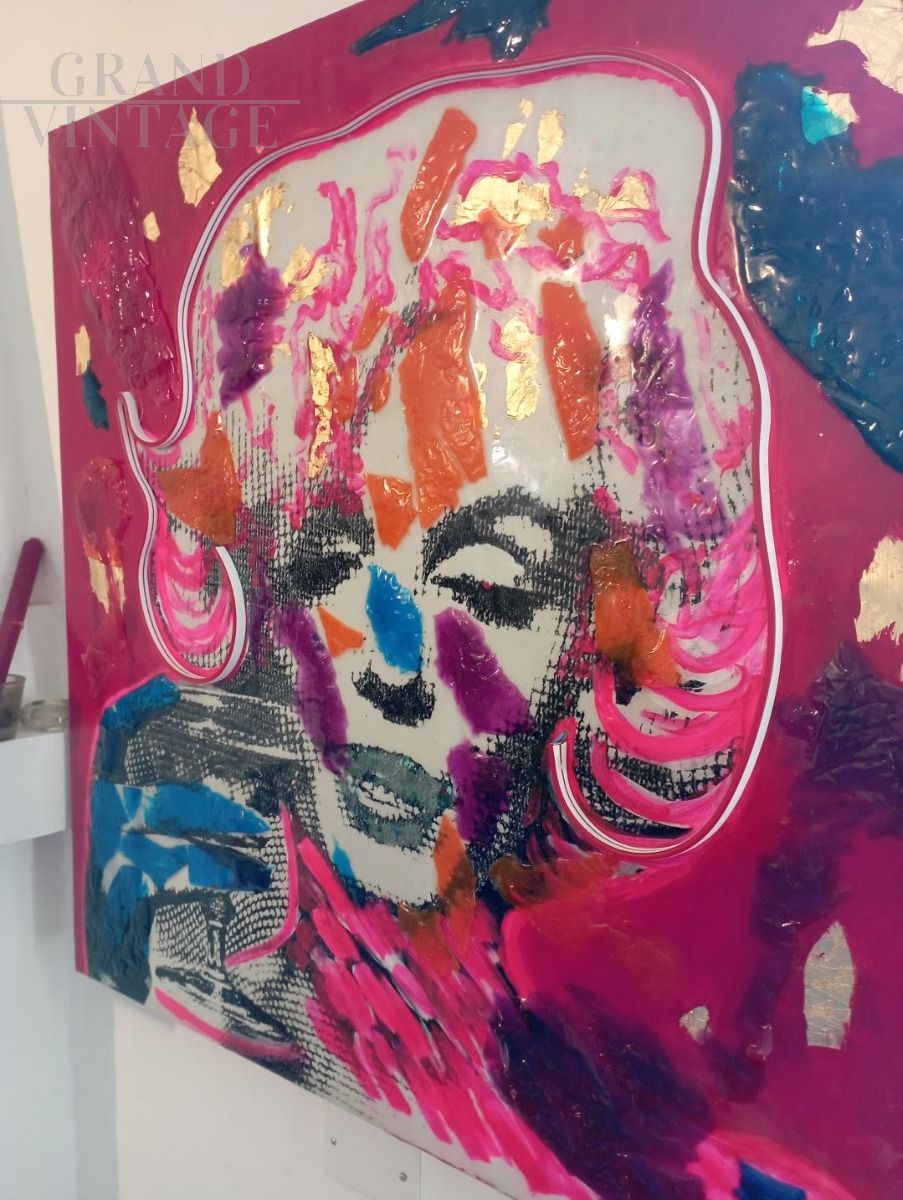 Mixed media painting by Rolando Pellini depicting the icon Marilyn Monroe, represented with collage, resins and acrylic colors, with 220 volt pink LED lighting framing her silhouette, 4 m power cable included.