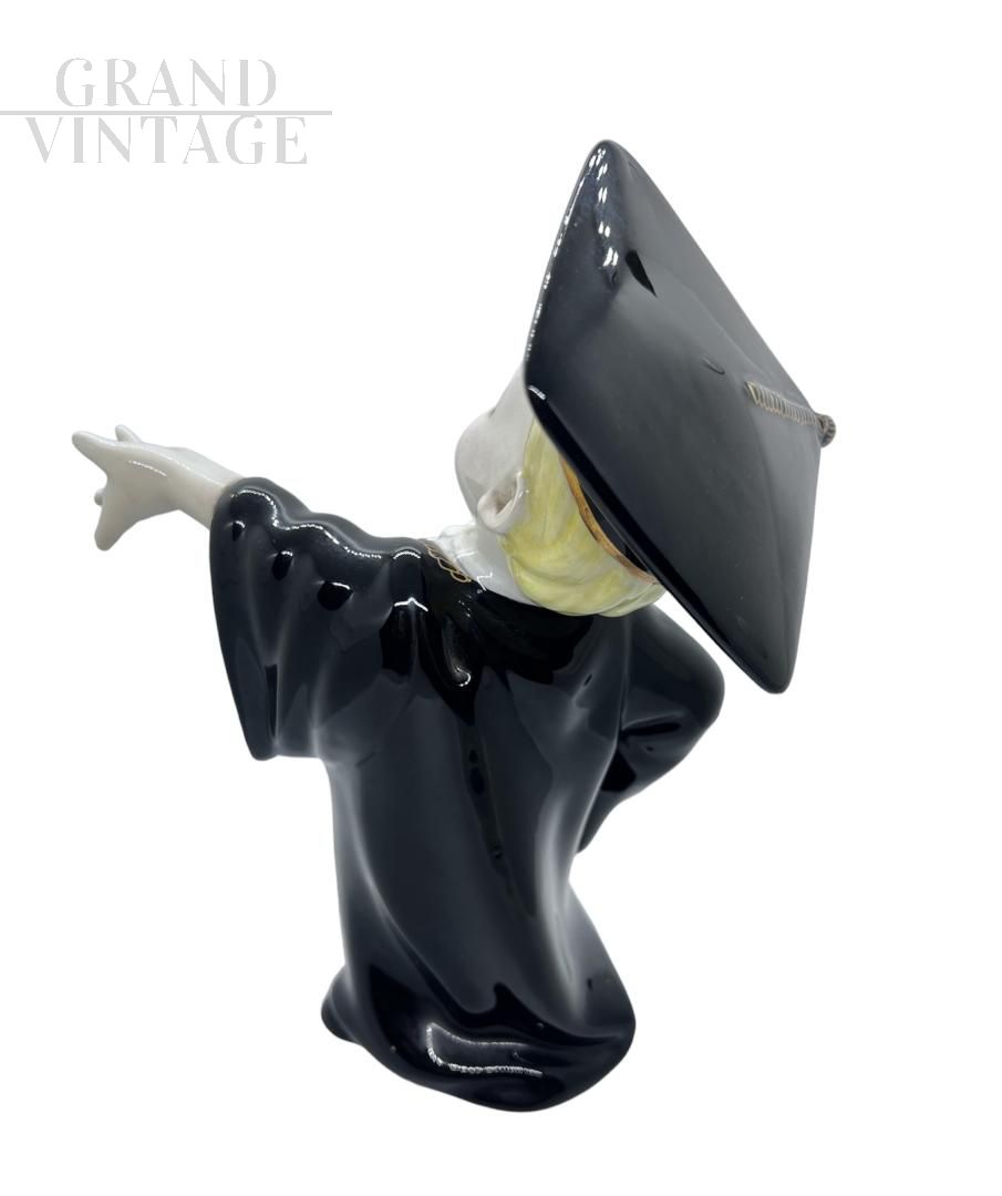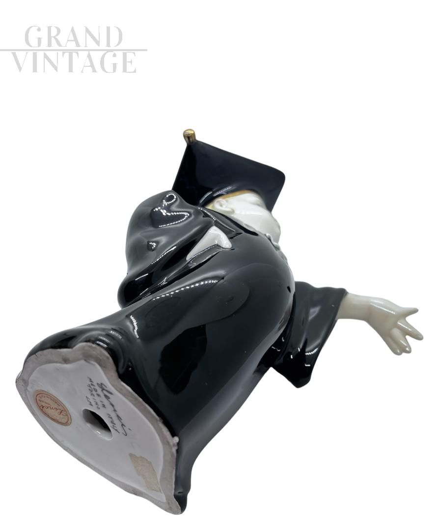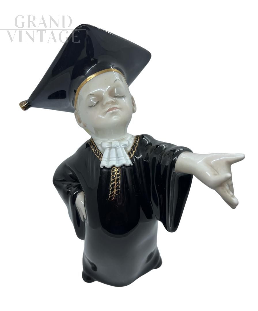 Ceramic little lawyer sculpture created by Mario Mesini for Lenci in 1930 with a casting technique and painted in polychrome with gold finishes, depicting a child lawyer in a black robe. Under the base it bears the hand signature "Lenci made in Italy". The statue is in excellent condition, with no signs of wear.