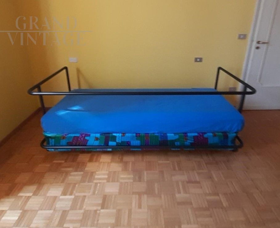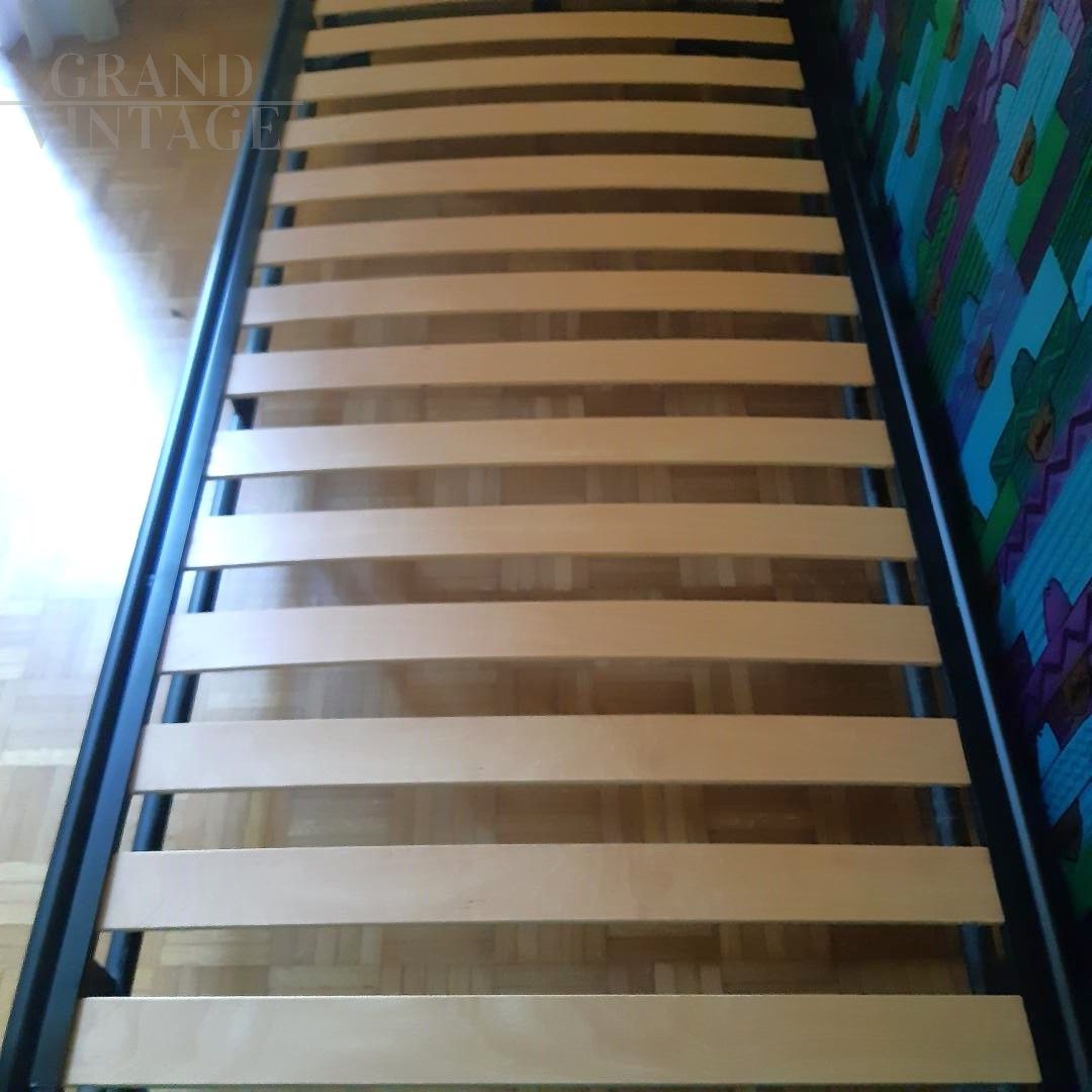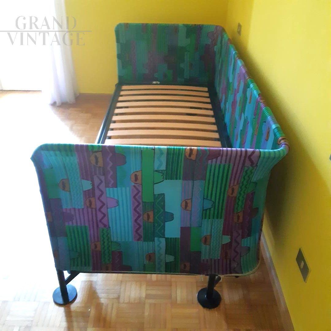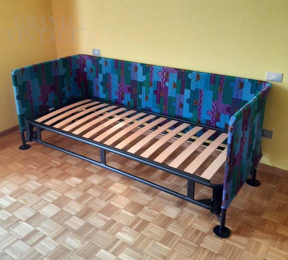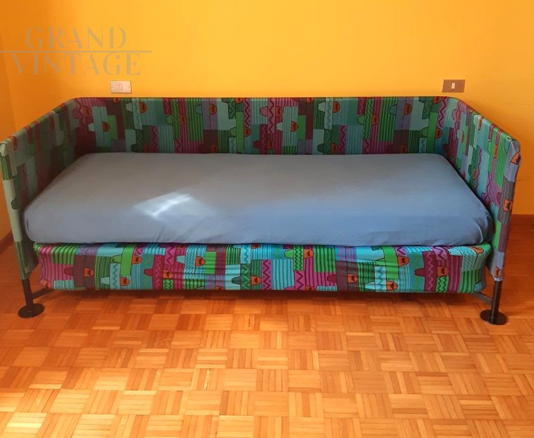 Flash single sofa bed by Interflex with sturdy matt black metal structure covered with removable elastic fabric. The cover has zippers that allow it to be easily removed for washing. The frame is assembled with Allen bolts and is easily disassembled in order to reduce the dimensions for easier transport. The bed, equipped with a beech wood slatted base, is ideal for a children's room because during the day it can be used as a sofa and at night as a bed. The seat height is 48 cm. The bed was purchased in 1990, and is a vintage and discontinued item.
