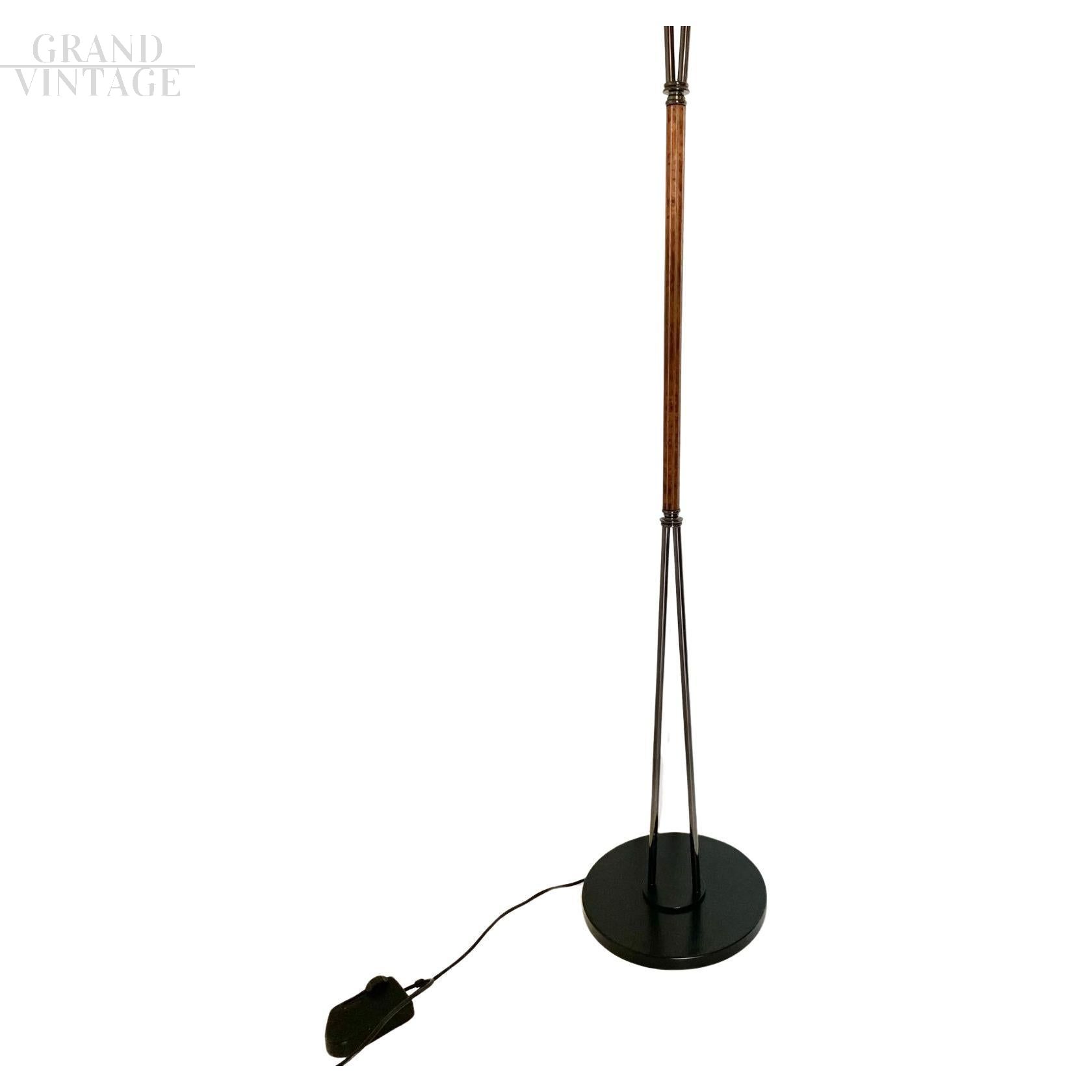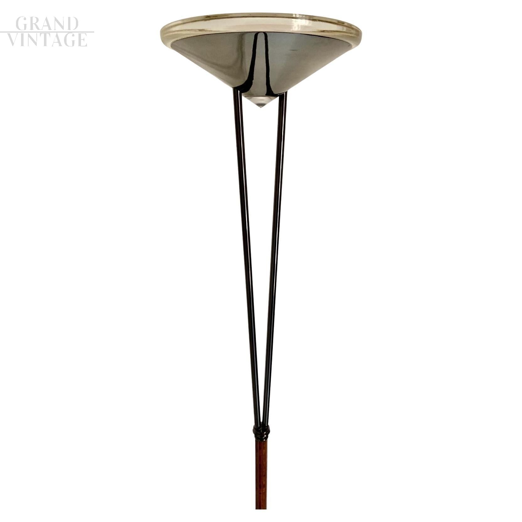 Design floor lamp from the 1980s produced by Leucos with black painted steel structure and walnut briar and two-tone Murano glass lampshade in a pyramid shape. In very good condition, with only small signs of aging. Intact Murano glass lampshade.