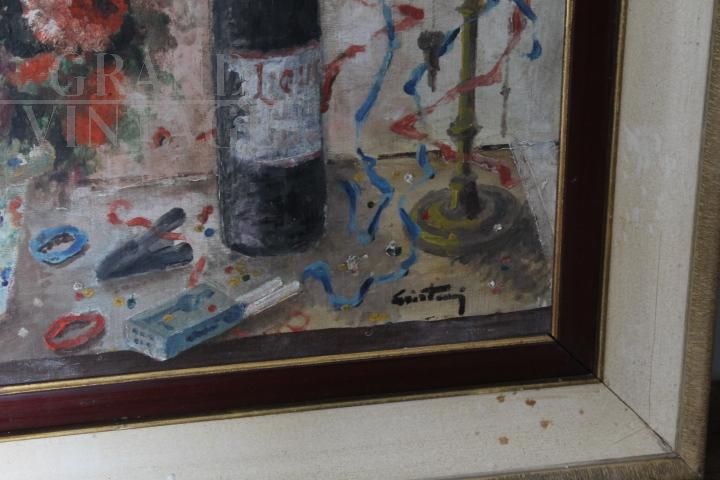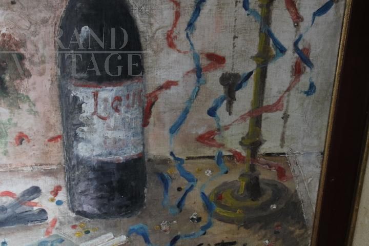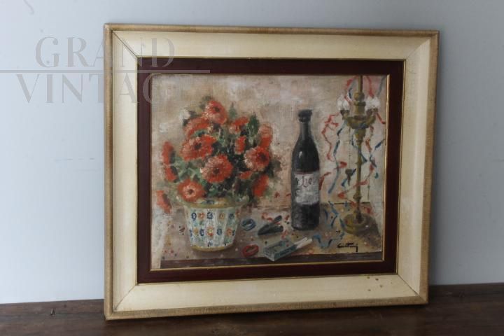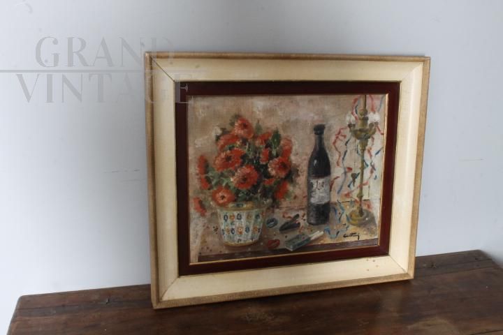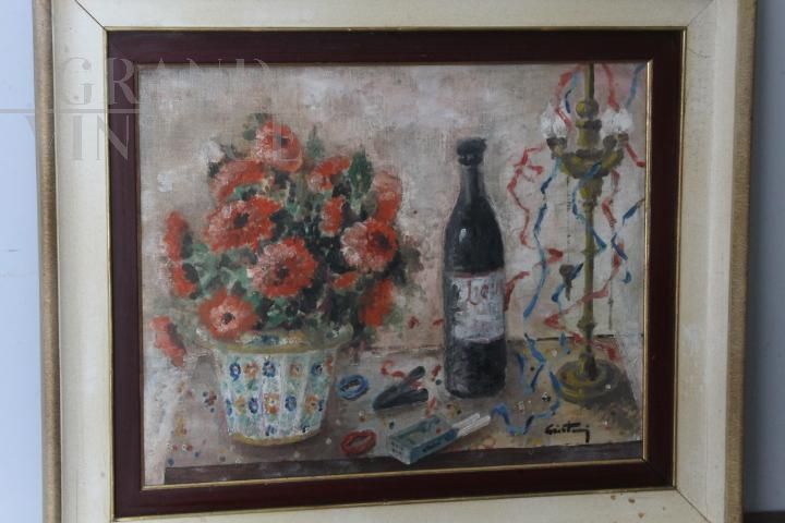 Antique oil painting on canvas from the Liberty era, 1930 - 1940, depicting still life with a bottle of wine and red flowers in a vase, from the Italian school, signed lower right. The state of conservation is very good, it does not require any intervention. Oil on canvas transferred to tablet.