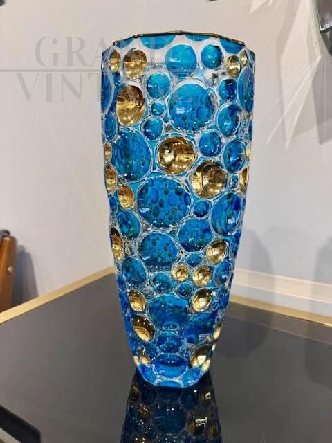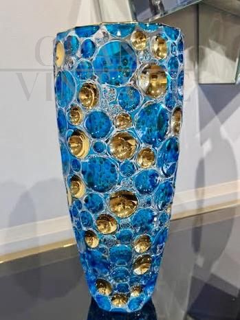 Murano glass vase hand painted with 24 Kt pure gold inserts worked by Murano masters. Vase of incredible brilliance thanks to the transparency and brightness of the turquoise color and given the use of 24 KT gold leaf. The vase measures 35.5 cm x diameter 15 cm.