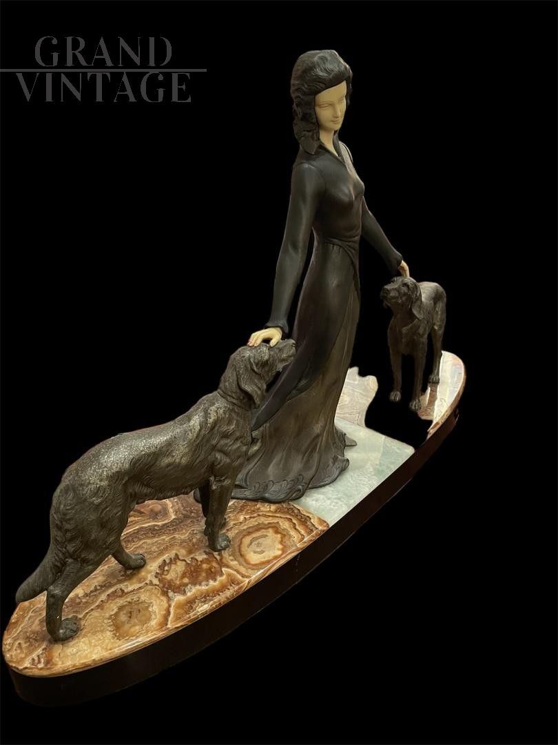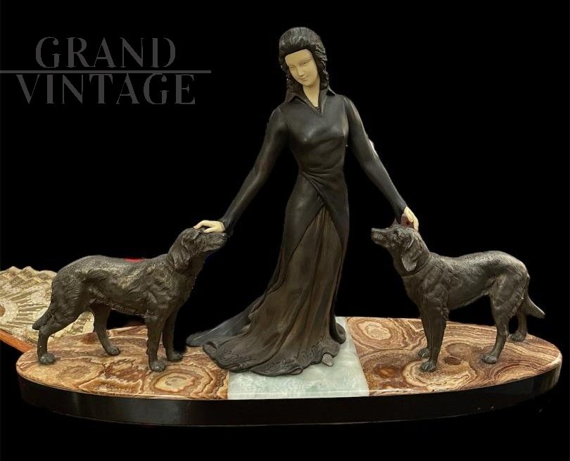 Art deco sculpture signed Jaques Limousin depicting a lady between two dogs, on a marble and onyx base, very elegant and refined, origin: 1940s France.