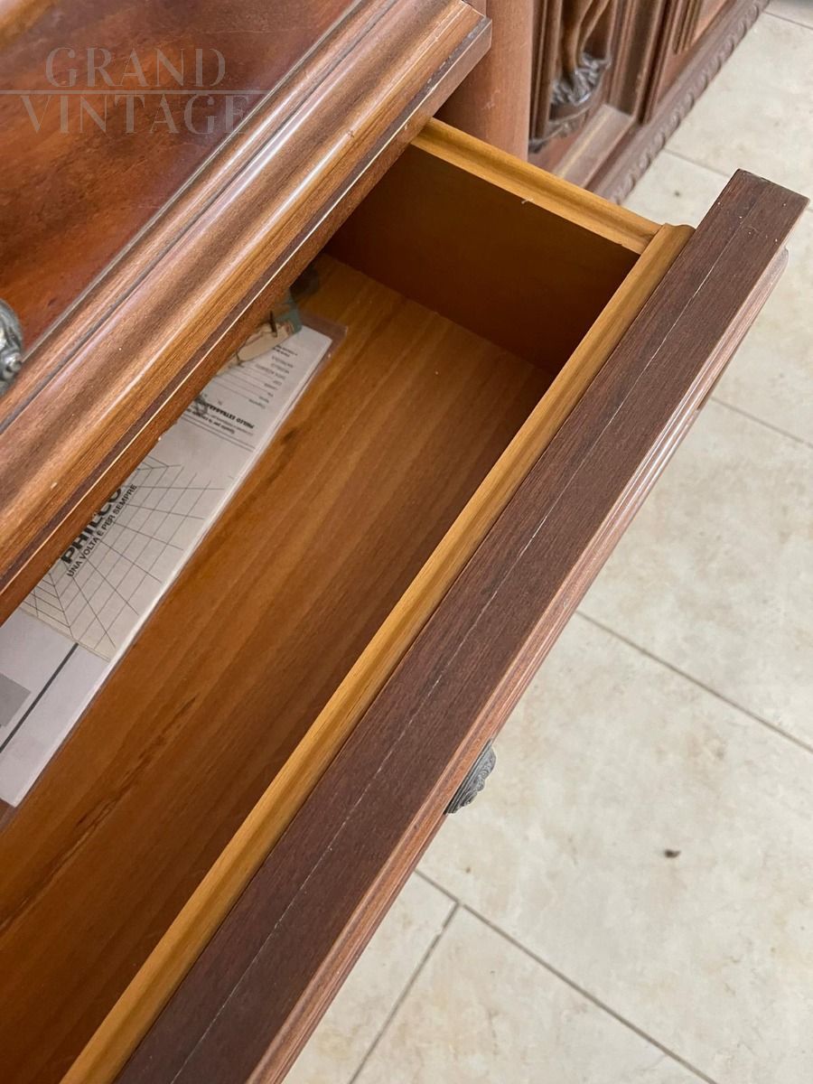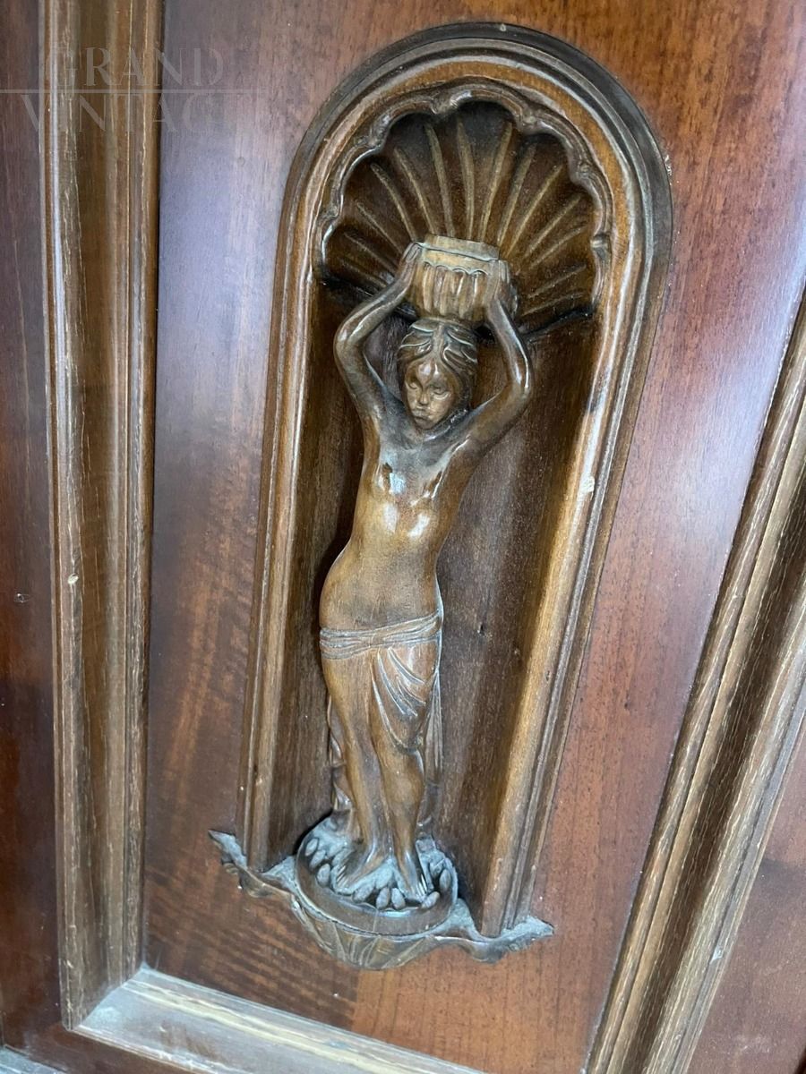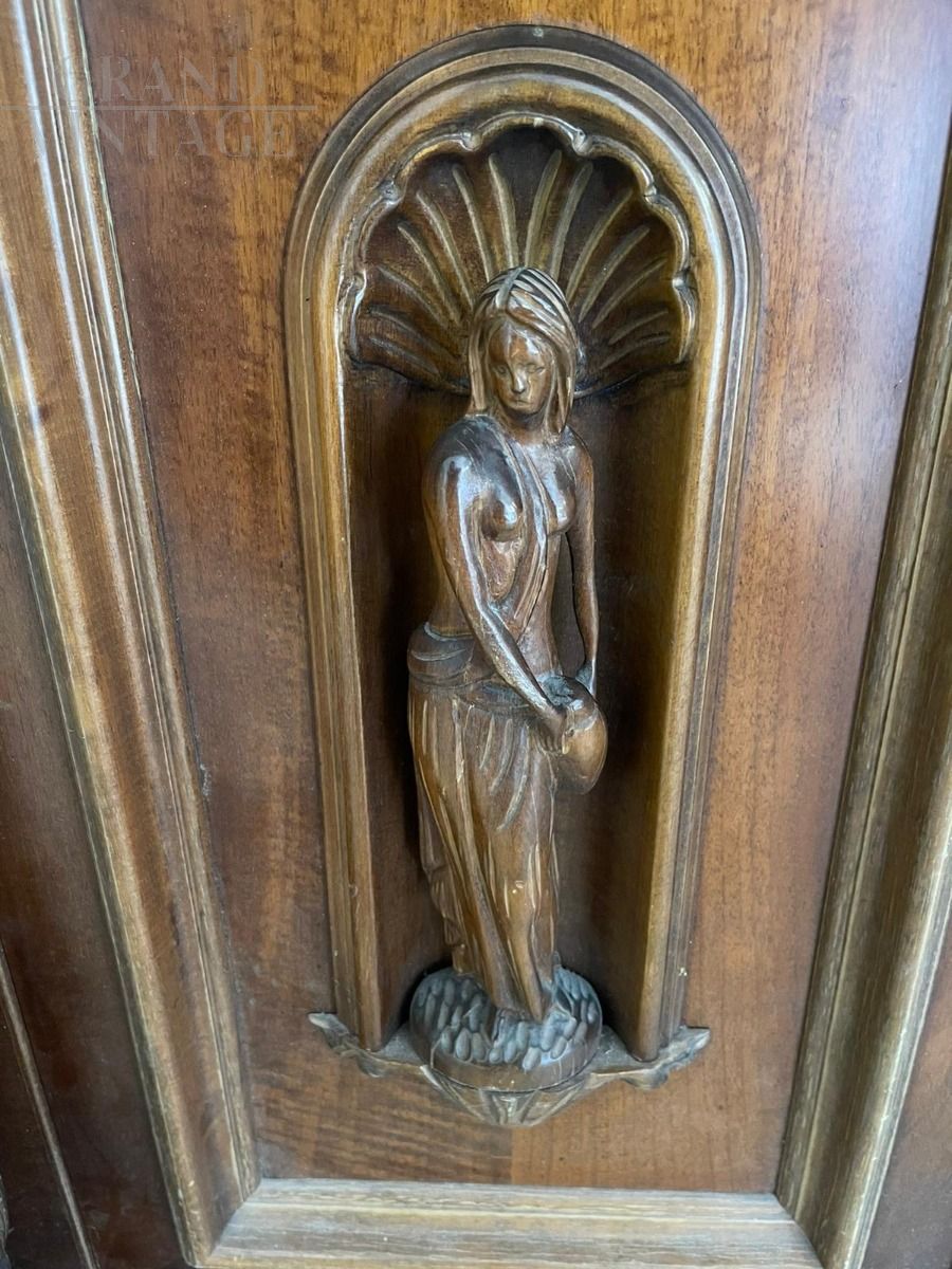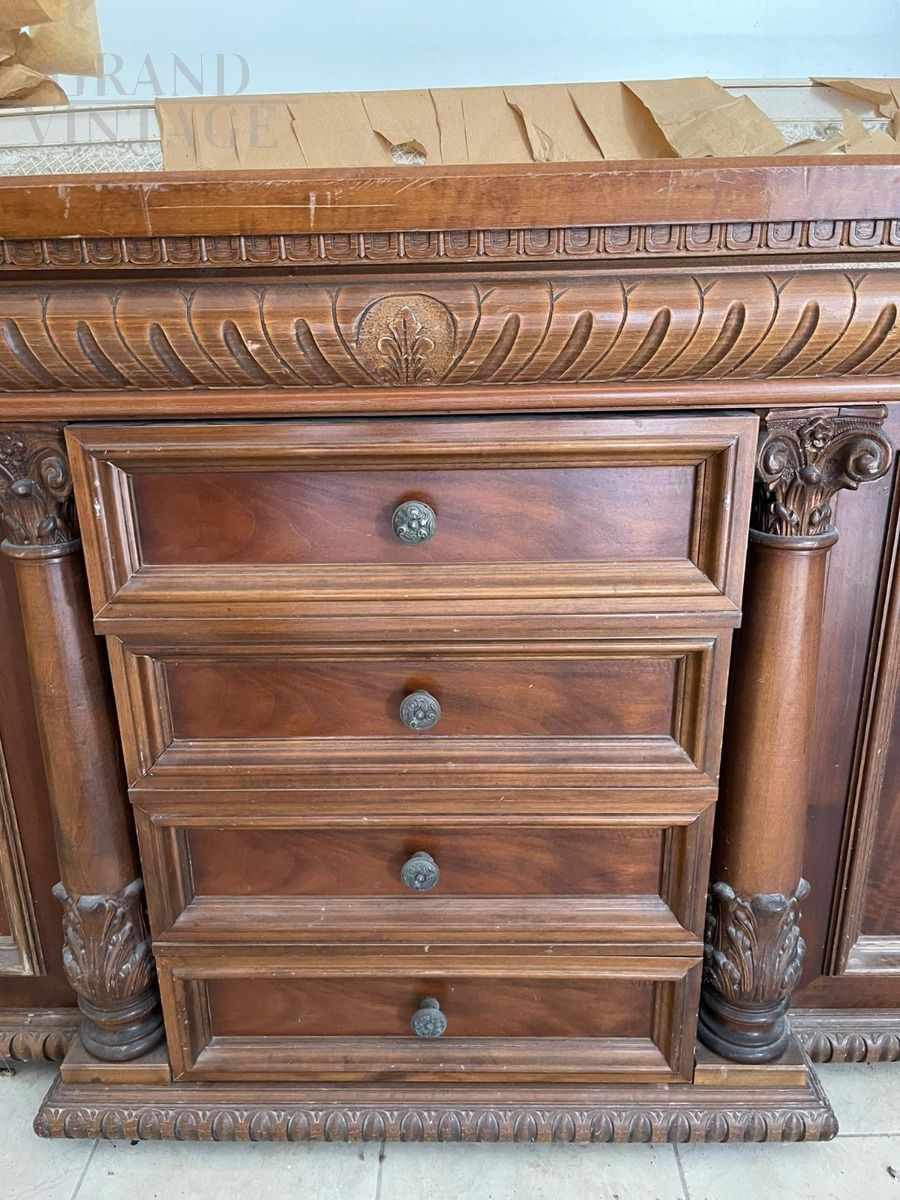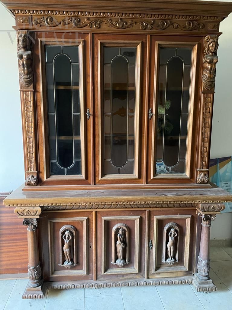 Vintage living room set consisting of a sideboard with a display case and buffet, all richly carved with statues of handmaids and floral motifs.