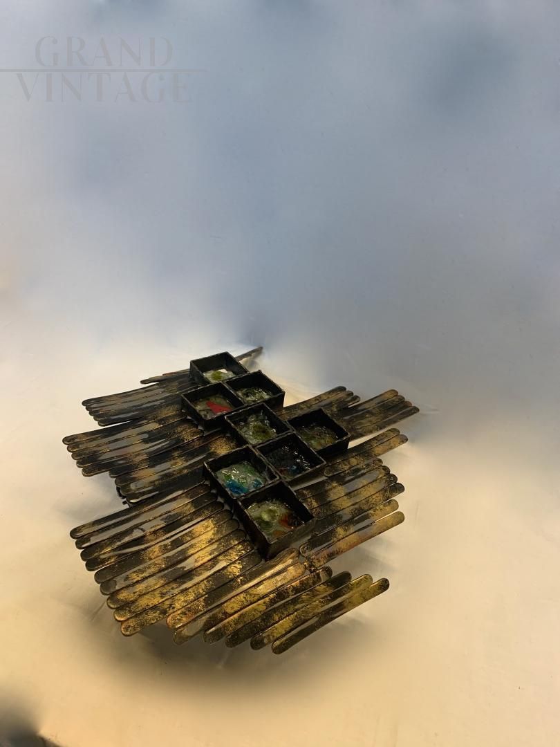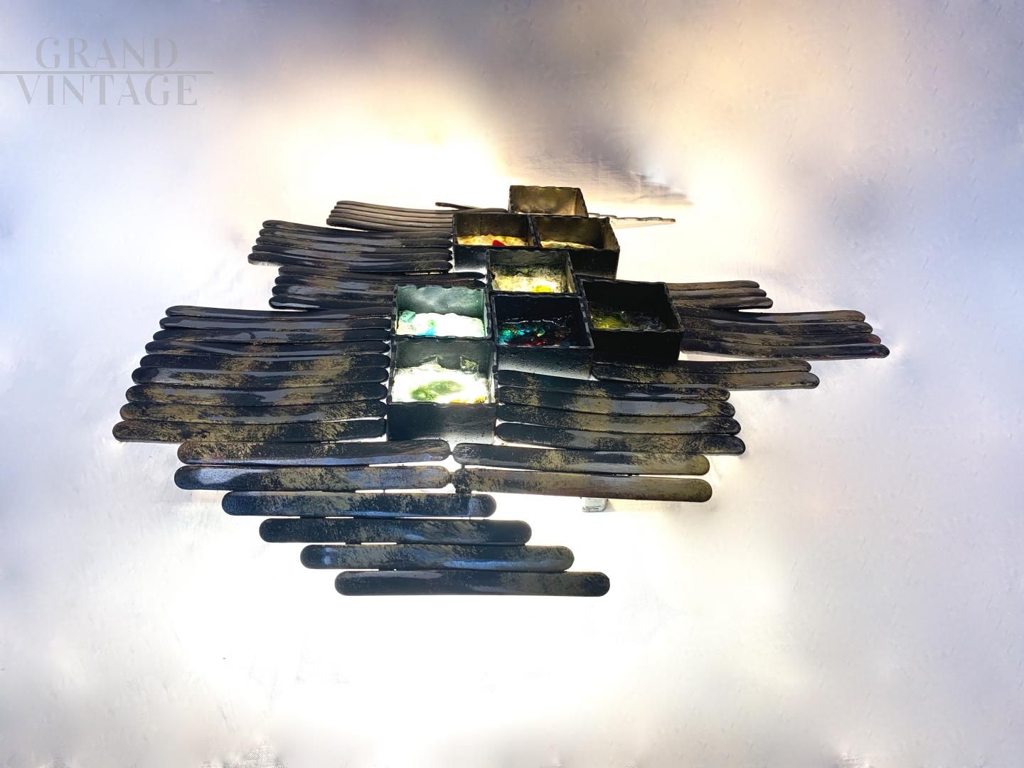 Single wall lamp of handcrafted wrought iron with Murano glass, Longobard company, with hand-cut glass glued to the structure, very beautiful and special. The structure is in hand-worked wrought iron. The lamp has 2 bulbs with E27 fitting. Excellent lamp for rustic environments. It has a square with a glass that has a small lack, which is not noticeable very much.