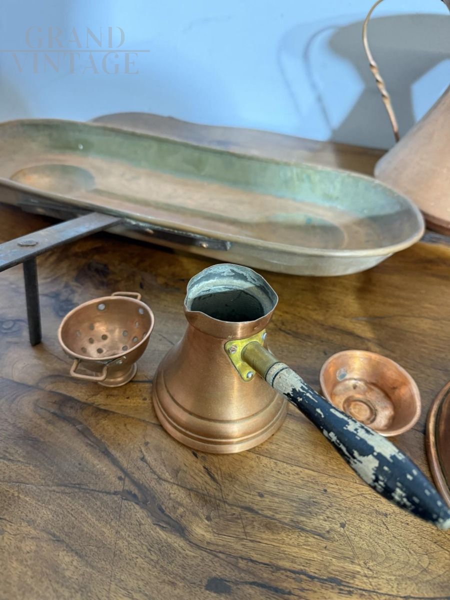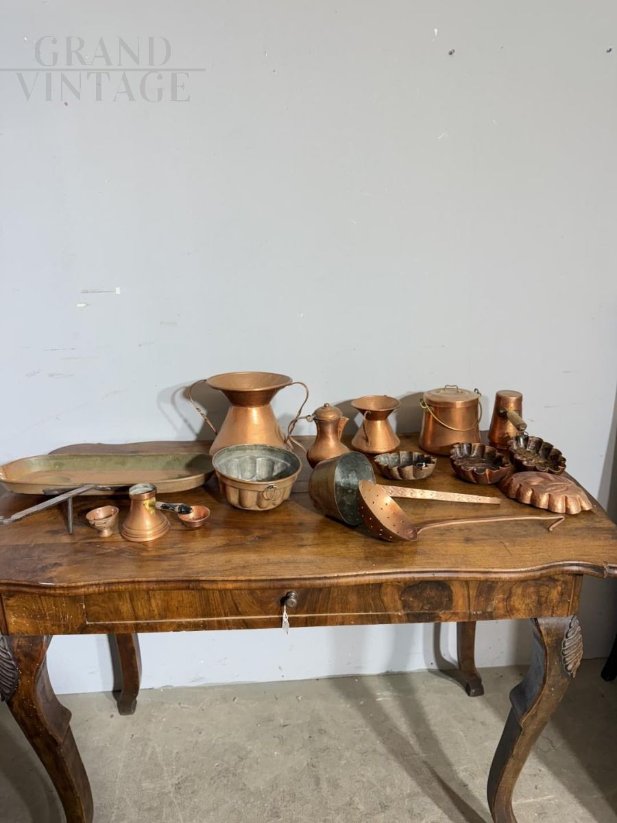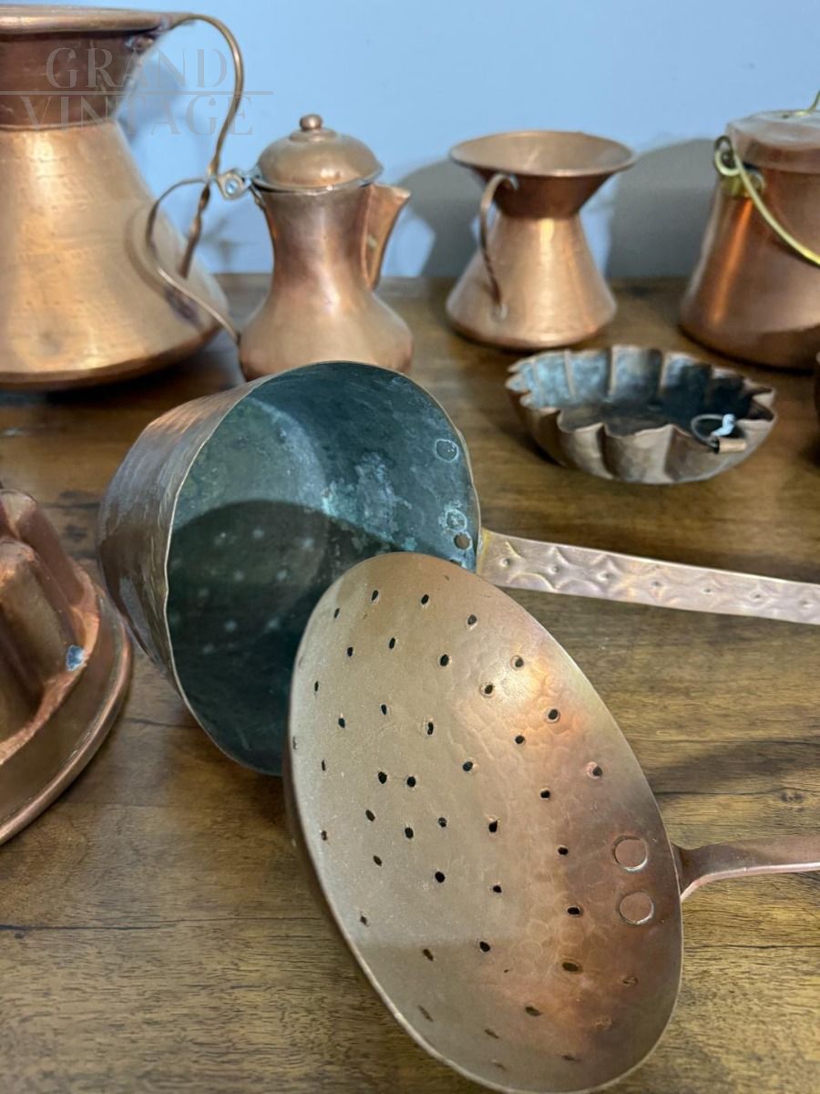 Lot of 15 antique copper kitchen objects, from the early 1900s, consisting of molds, utensils and containers of various shapes and sizes, very beautiful patina.