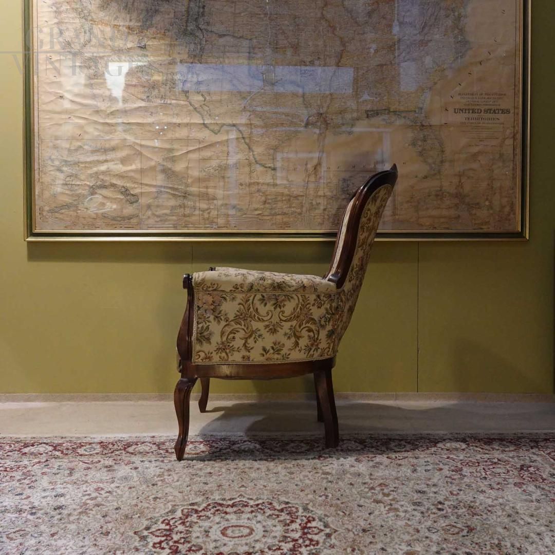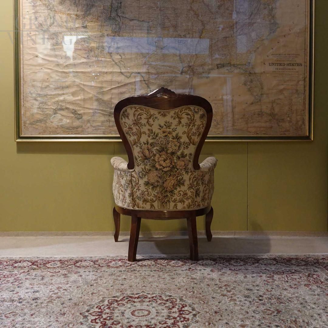 Louis XV style armchair, elegant and richly crafted with sinuous shapes, carvings and cabriolé legs, covered in floral fabric, the decorative details that recall the elegance of the French eighteenth century. Perfect for classic furnishings, luxurious environments or historical settings of great aesthetic impact.