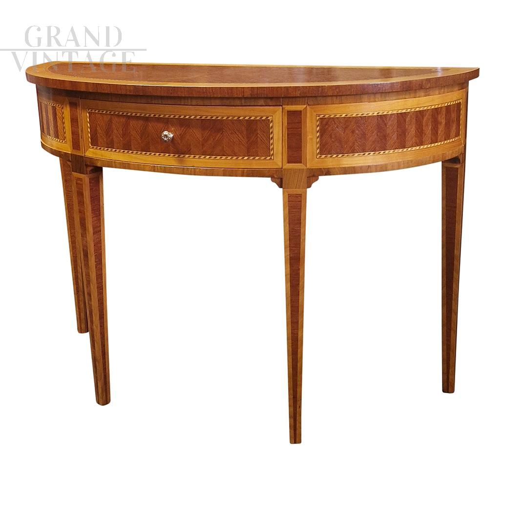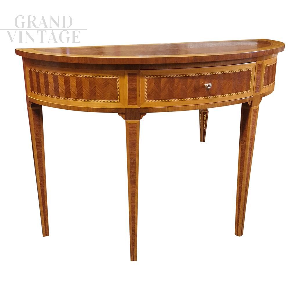 Half-moon console in antique Louis XVI style, made in the 50s in walnut with threaded inlays and marquetry, equipped with a central drawer.