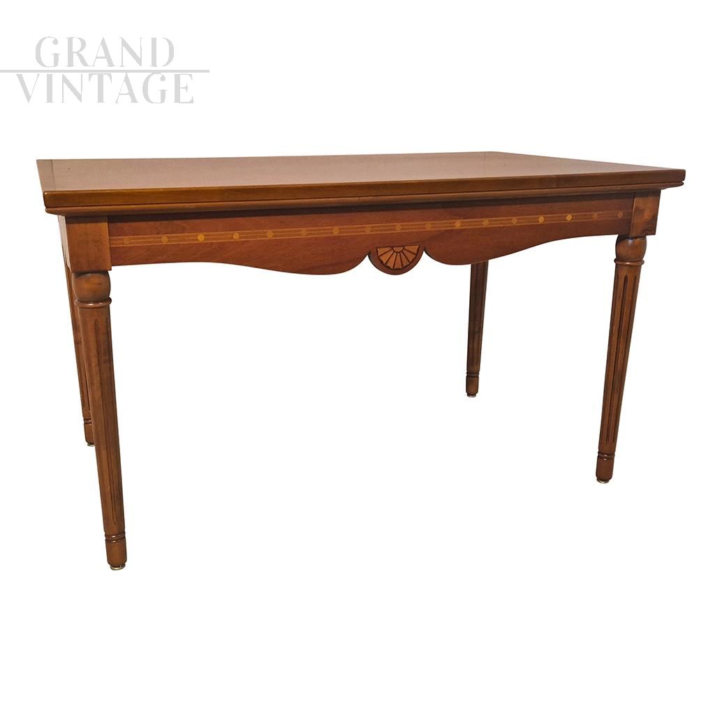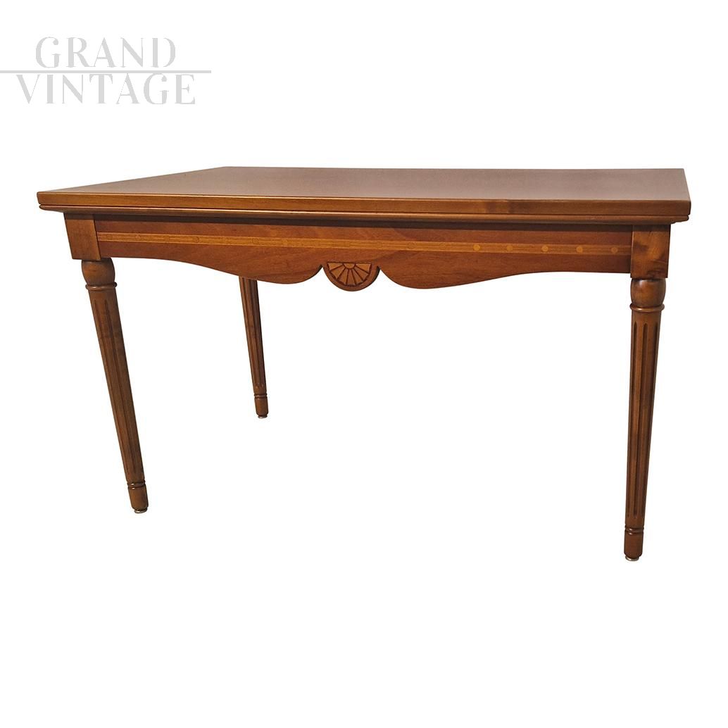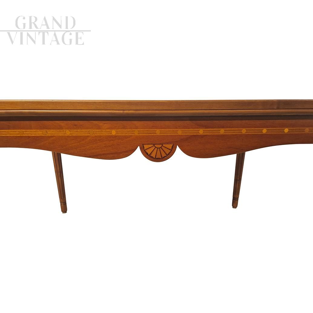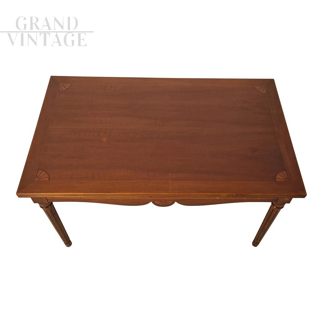 Low coffee table in antique Lombard style made in the second part of the 20th century in walnut wood with inlays on the undertop band, four fluted legs.