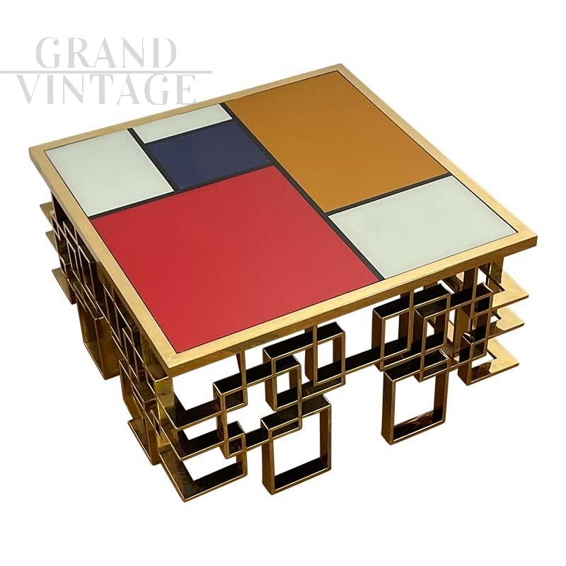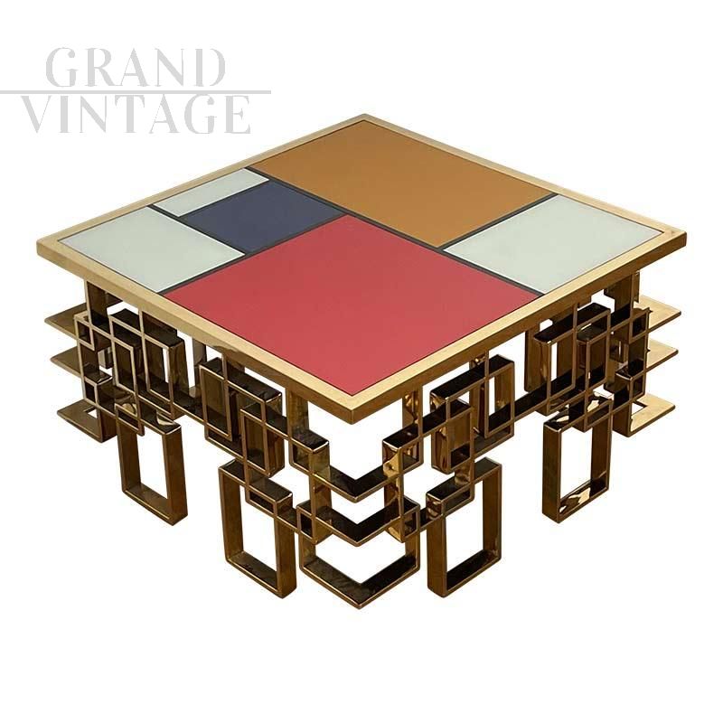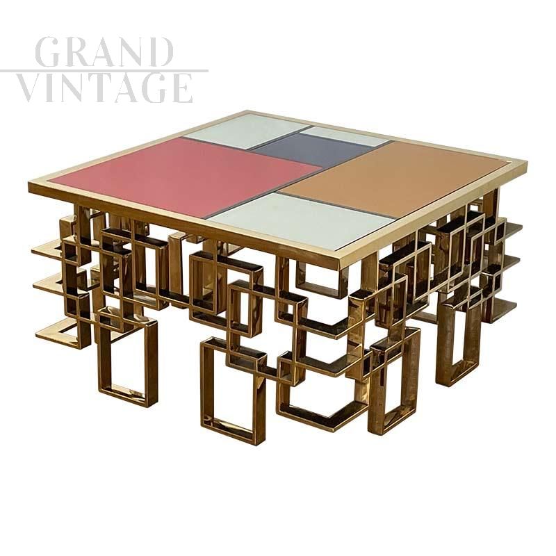 Low living room table, entirely handmade, with a base made of geometric tubular elements with a rectangular section and chrome-gold finish, top covered with glass elements of different colours.