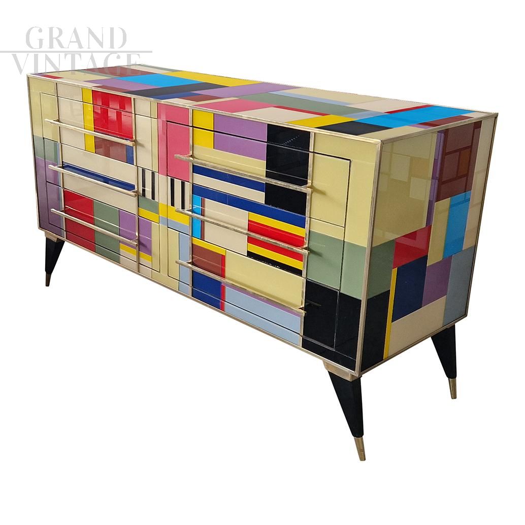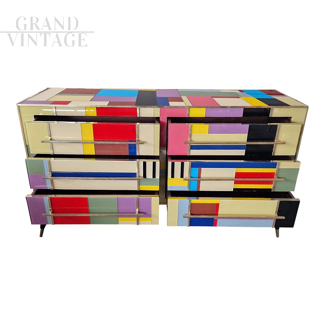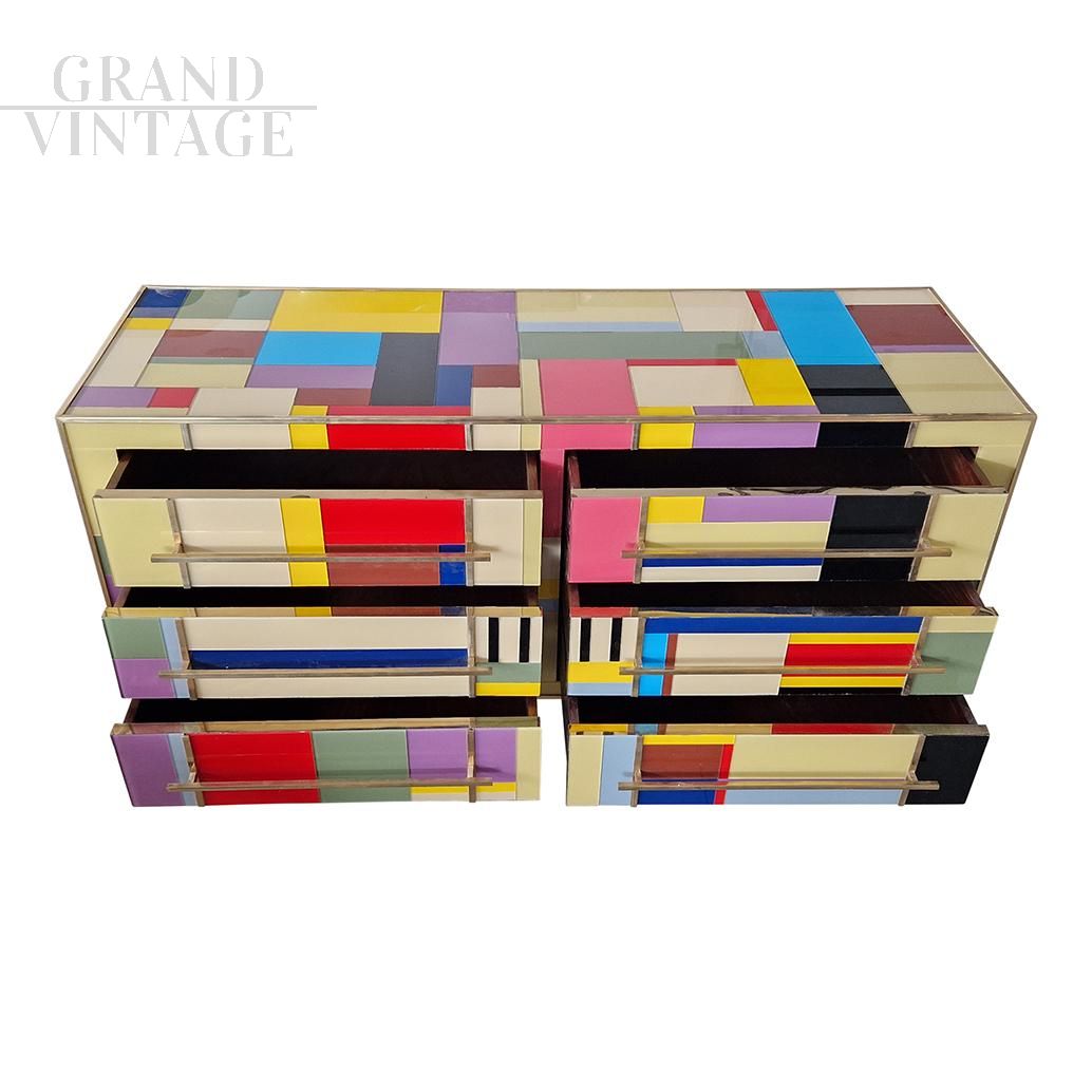 Design chest of drawers in wood covered in multicolored glass, equipped with six drawers, golden brass profiles and geometric feet in black lacquered wood with brass finish.