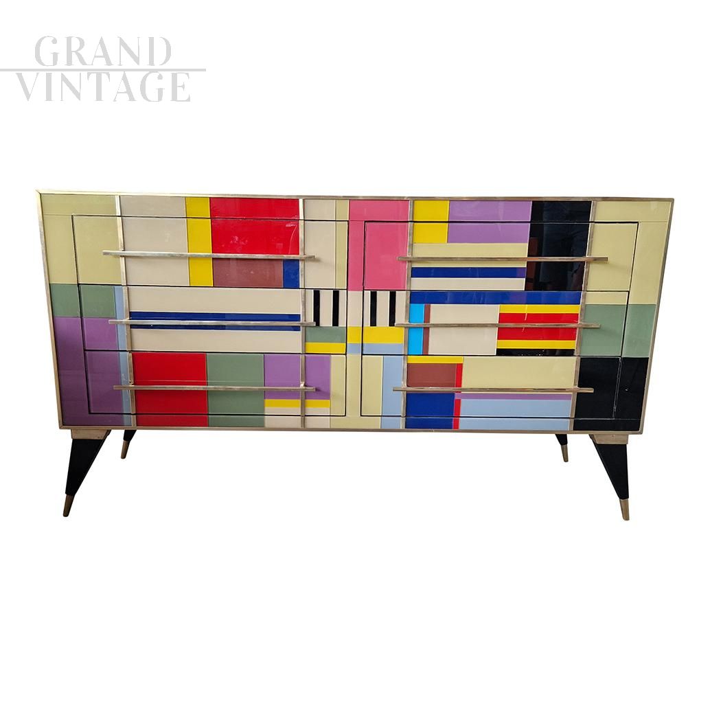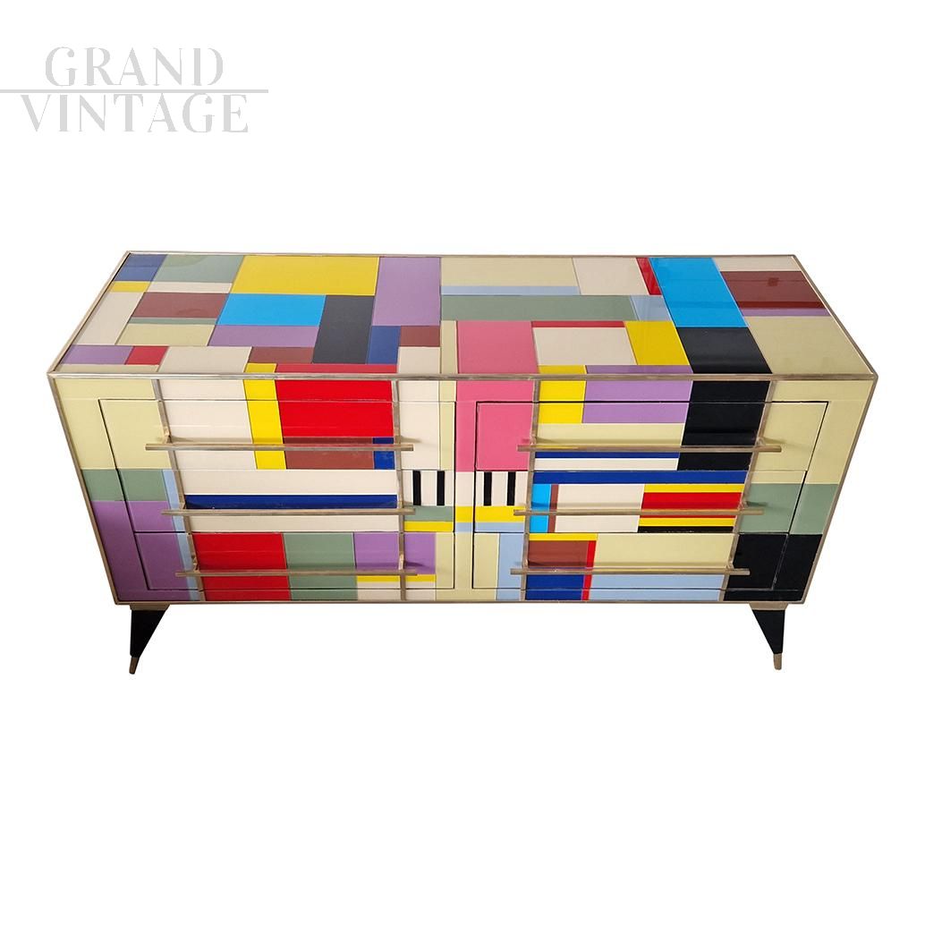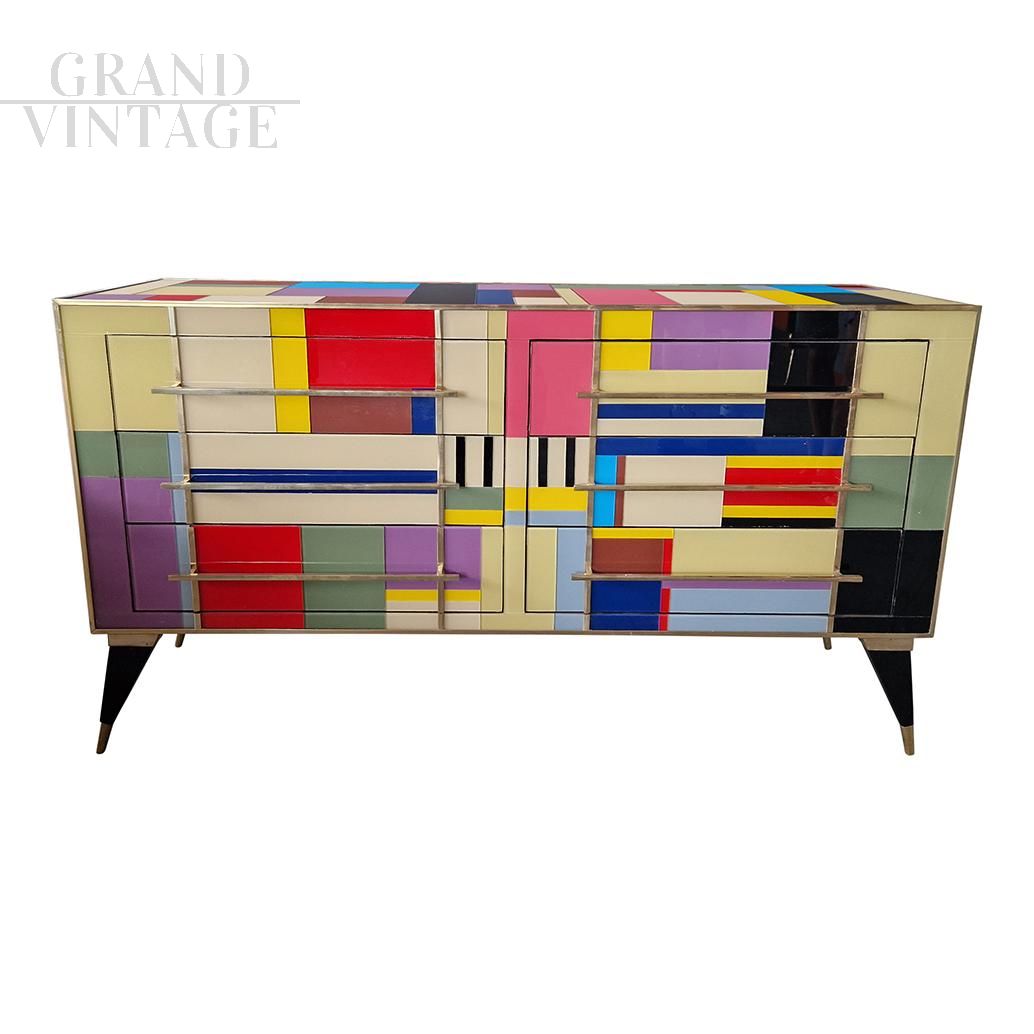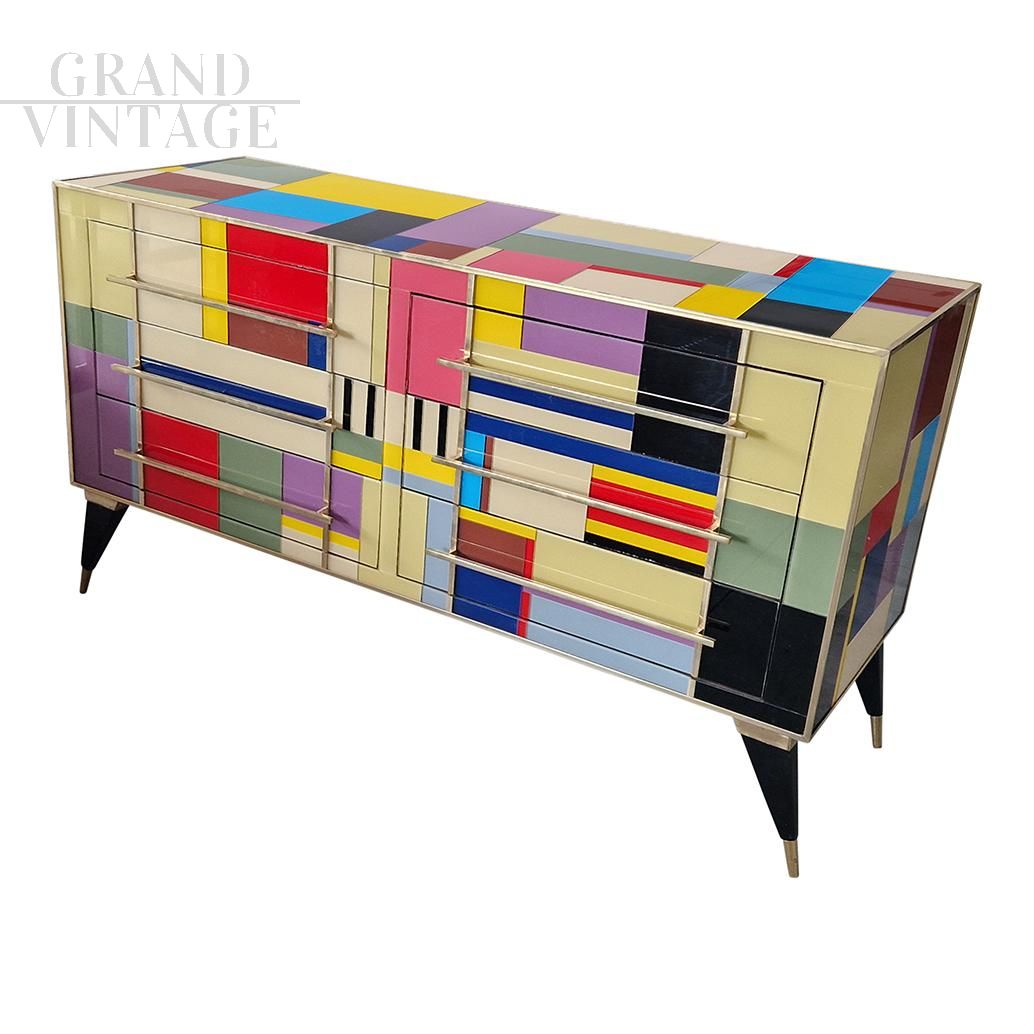 Design chest of drawers in wood covered in multicolored glass, equipped with six drawers, golden brass profiles and geometric feet in black lacquered wood with brass finish.