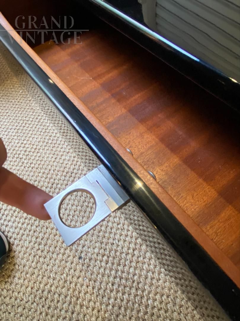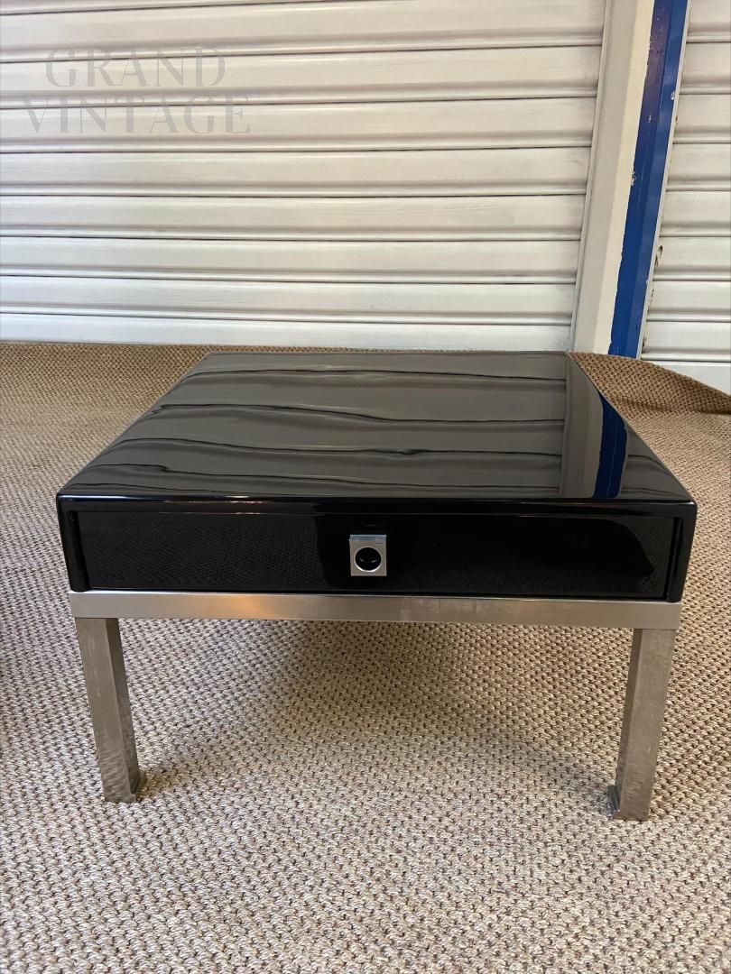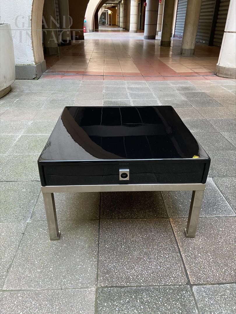Design side table by Guy Lefèvre for Maison Jansen, 1970s, with brushed nickel-plated brass legs and glossy black lacquered wood top. The interior of the drawer is in beautiful mahogany. The coffee table is in perfect condition.