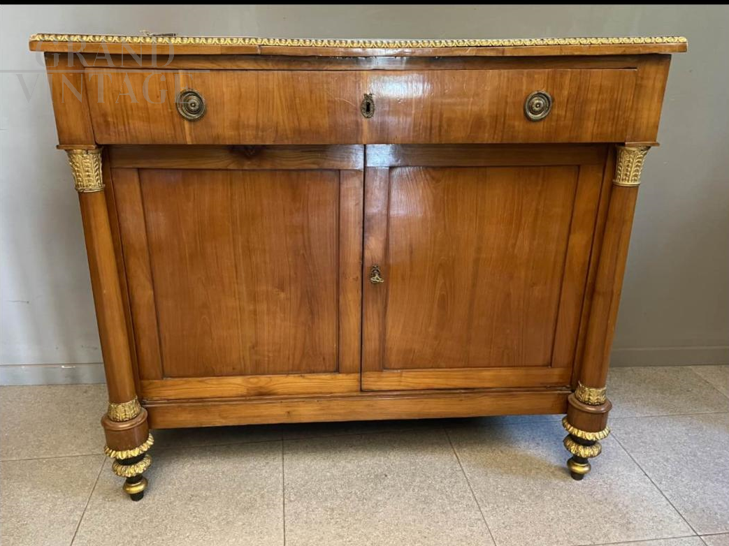 Important antique Lucchese sideboard from the Empire period of the early 19th century in cherry wood, with two doors with internal shelf, protruding drawer, tapered columns with finely carved and gold leaf gilded capitals, ebonized and gilded top-shaped feet.