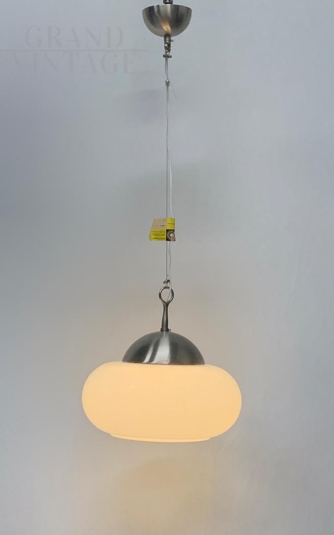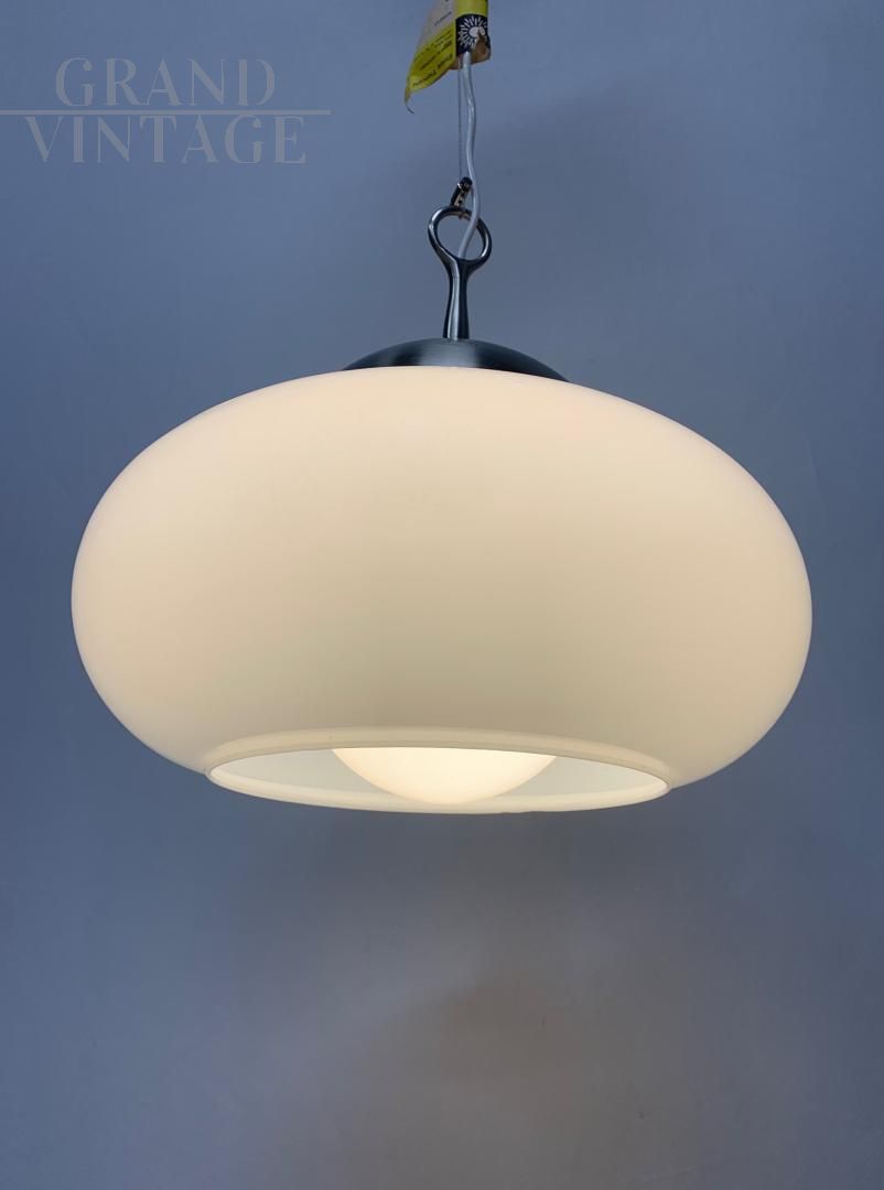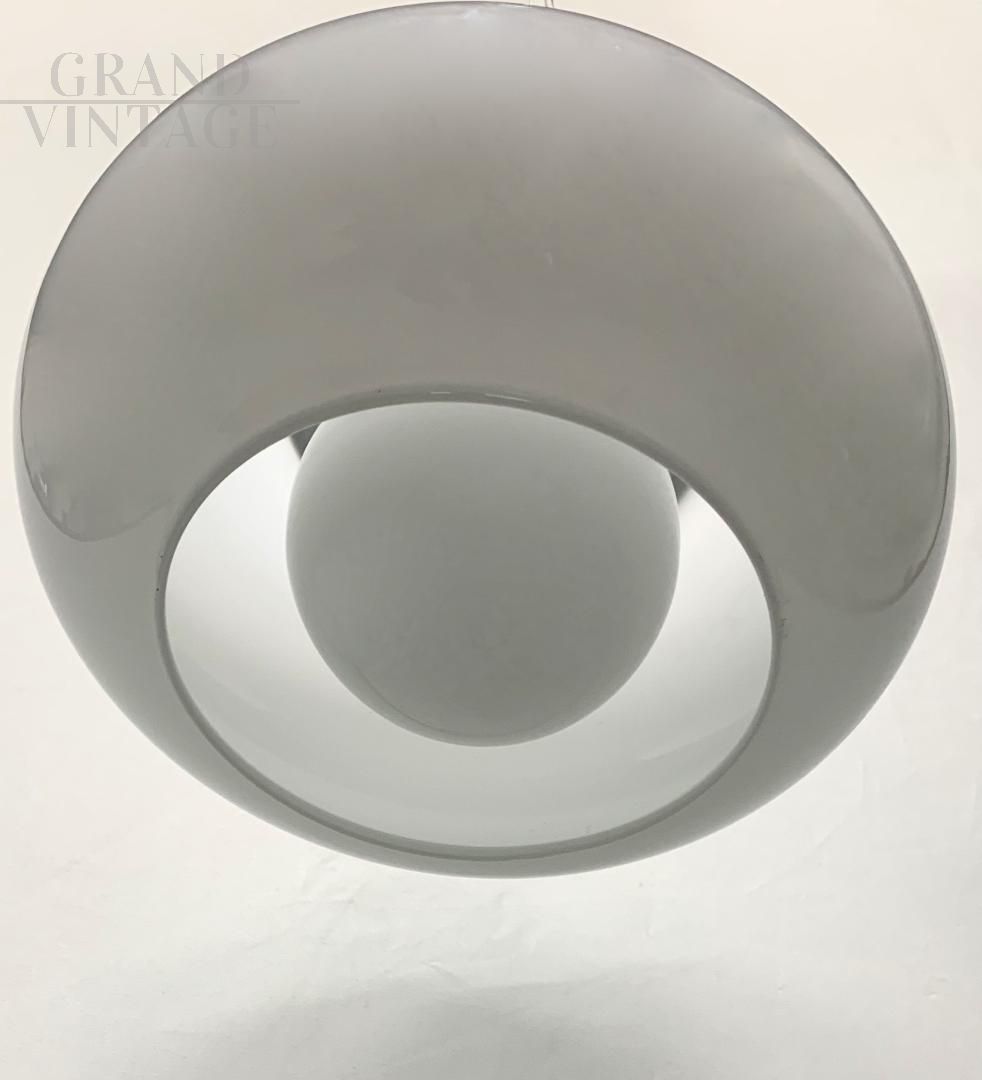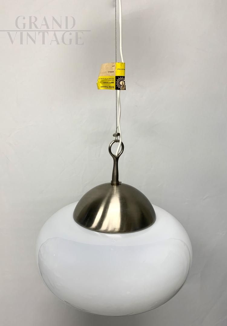 Fantastic and rare Lucifero design chandelier by Maurizio Tronconi, Tronconi company, complete with certification, Italian modern design from the 1960s. The chandelier consists of an external white glass bowl and an internal white glass sphere which contains the light bulb. The structure is in metal with brass details. In excellent condition, the chandelier shows very few signs of aging, the glass is fantastic, hand-moulded, and is not cracked. The chandelier has been restored by applying a new steel wire and a new electrical system, the use of LED bulbs is recommended. It is a rare and very particular piece.