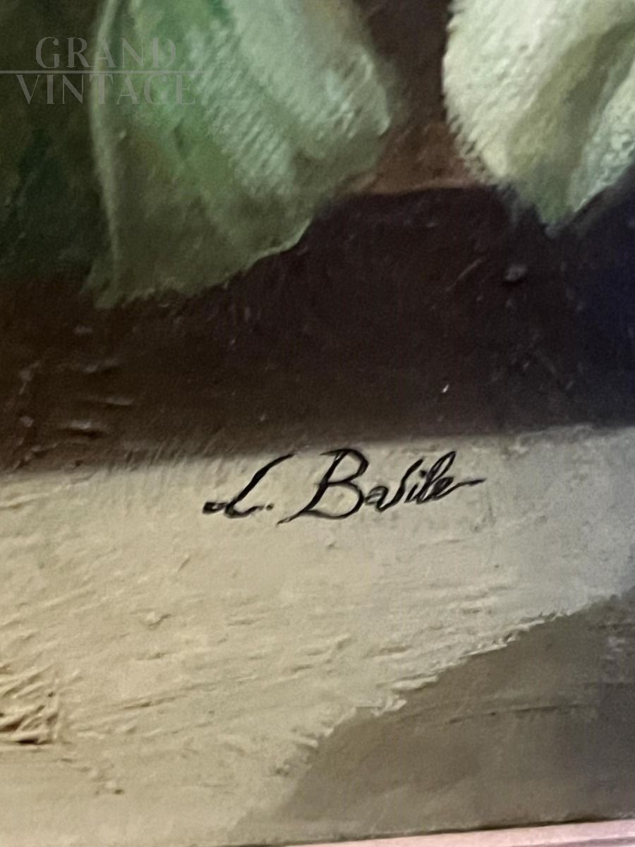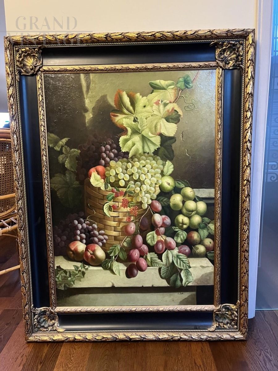 Valuable painting by the artist Luigi Basile created in oil on canvas in the early 1900s and depicting a still life of autumn fruits, in particular bunches of grapes. Nature here is highlighted on this marble colonnade, a basket overflowing with brightly colored and varied fruit. Work signed lower right by the artist, enclosed within a monumental original frame. Painting with certificate of originality and guarantee.