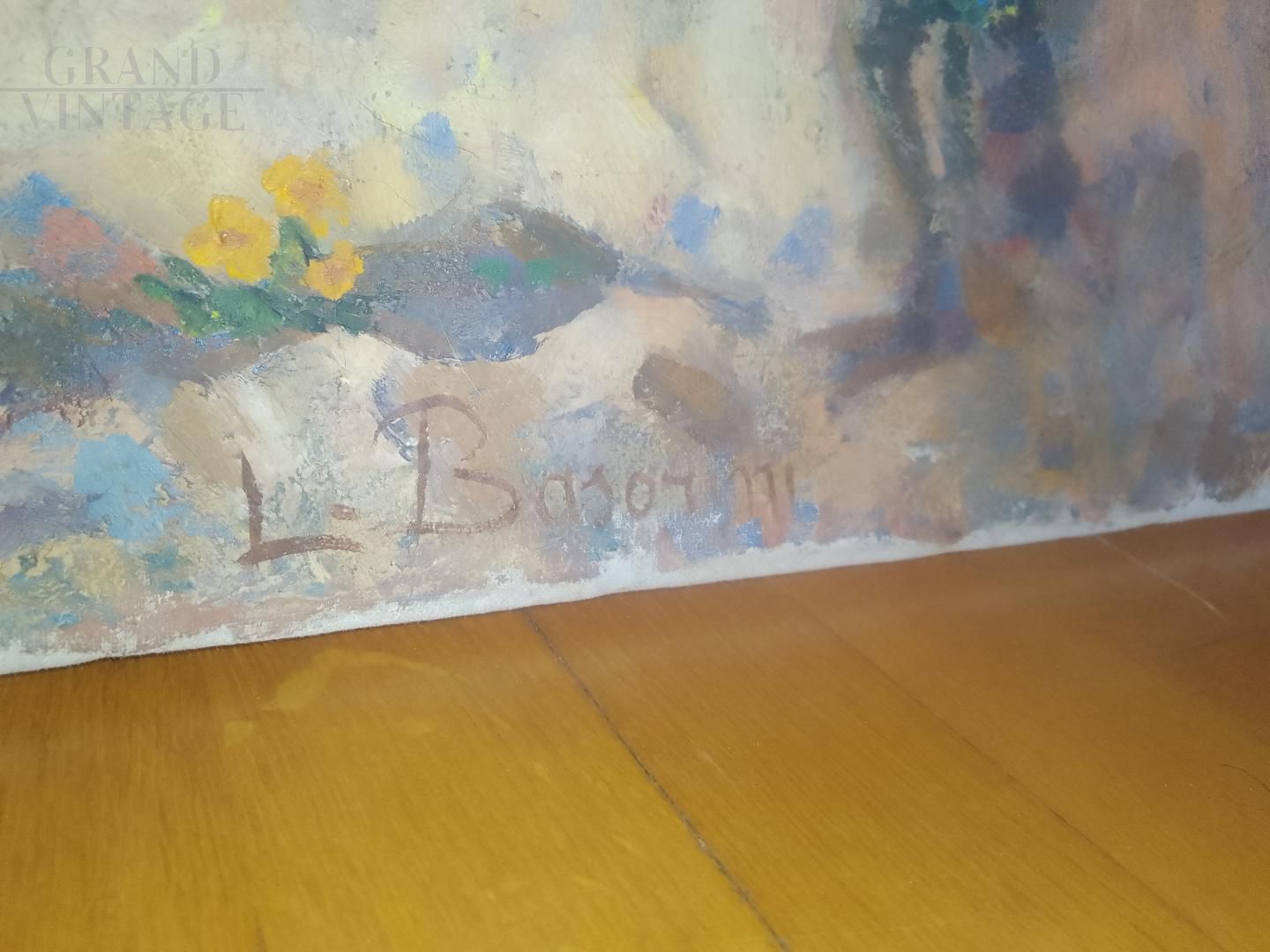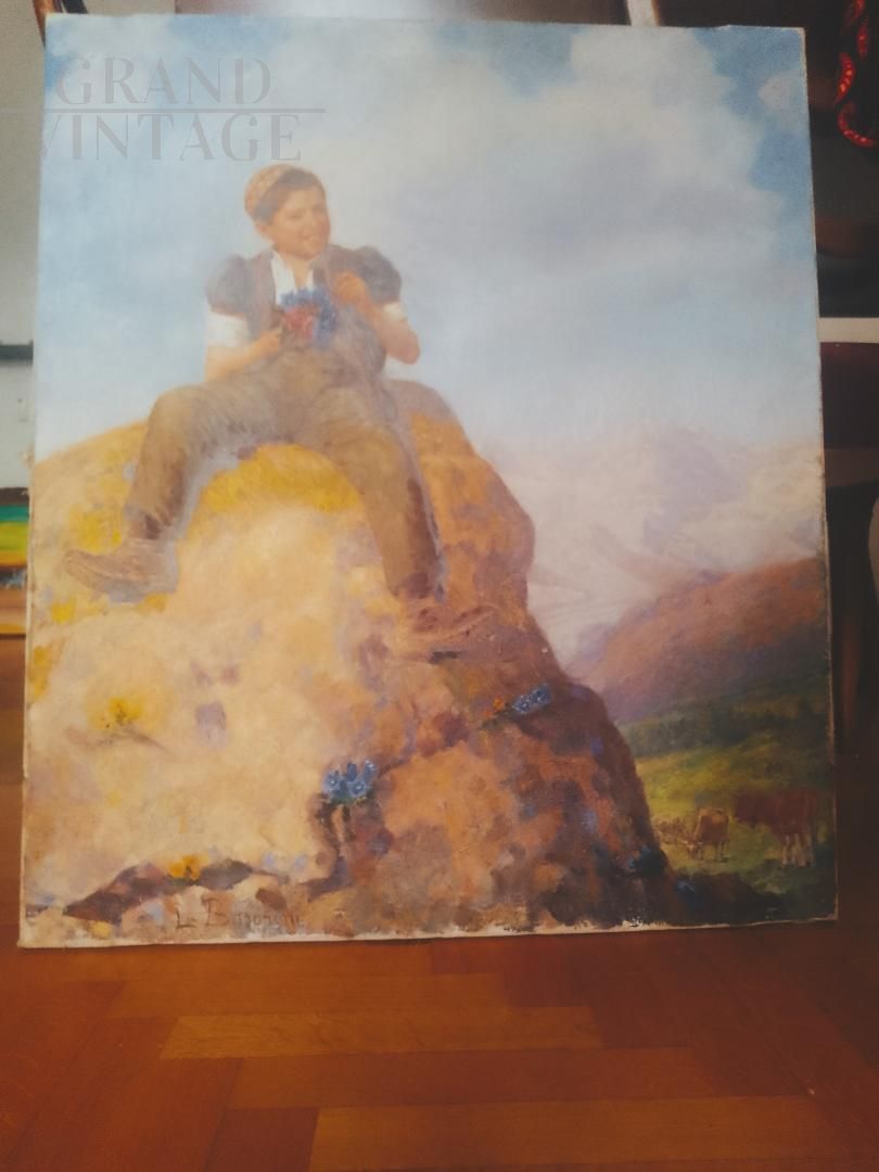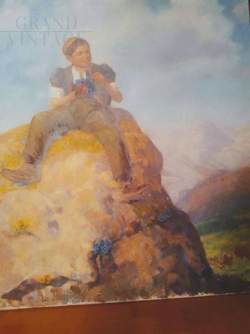 Painting of a boy with a bouquet of flowers in his hand, sitting on a rock in a mountain landscape, signed Luigi Basorini (Bergamo 1876 - 1919) and dated 1905, made with oil technique on canvas measuring 70 x 60 cm.