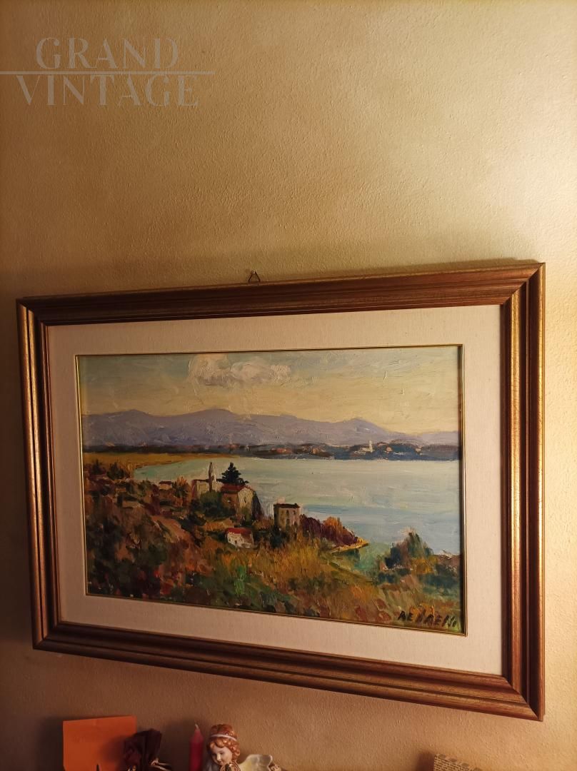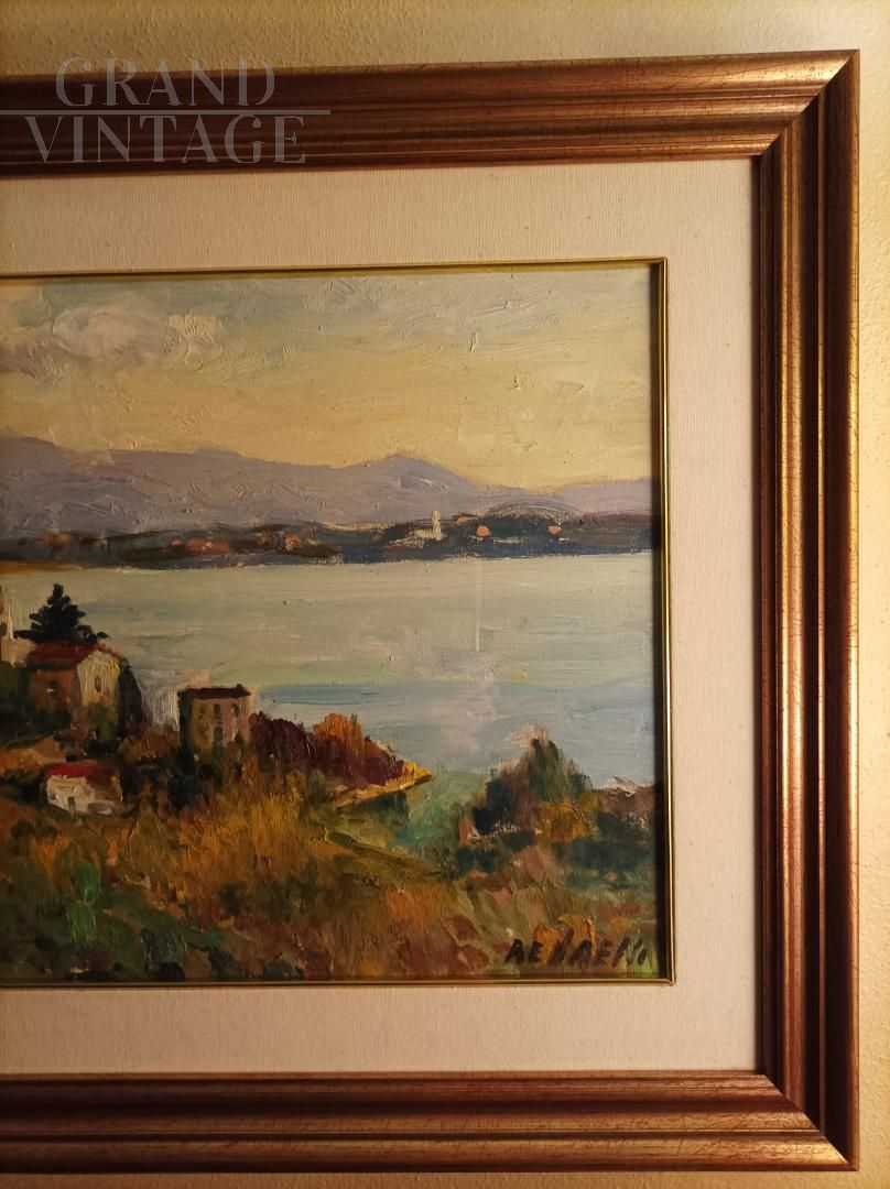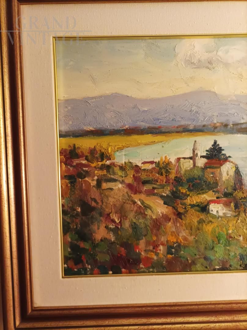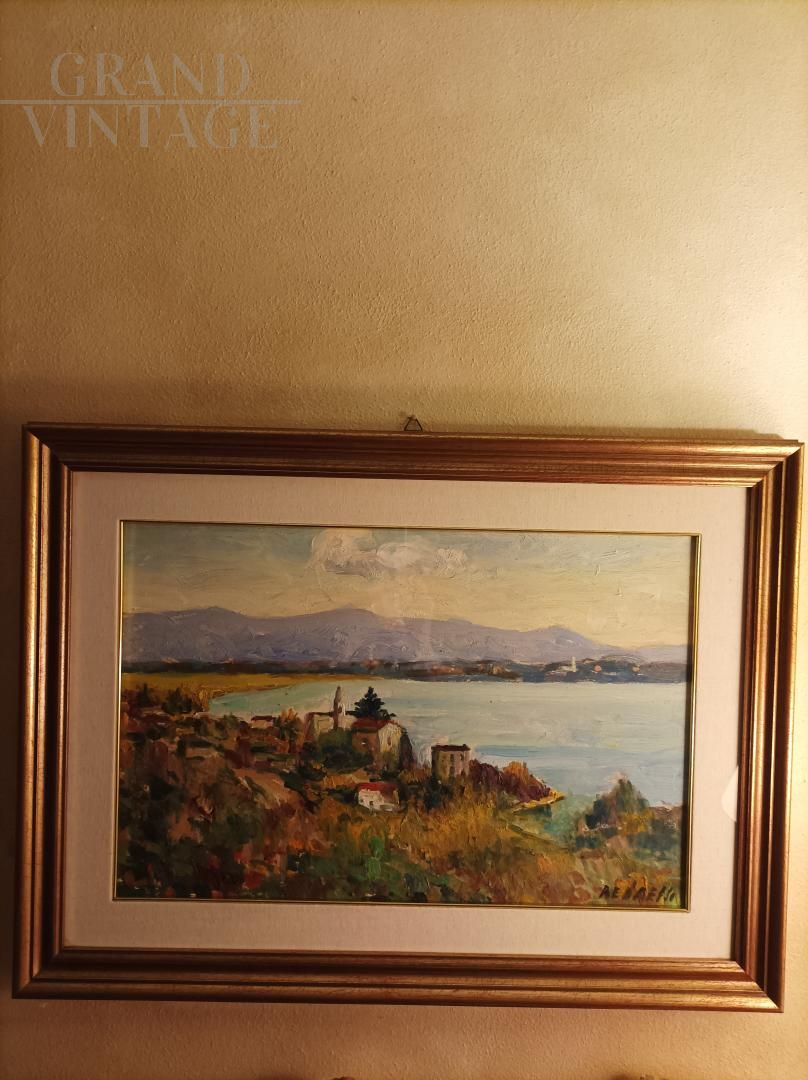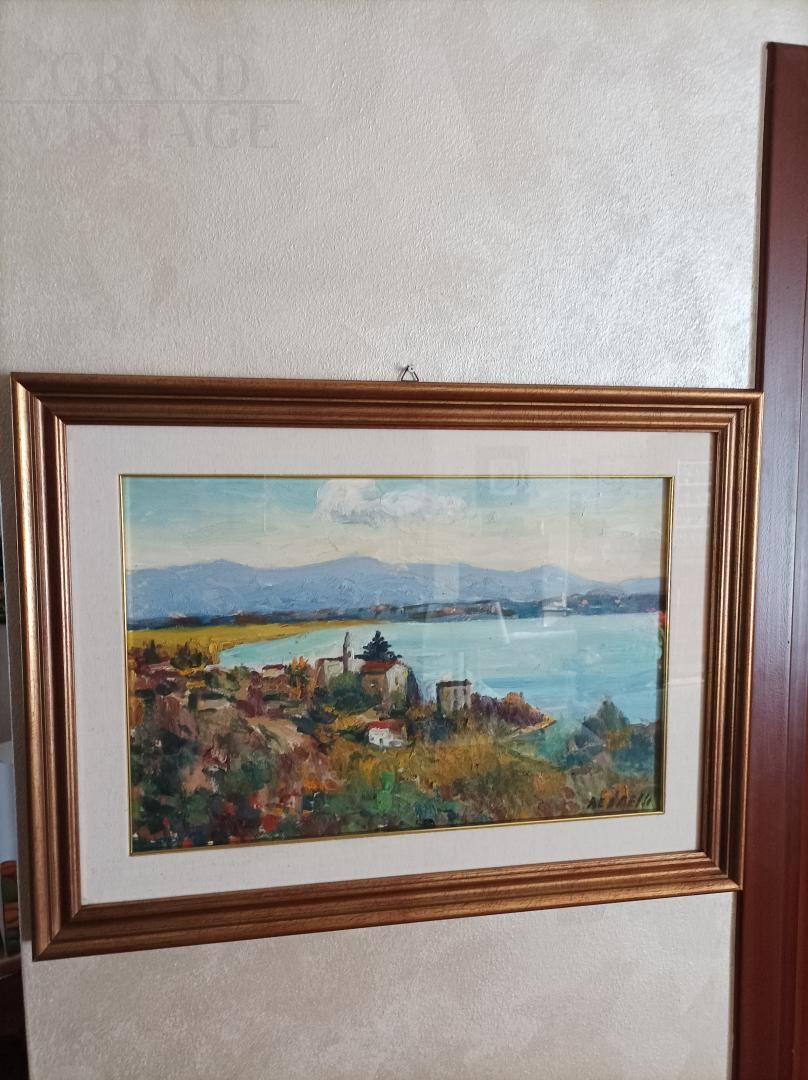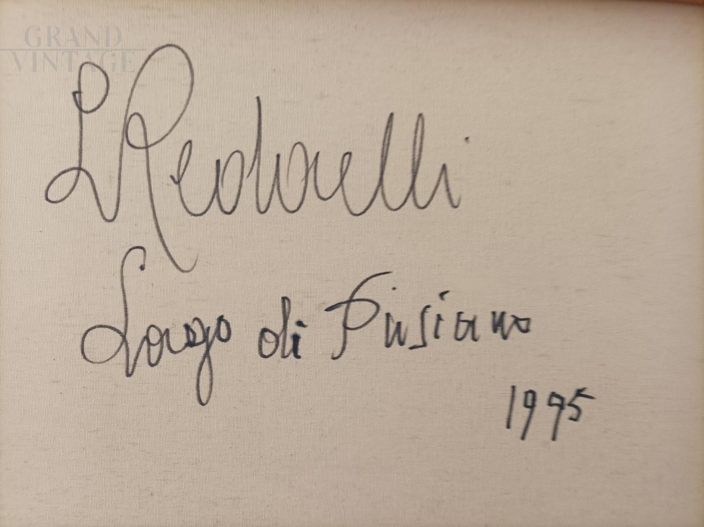 Oil painting on canvas by Luigi Redaelli with a beautiful landscape depicting Lake Pusiano, one of the Briantei lakes in the Italian province of Como.