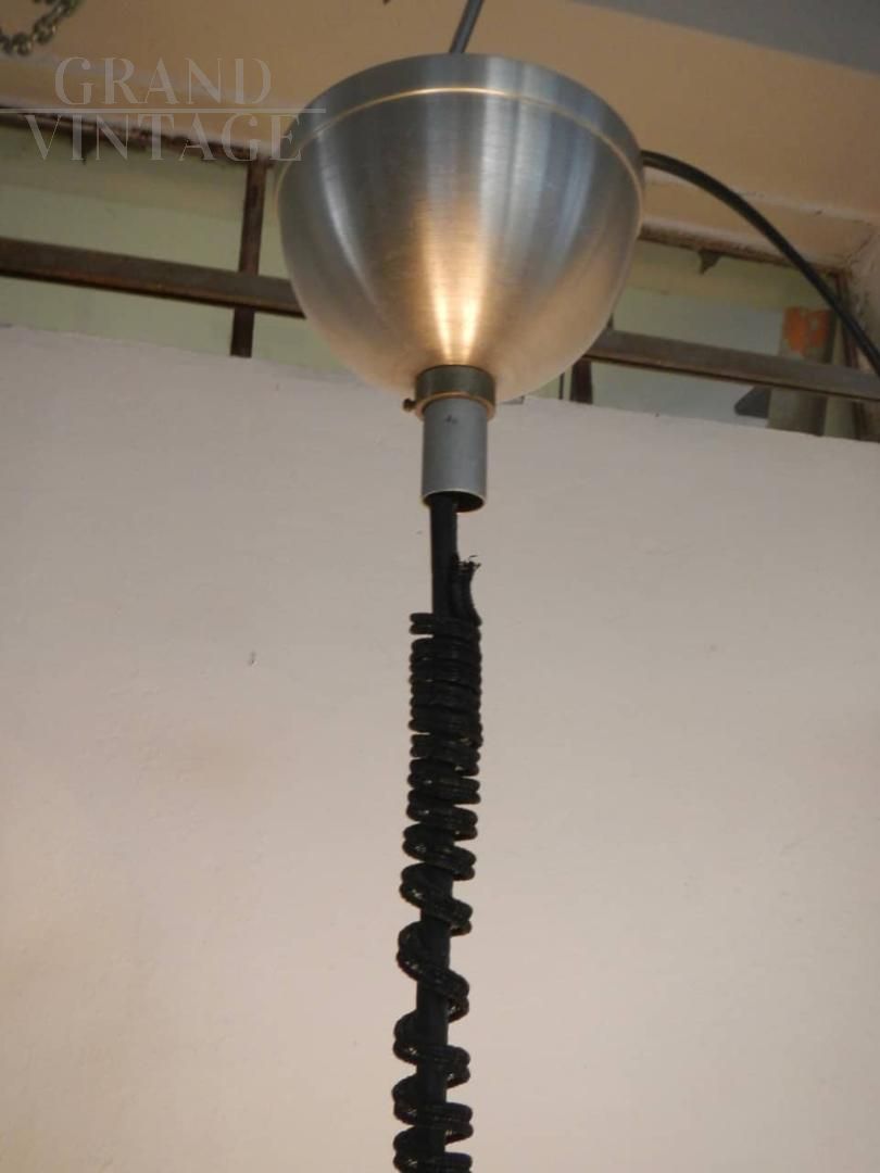 Vintage glass and metal bowl chandelier by Lumi, Italian company, with three lights in the lower part and one light in the upper part, visible trademark guaranteeing originality.