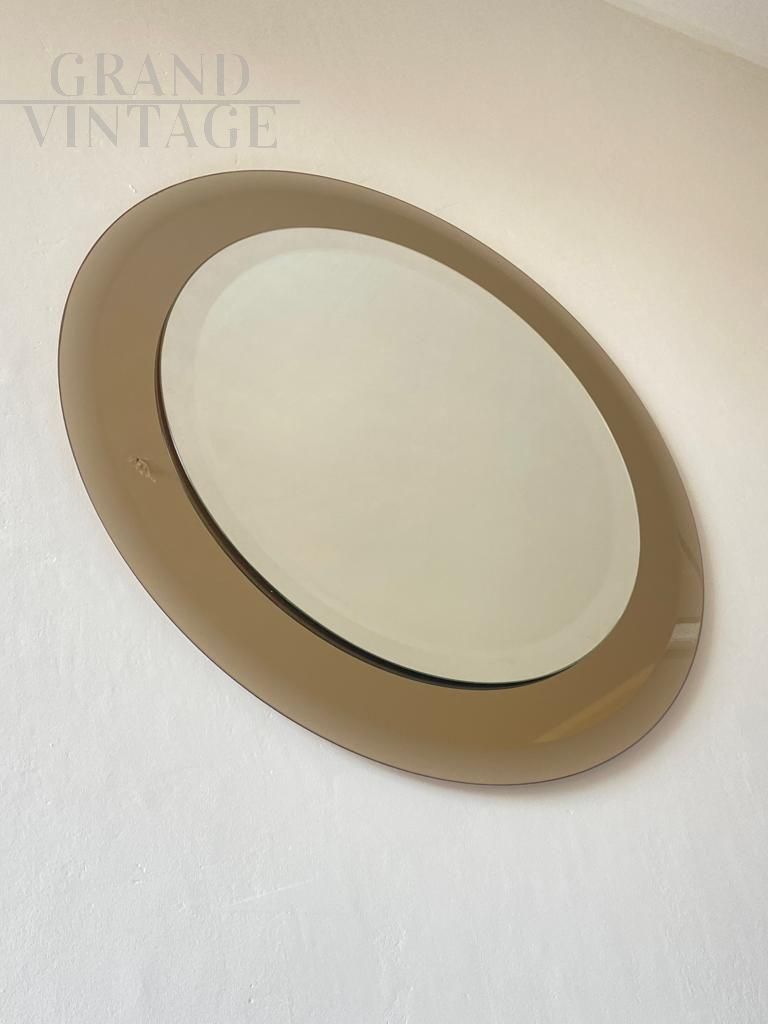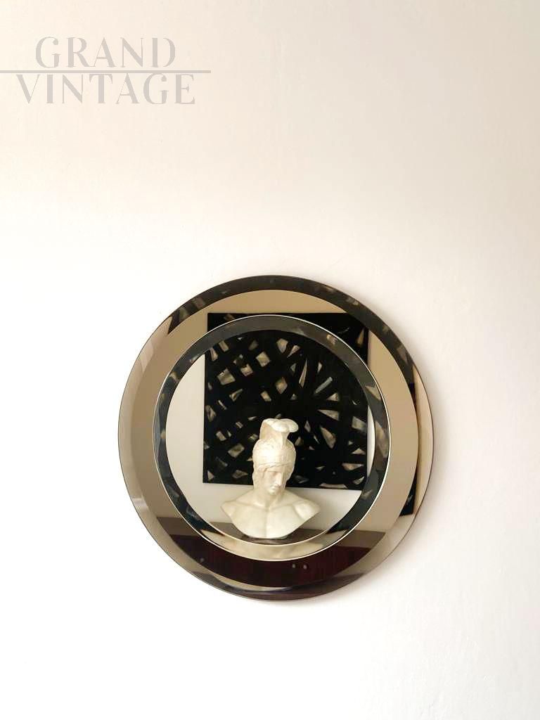 Vintage round mirror by Lupi Cristal Luxor in smoked beveled crystal, Italy 1970s.