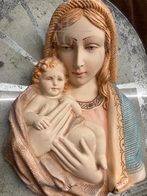 Painted ceramic Madonna with Child bedhead sculpture on a mirrored glass dome-shaped base, from Italy - Tuscany in the 1940s. In good condition, comes from a private collection.