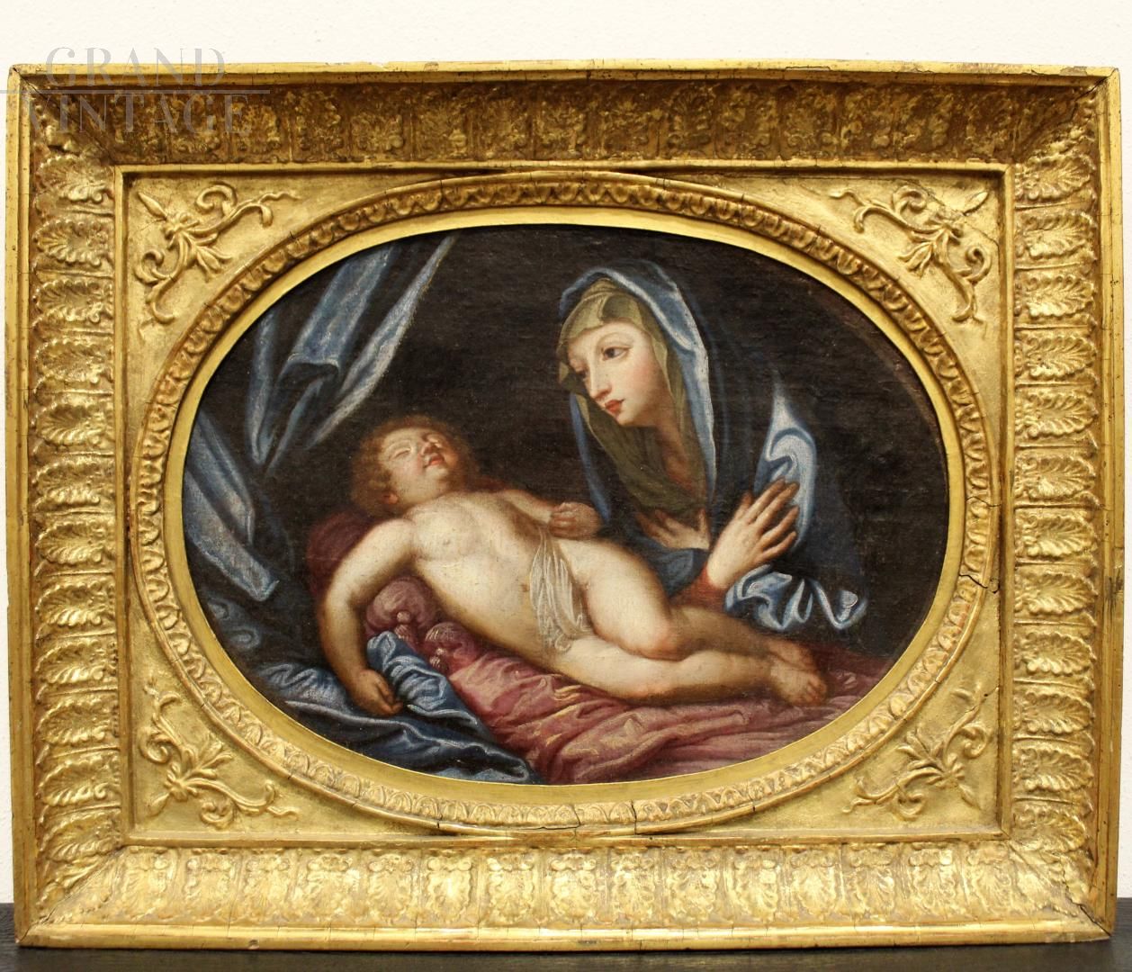 Madonna in adoration of the sleeping Child, oil painting on canvas with gilded frame of the Bolognese school by Guido Reni, second half of the 18th century, Origin: Italy - Emilia Romagna, Bologna. In perfect condition.