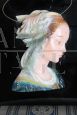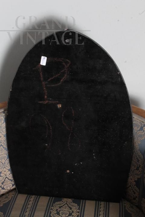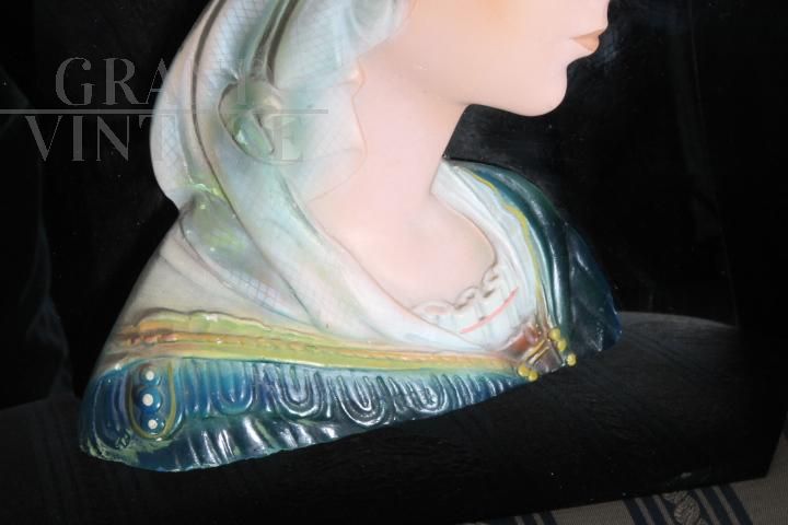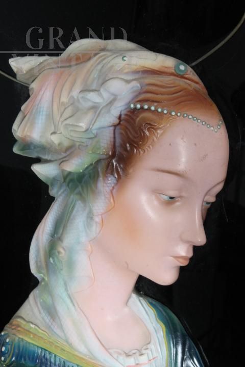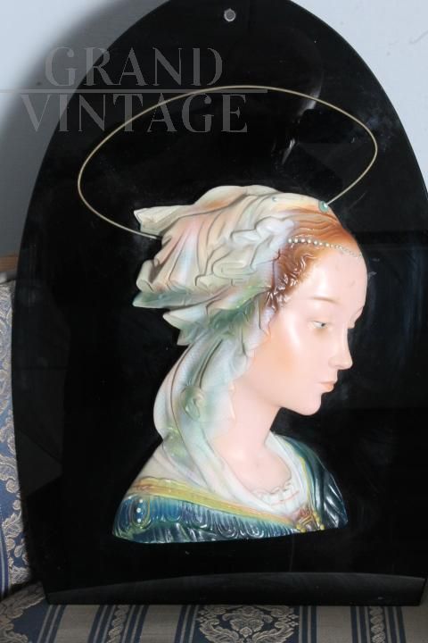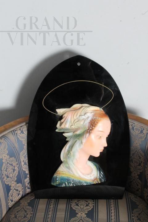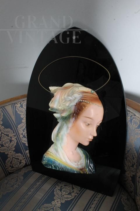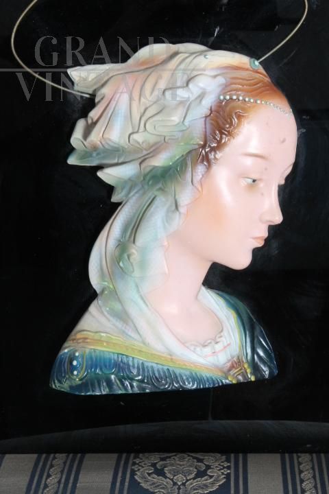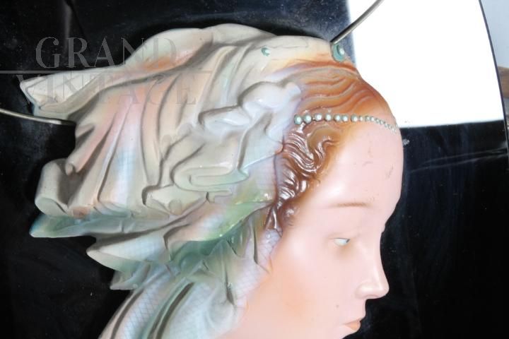 Madonna sculpture in painted terracotta on black glass, 1940s art deco