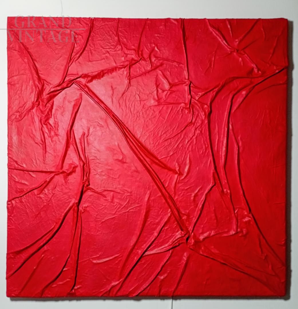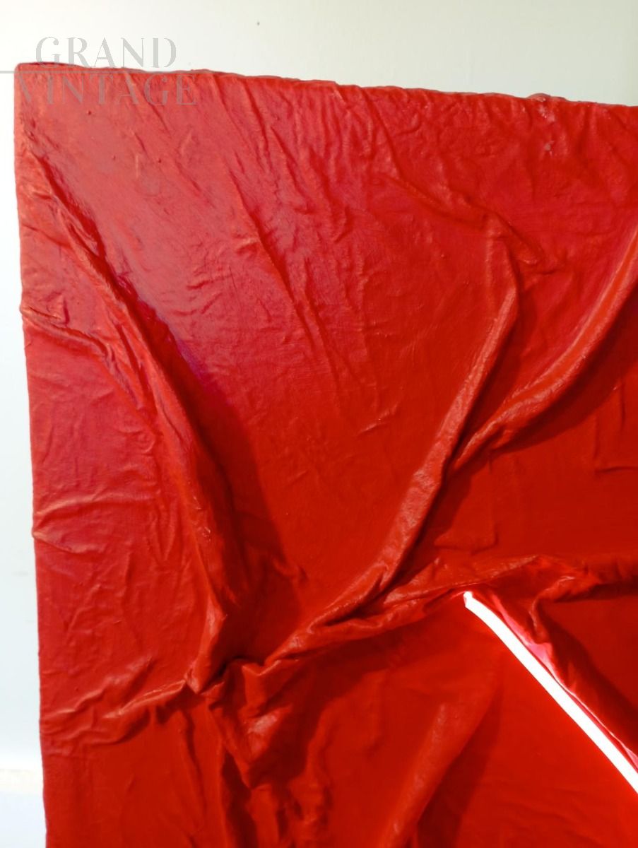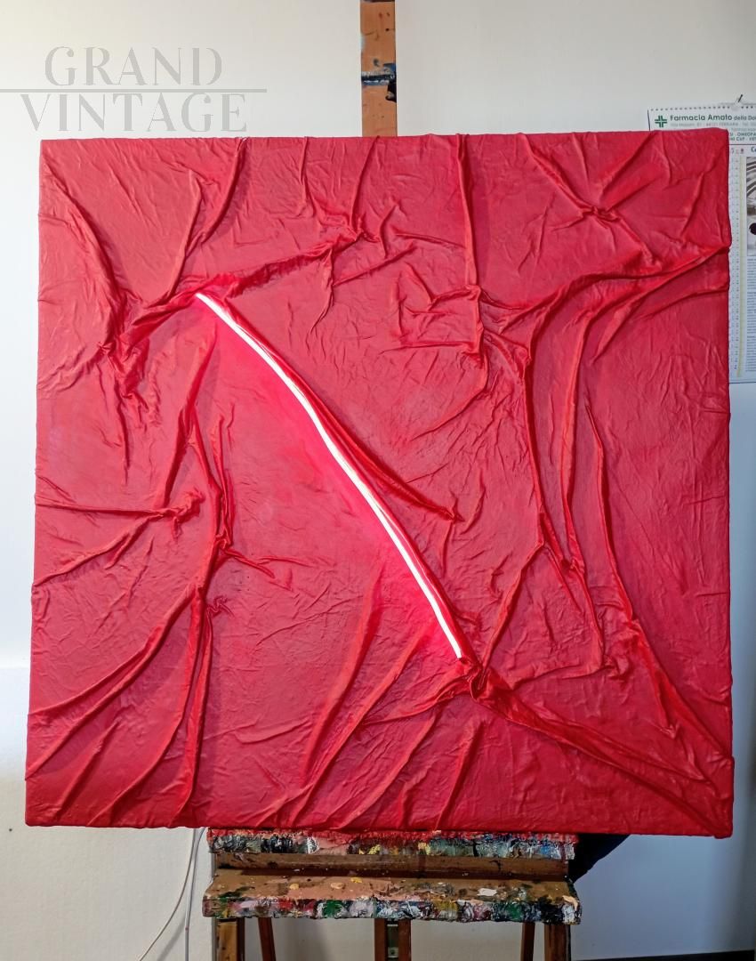 Contemporary abstract painting with mixed media on canvas with pigments and resins entitled Manzoni 4.0, made by Rolando Pellini in a beautiful bright red color with 220 volt LED lighting, 4 m power cable included.