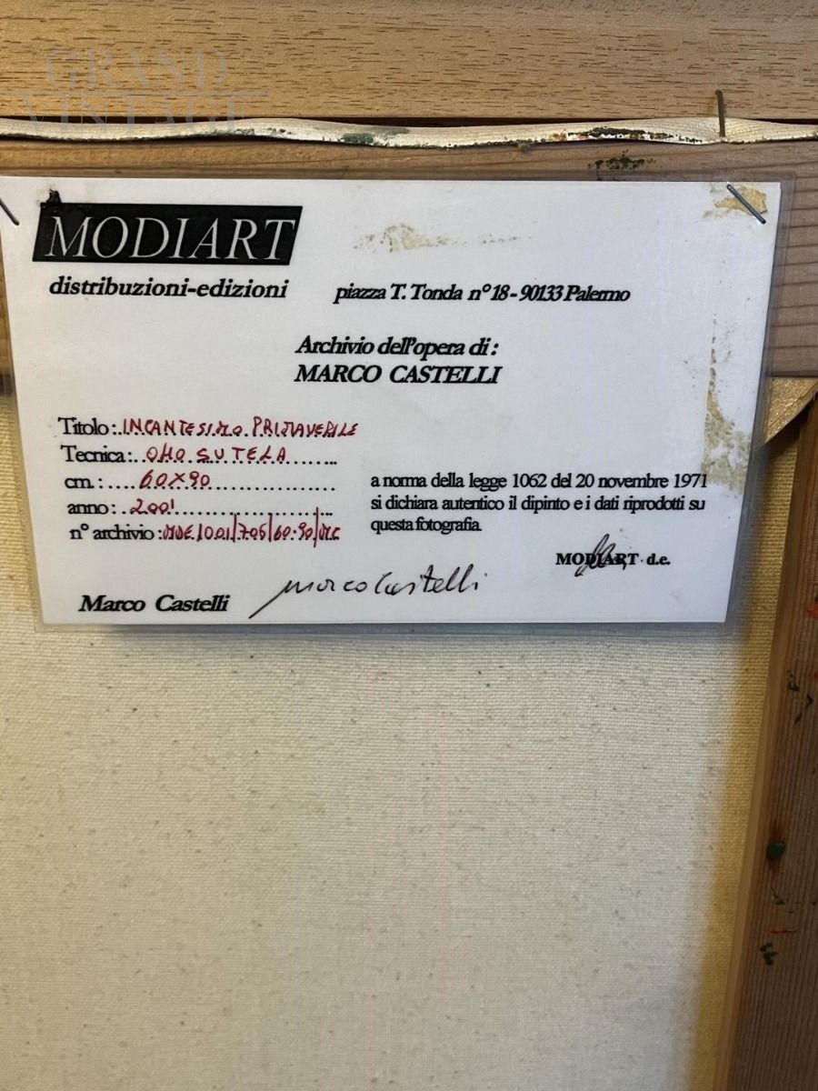 Oil painting on canvas by Marco Castelli in 2001, entitled Spring Incantesimo. A work full of colors and light, a perched village, almost fairytale-like, surrounded by the nature of flowering trees and distant mountains with still snow-capped peaks. An ideal painting to decorate any type of environment, with a fine golden frame. Work signed on the back by the same artist, with certificate of originality.