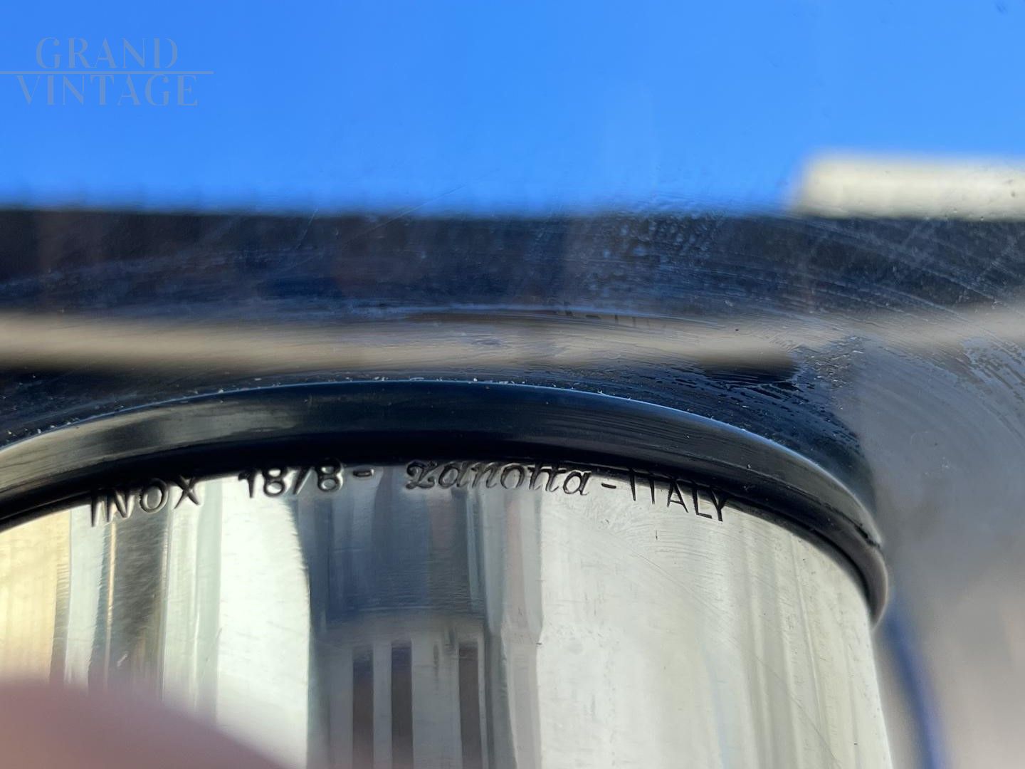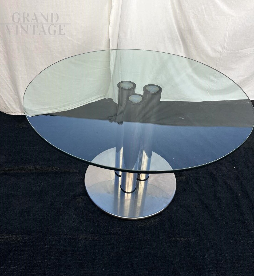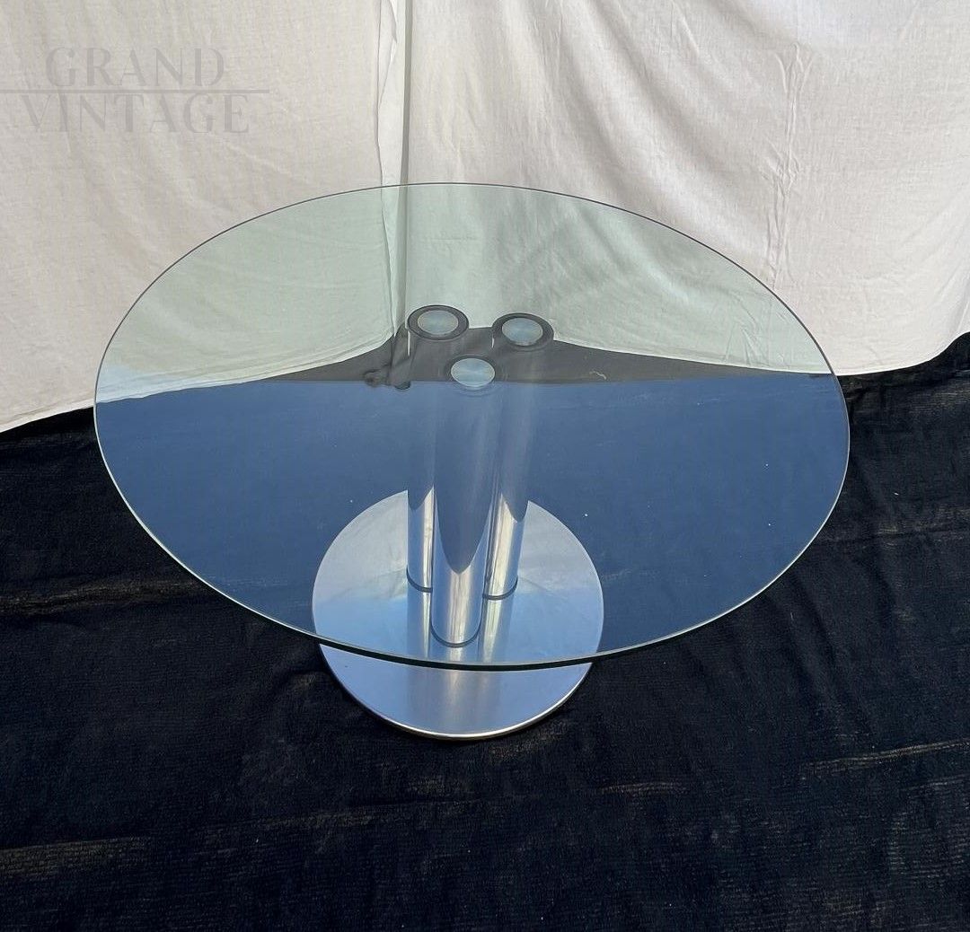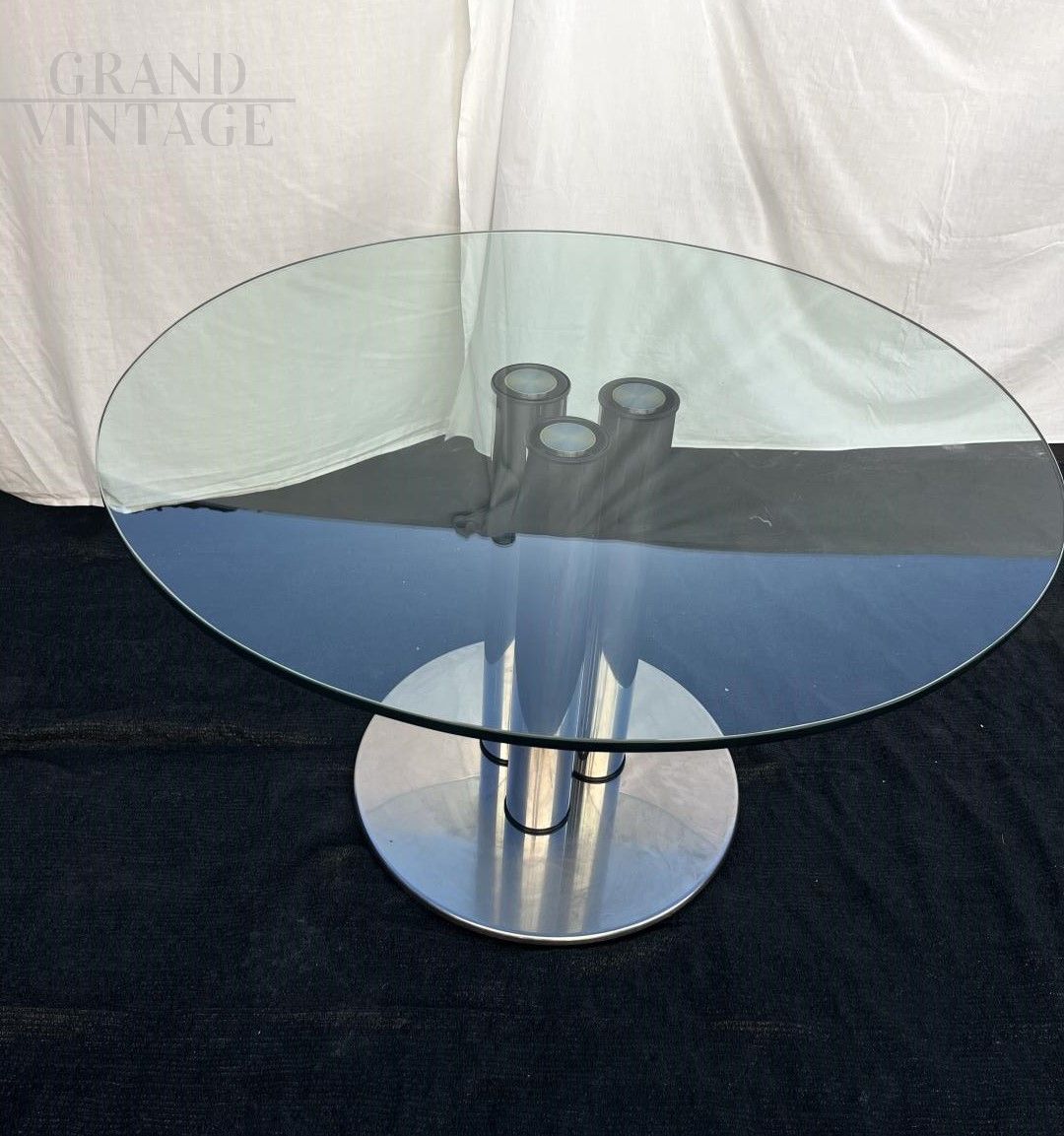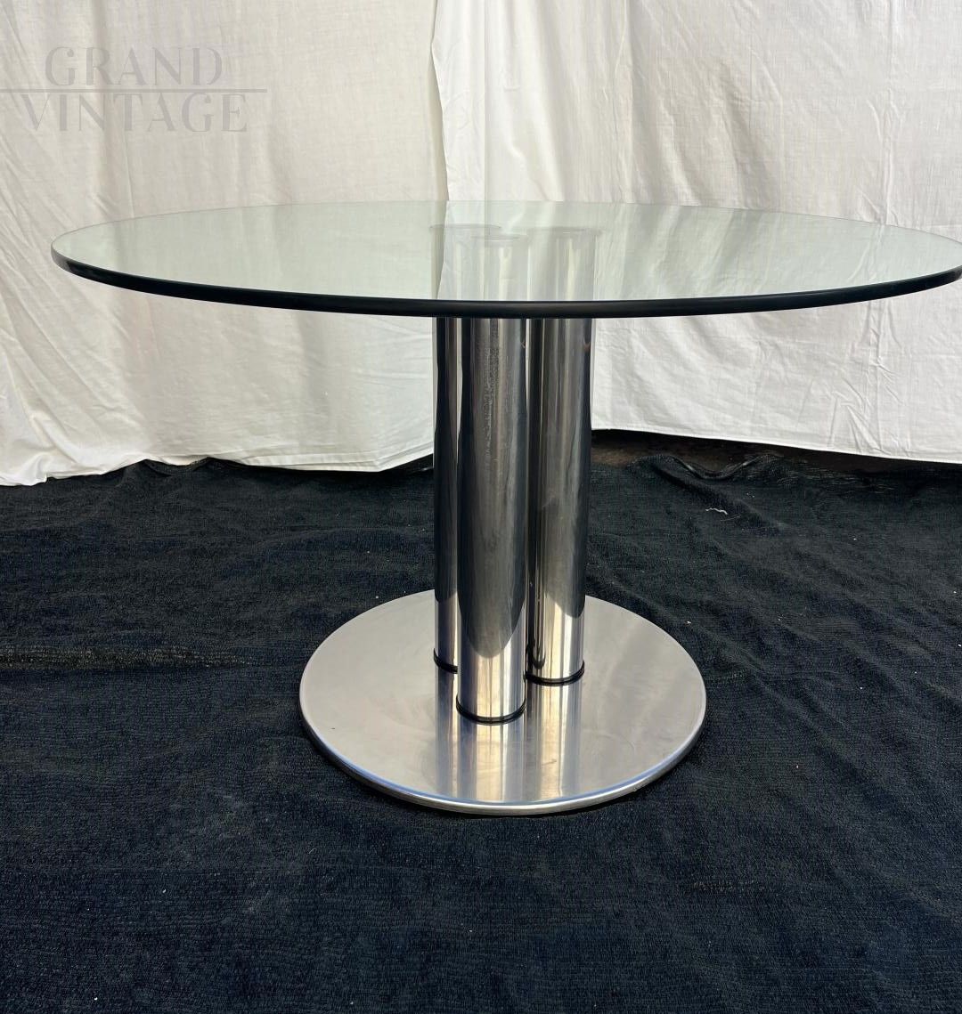 Marcuso design table by Marco Zanuso for Zanotta with round glass top and steel structure.