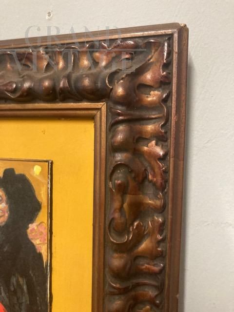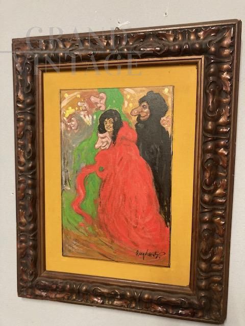 Antique painting depicting Masks, oil on cardboard from the 1920s, signed lower right, dated on the back with dedication.