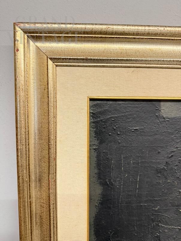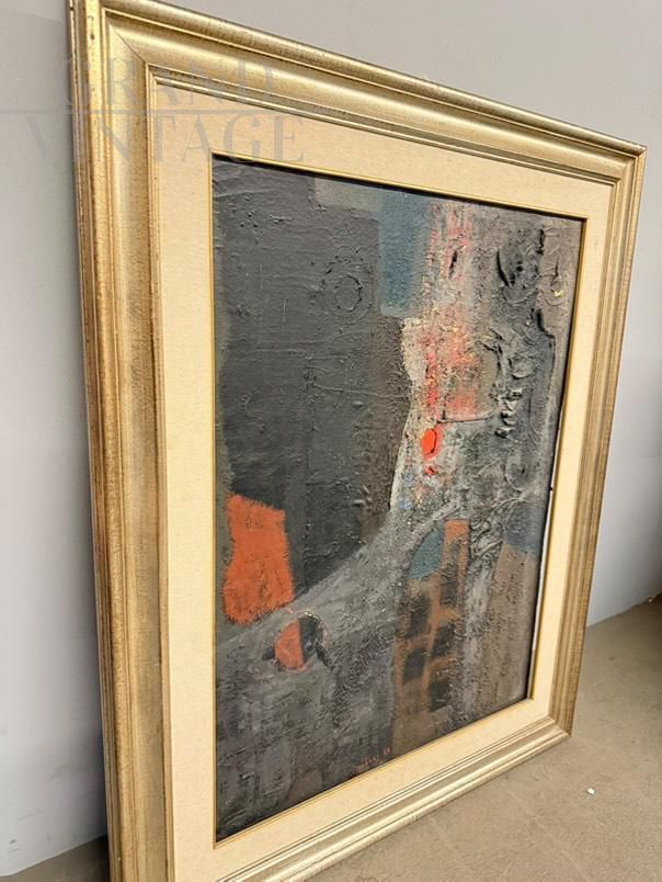 Dipinto di arte moderna in smalti policromi su tela, opera dell'artista Roberto Moroni dal titolo Material World, realizzata del 1968 e completa di firma e appunti personali sul retro, in ottimo stato. Misure: 80 x 60 cm.