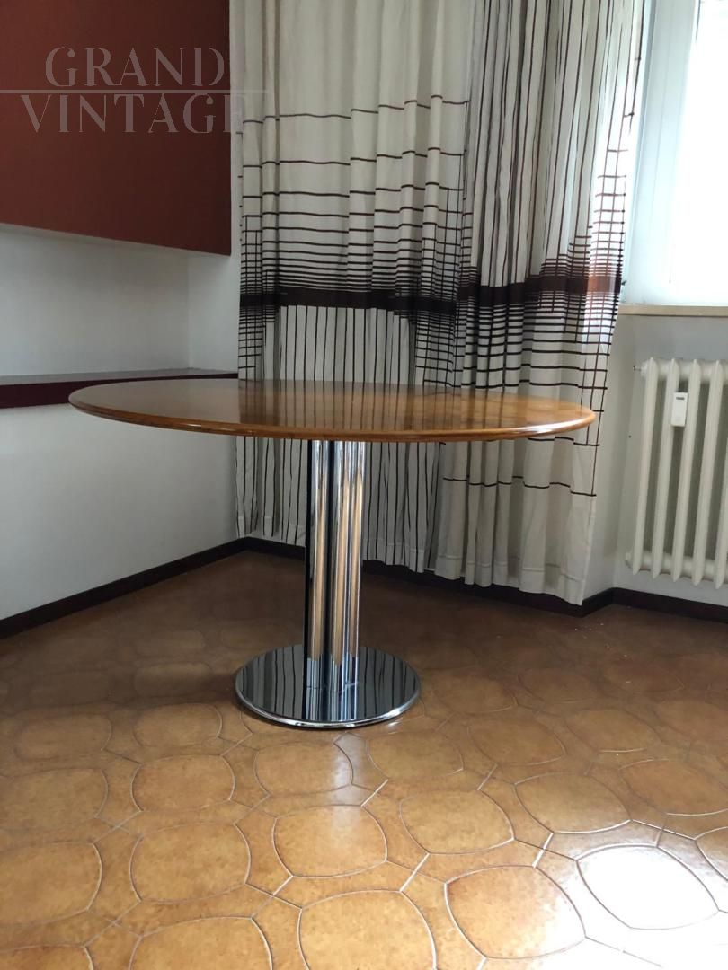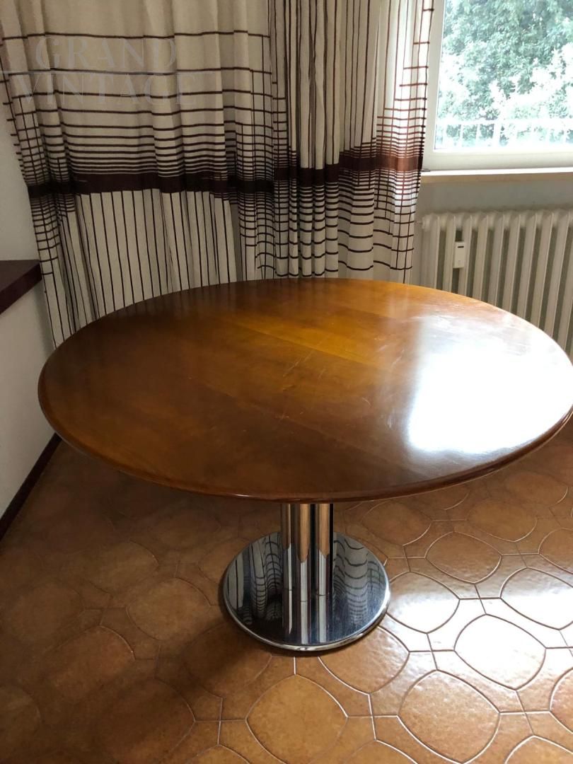 Vintage round Maxine model table with steel structure and walnut top with a diameter of 120 cm, reminiscent of the Marcuso model by Zanotta or the Esse model by Acerbis, in good condition. The base has a diameter of 44 cm. We recommend purchasing combined with the set of Castiglia chairs by Zanotta, purchased together. Click here to see the chairs!