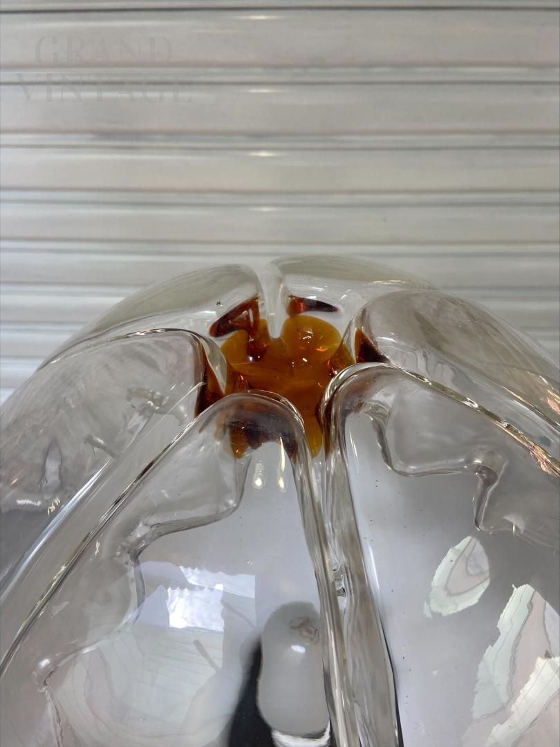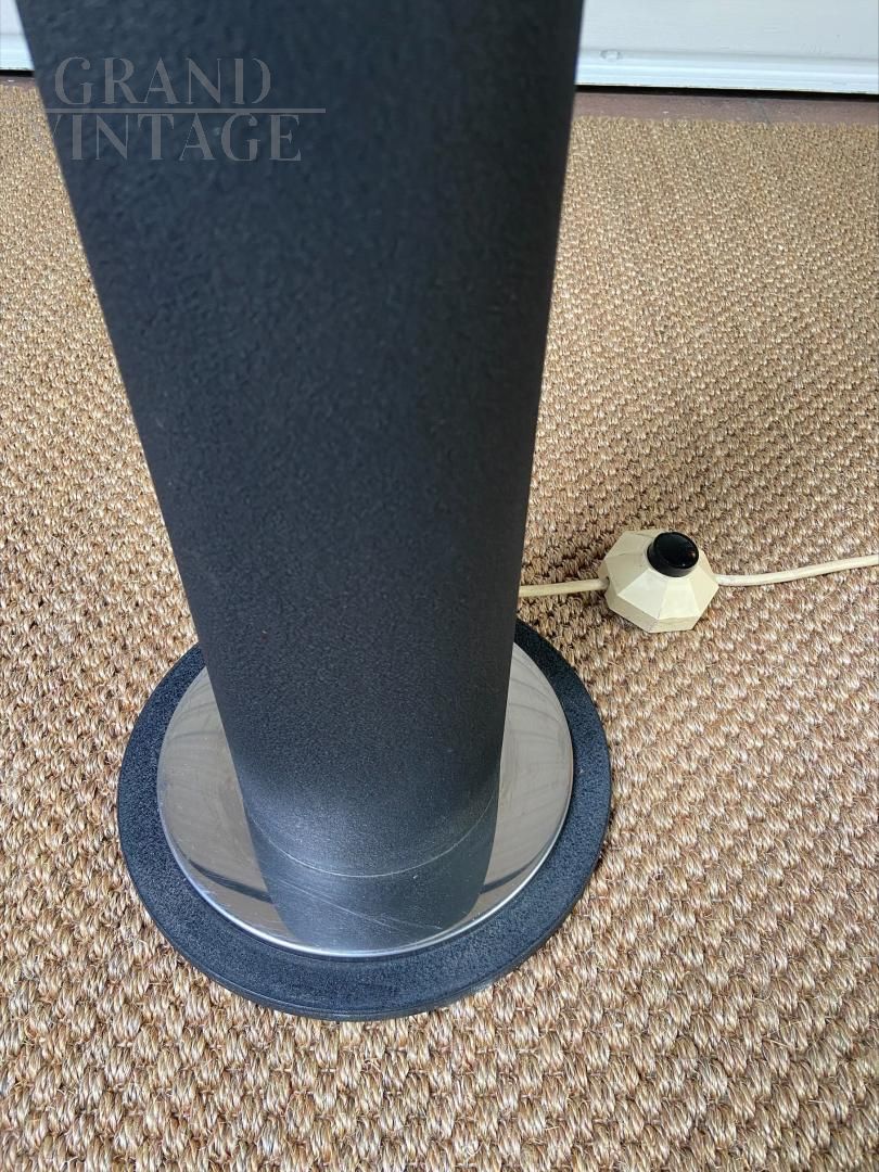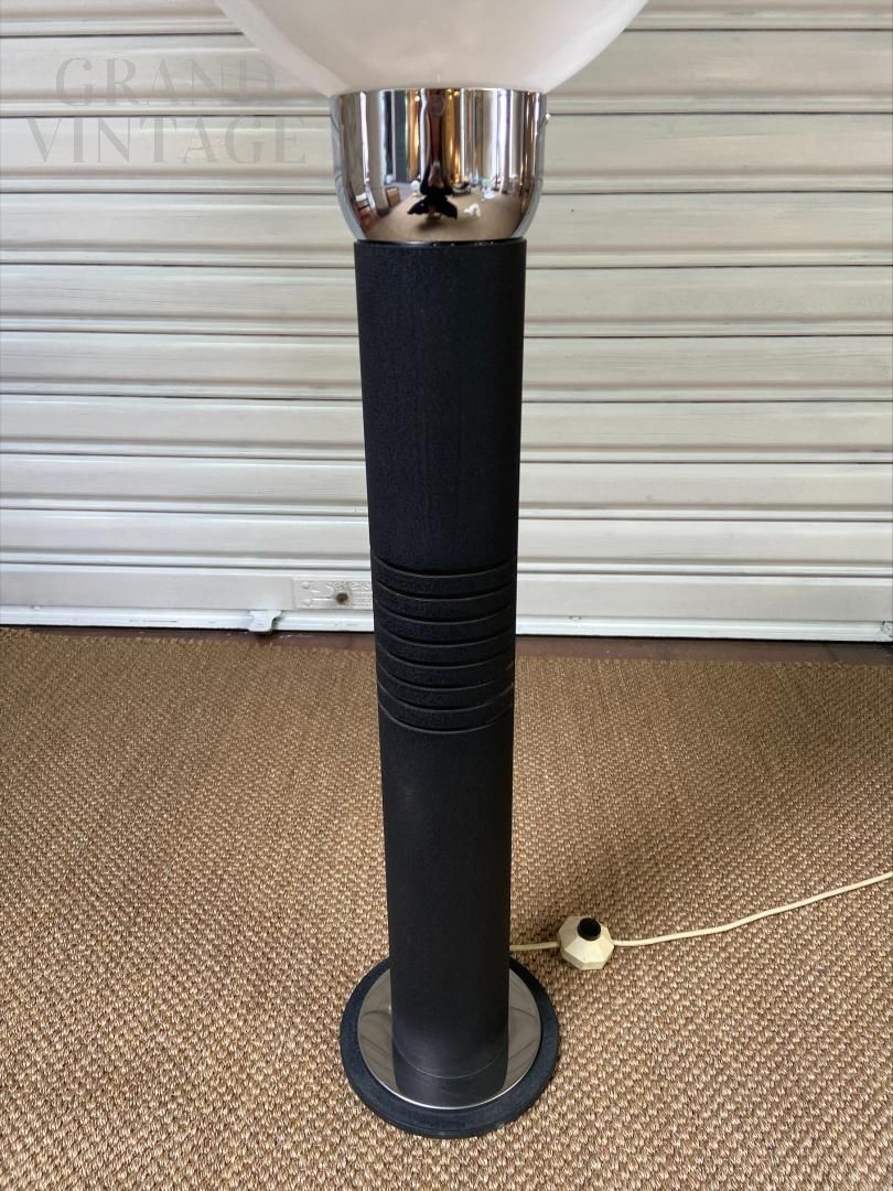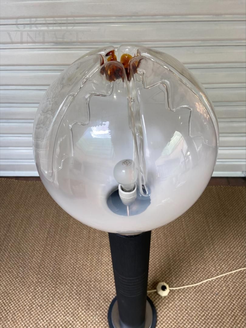 Mazzega 70s floor lamp with Murano glass sphere lampshade and black lacquered metal structure with cuts in the stem, from which the light comes out from the inside, creating a very particular effect.