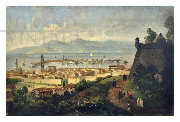 Painting by E. Ferrante depicting the port of Messina, it is inspired by the great masters of the Posillipo School, including Anton Sminck van Pitloo and Giacinto Gigante, who used the Navy as a subject to portray an idyllic landscape. In the painting we admire a marine view of Messina with a large tower placed in the south-east corner of the fortress, entirely surrounded by the sea, a classical and Mediterranean sunshine that breathes from the history and nature of the Italian landscape.