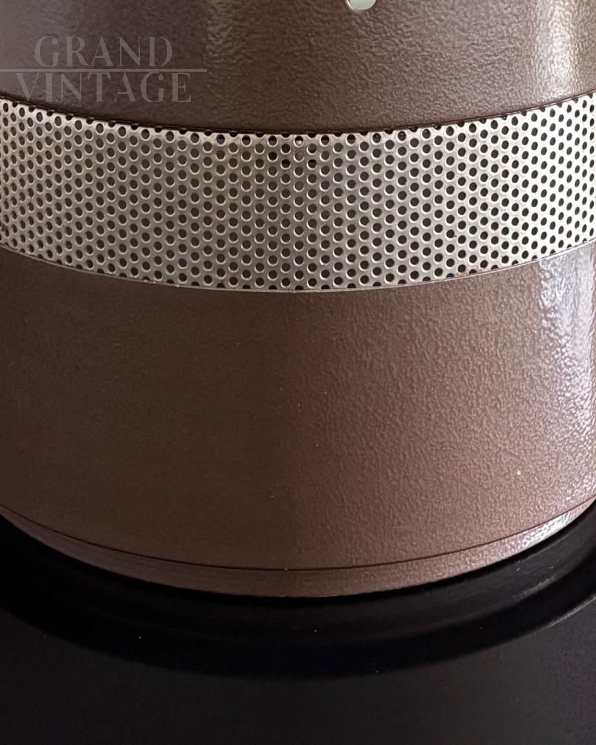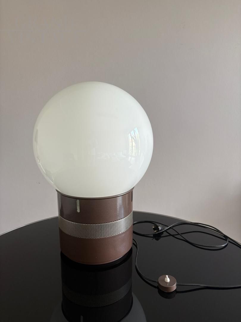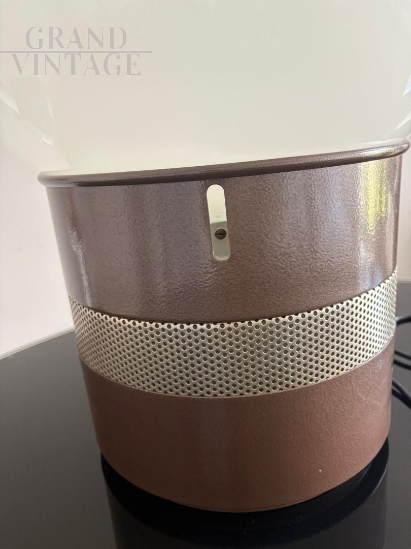 Mezzo Oracolo - Half Oracle table lamp by Gae Aulenti for Artemide, a 1960s Italian mid-century design icon. The brown lacquered metal frame with perforated steel elements pairs with a spherical white opal glass diffuser that emits a warm, soft light. The effect is magical: the base emits an internal light that creates a warm atmosphere, ideal for modern or vintage spaces.