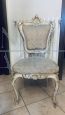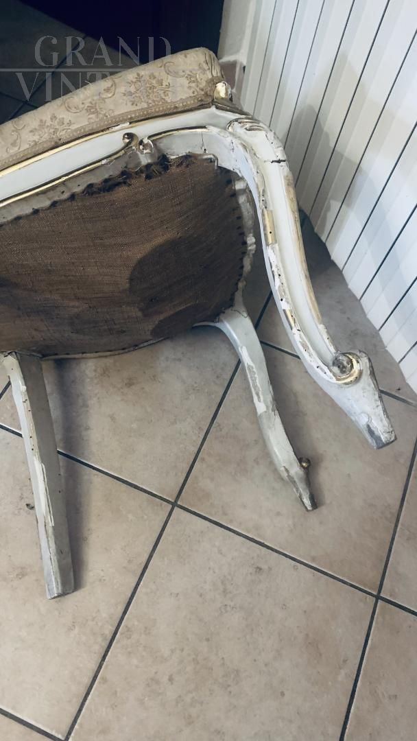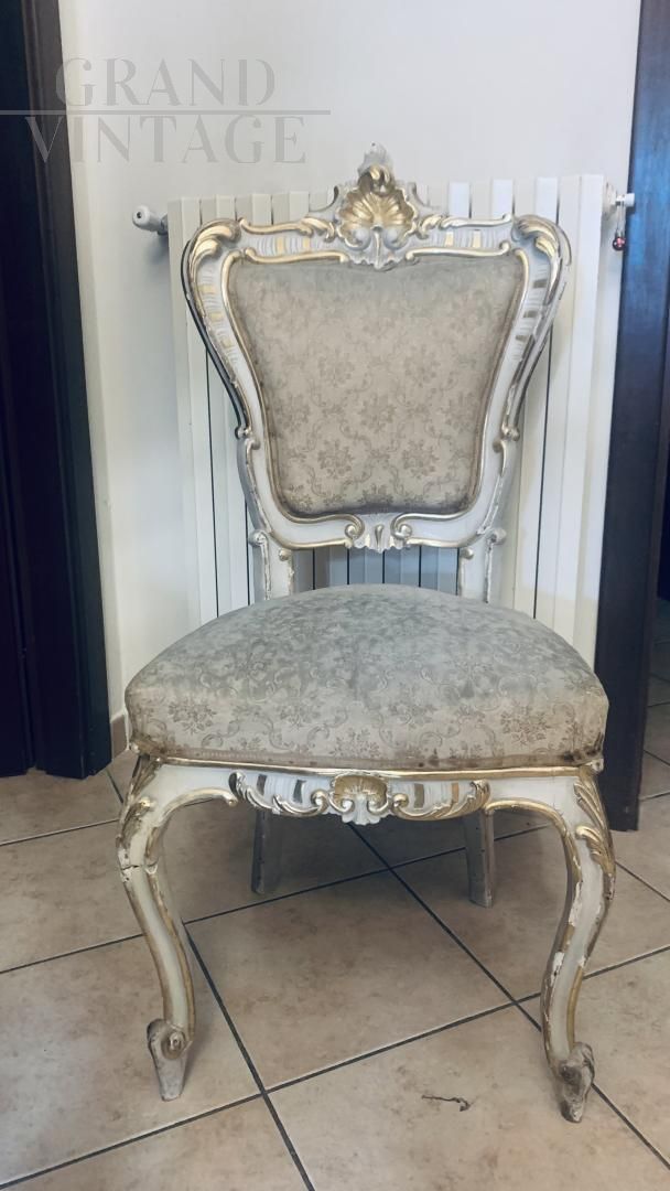 Mid-19th century French carved chairs, in white paint with silver outlines, padded and with springs in the seat. The chairs need to be restored, very beautiful live and impressive. 4 chairs available.