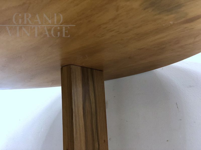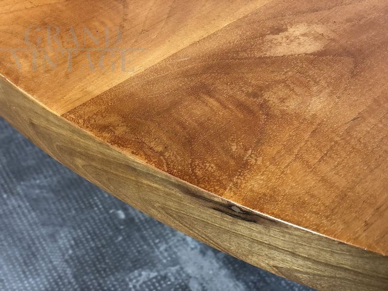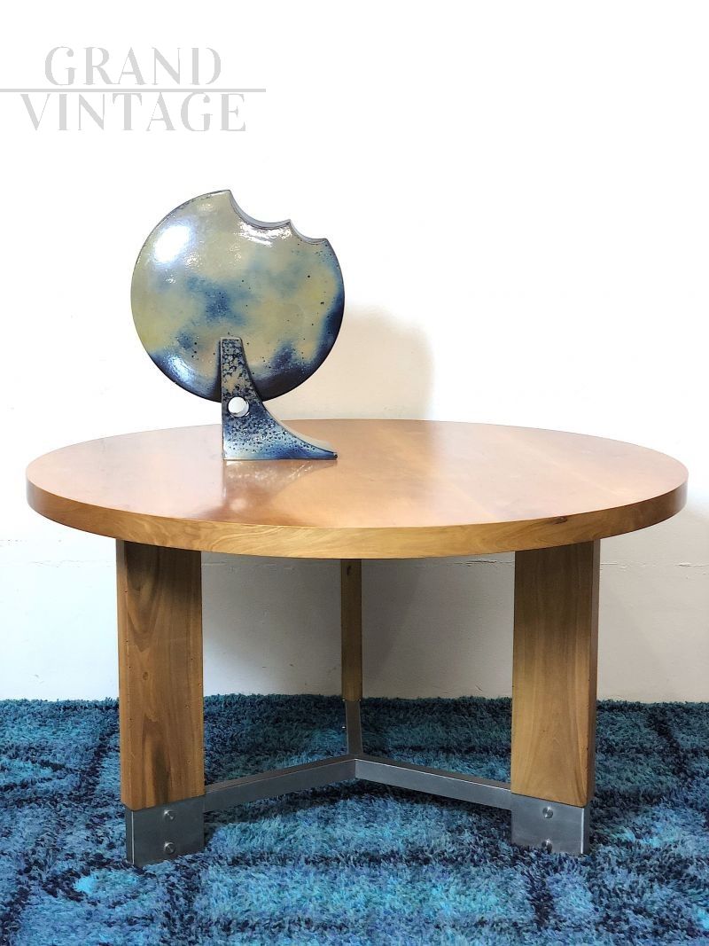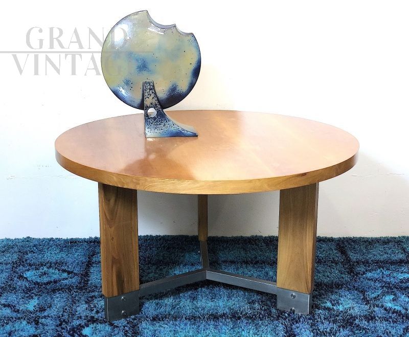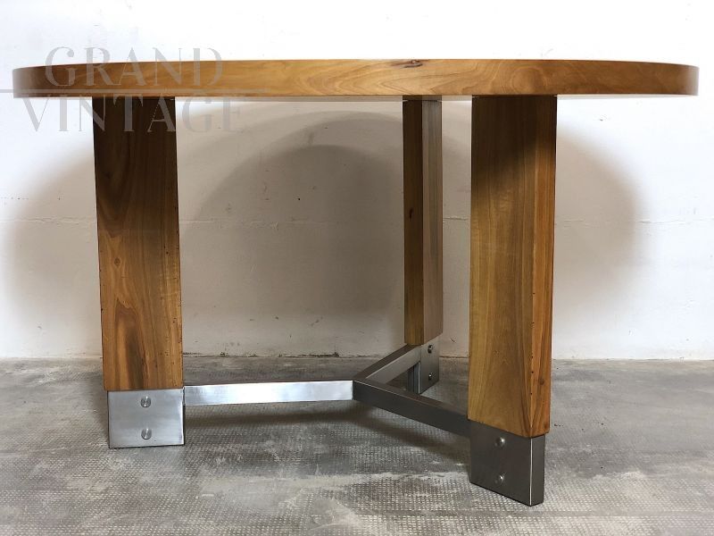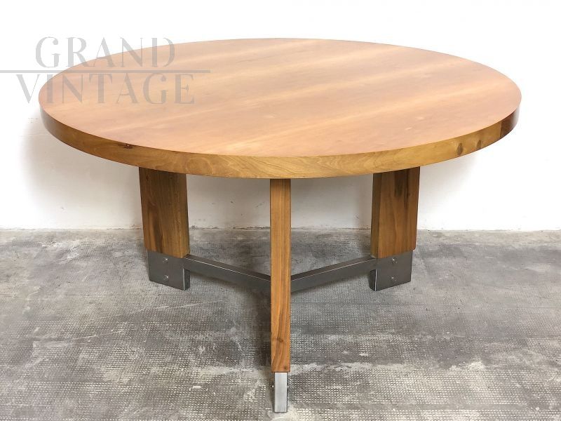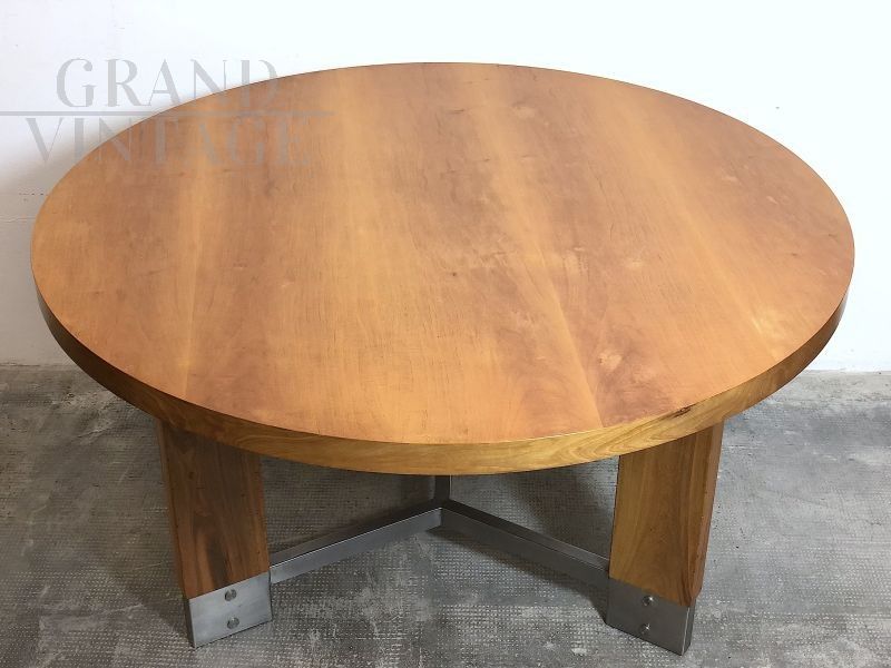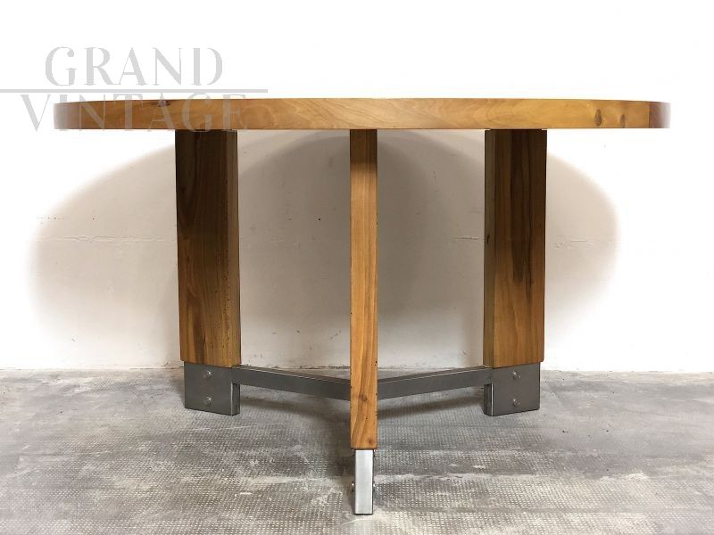 Round dining table from the 60s, modern antiques of Italian manufacture, made of solid wood with a beech top and crossing of the legs in satin steel that brings to mind the Space Age style. In perfect condition. Measurements: Height 75 cm, Diameter 130 cm, Top thickness 5 cm.
