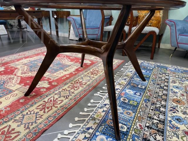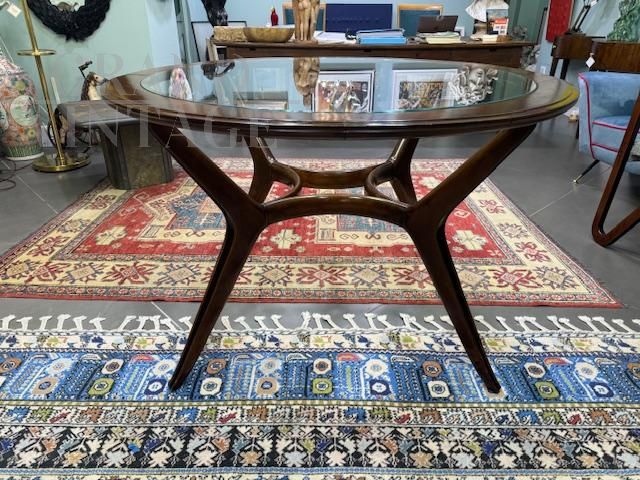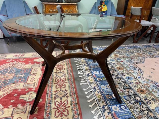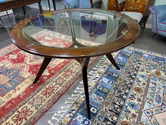 Round vintage design table with transparent glass top and solid Santos mahogany wood structure consisting of four legs connected by an arched cross, embellished with black lacquer details. The table measures 120 cm in diameter and is 77 cm high. It is well made and well preserved.