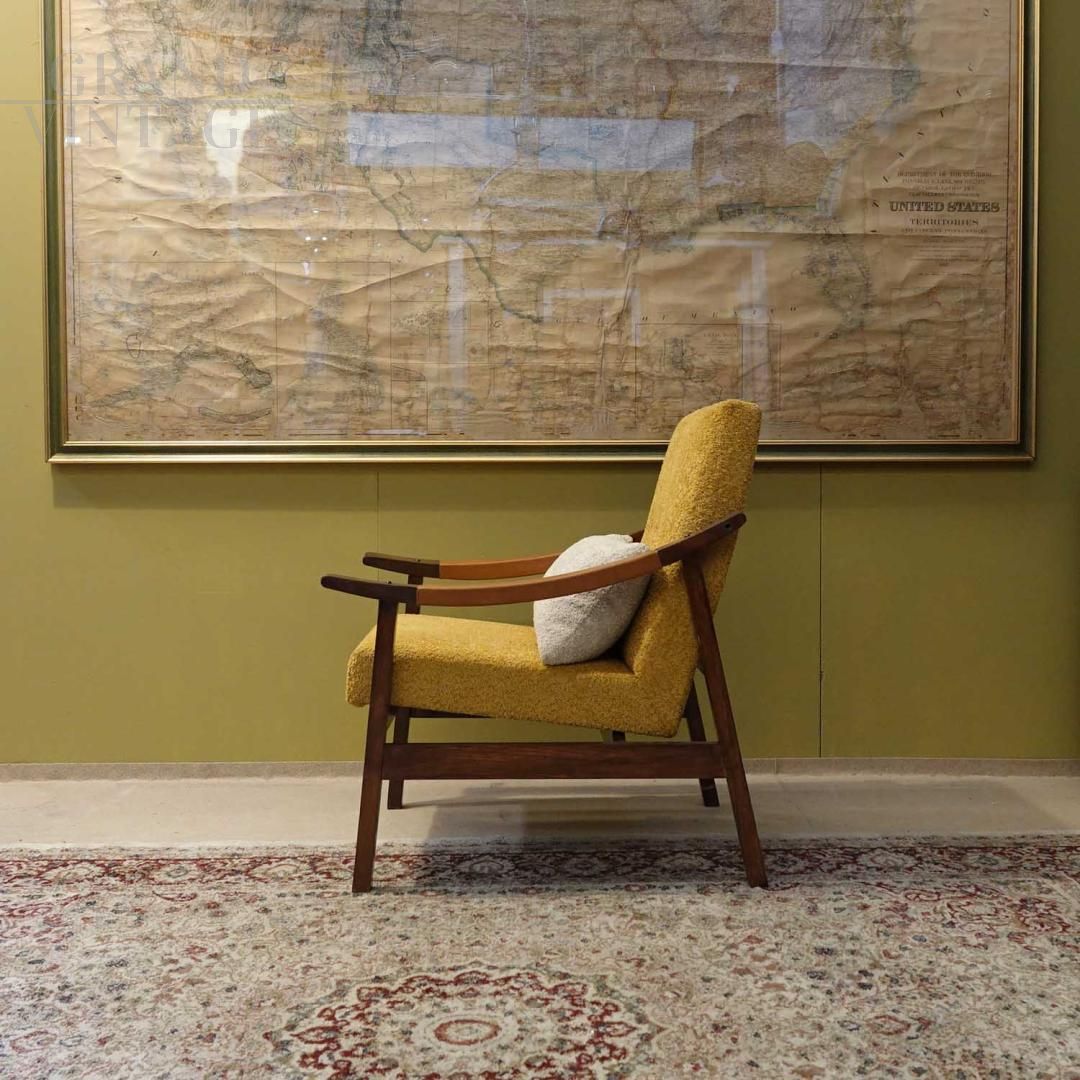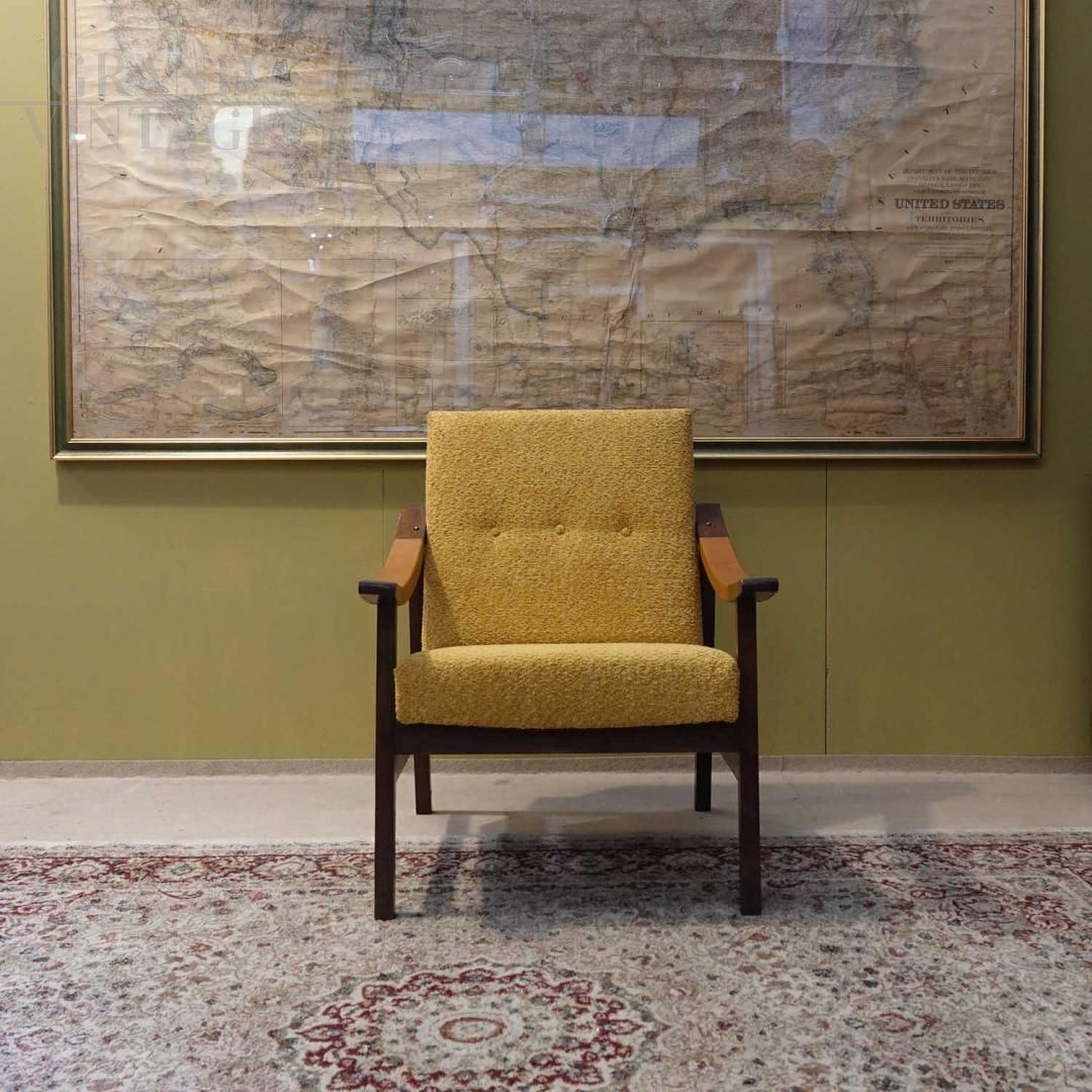 Mid-Century Scandinavian-style armchair covered in yellow bouclé, a soft, curly and enveloping fabric that gives comfort and style. The clean lines and essential design make it perfect for modern, warm and refined environments, with a very trendy retro touch.