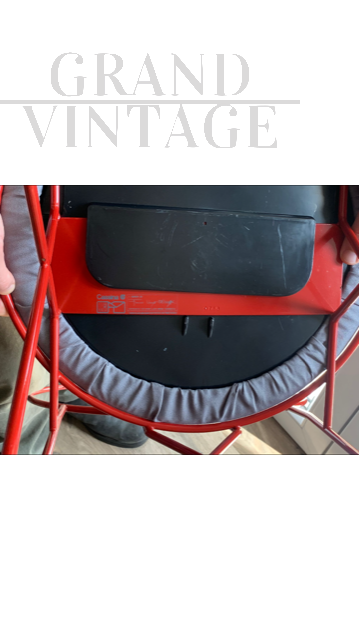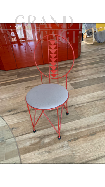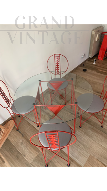 Midway living room set by Frank Lioyd Wright for Cassina consisting of four chairs with red lacquered metal structure and table with glass top, high '70s design, original unique pieces, with clearly visible brand. The set is in good condition.