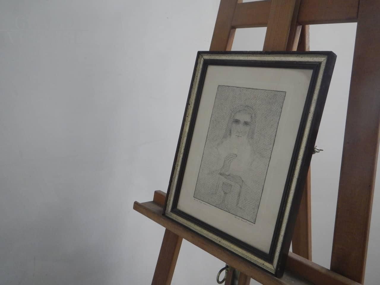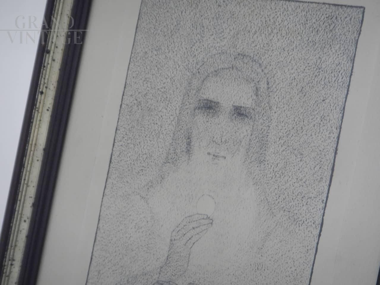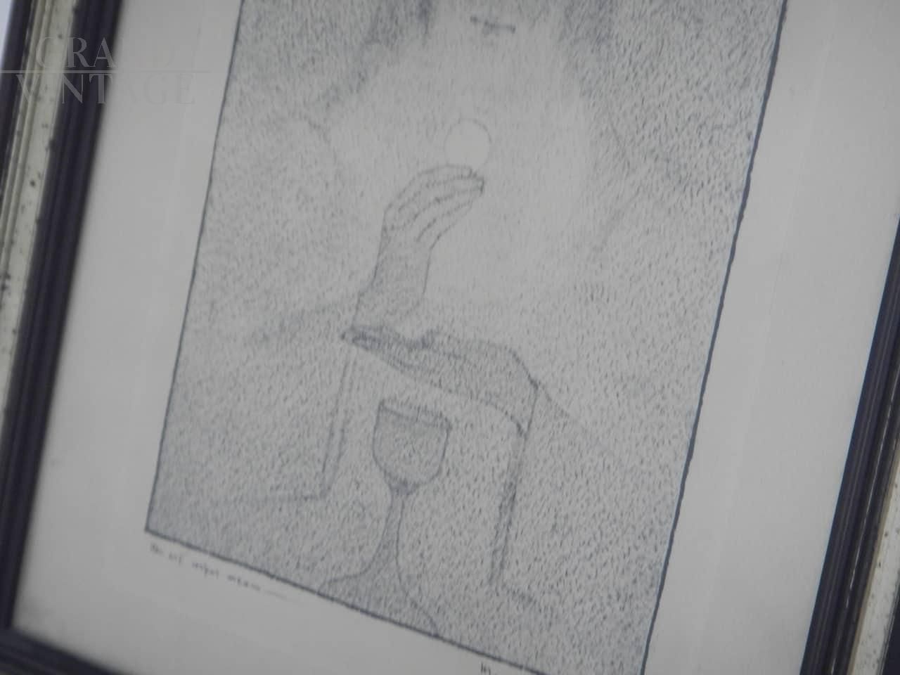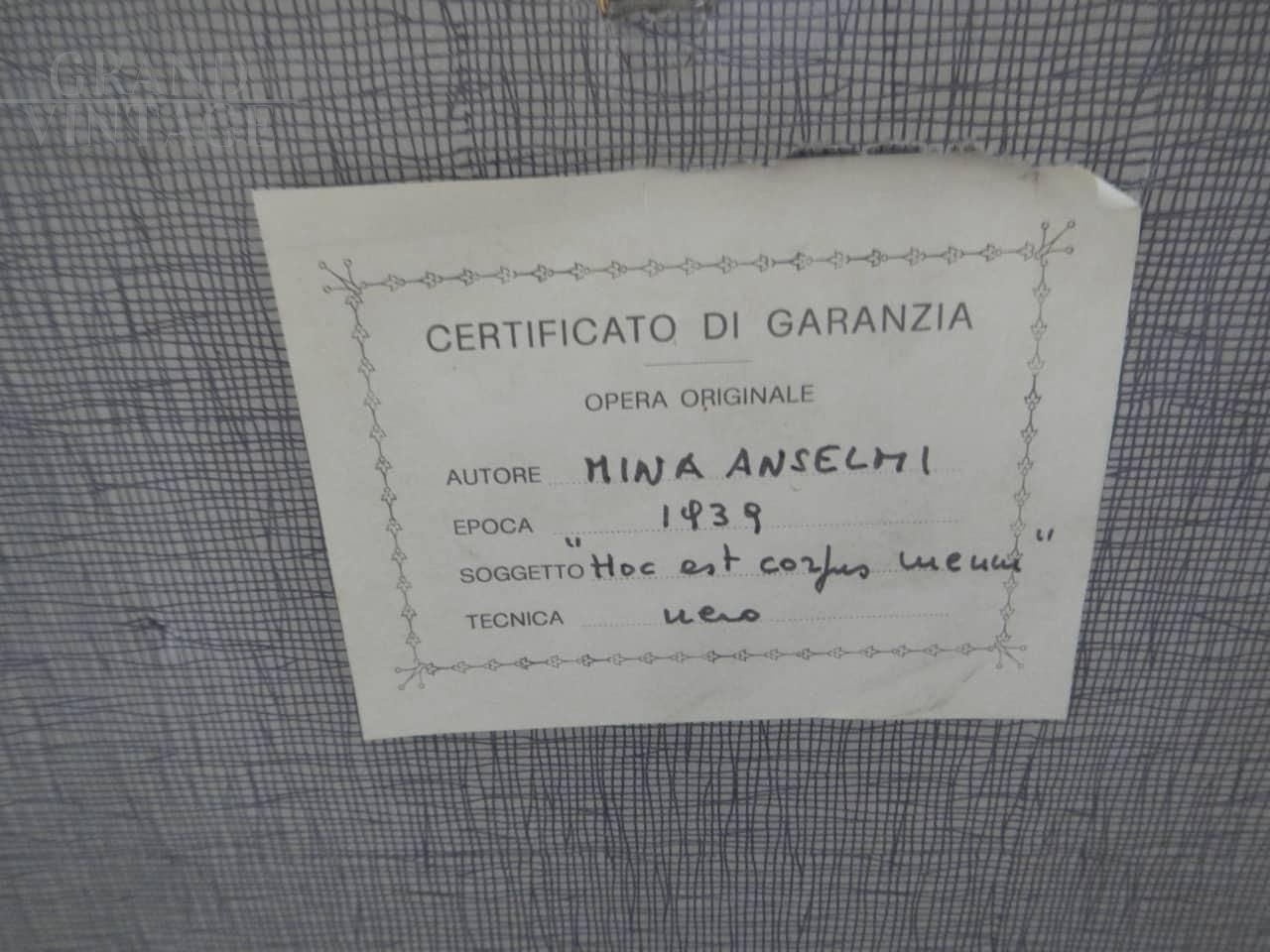 Hoc est corpus meum - sacred-themed painting with Eucharist by the artist Mina Anselmi, made with the black technique, complete with certificate of guarantee of the artwork with date of creation. The frame is brown and gold lacquered spruce with glass, the back is plywood. The artwork measures 13 x 24 cm.