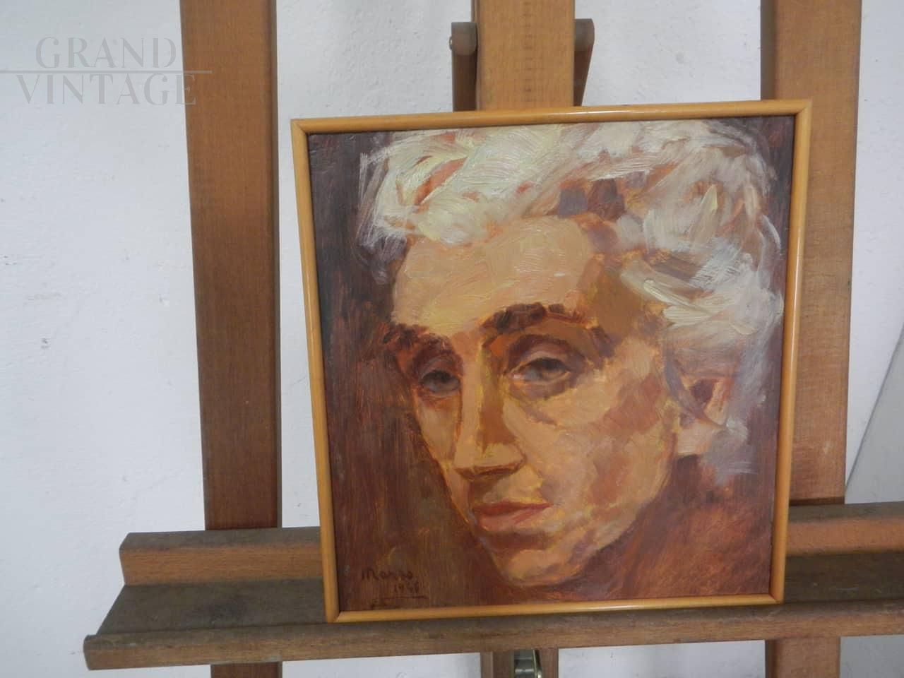 Portrait of a woman by Mina Anselmi, oil painting on plywood, signed and dated, complete with certificate of presentation at the Milan exhibition in 1949 with reference to the painter. The frame is in lacquered fir. The painting measures 23 x 25 cm, with a thickness of 2 cm.