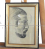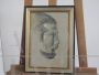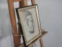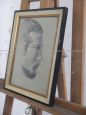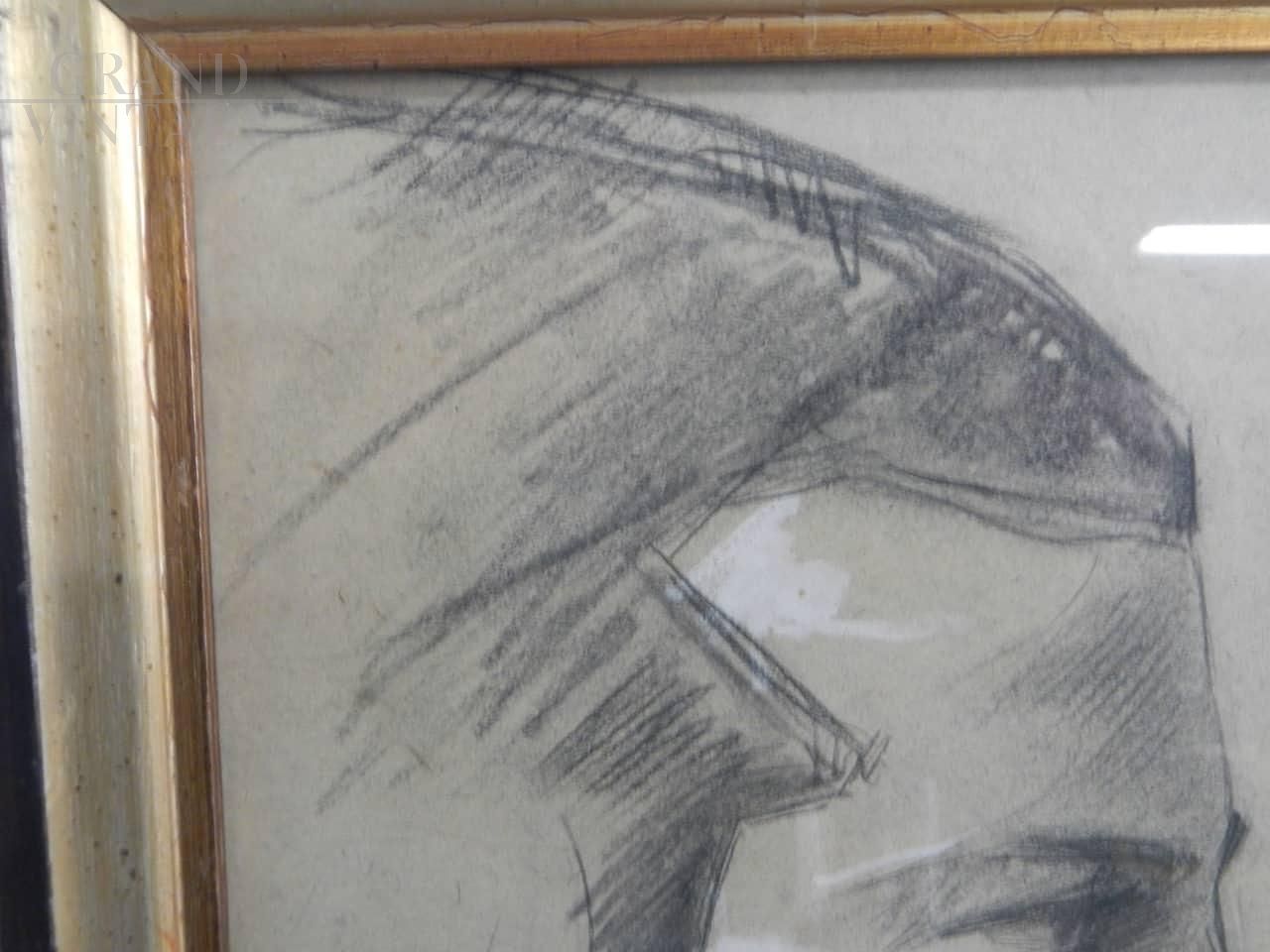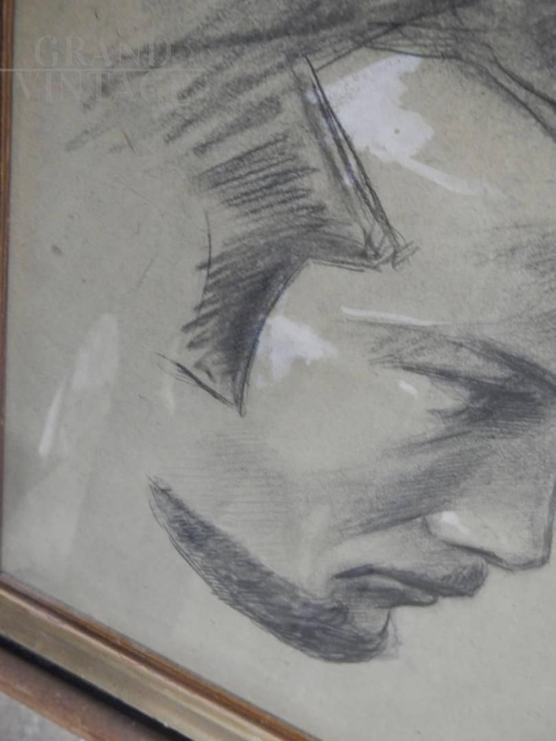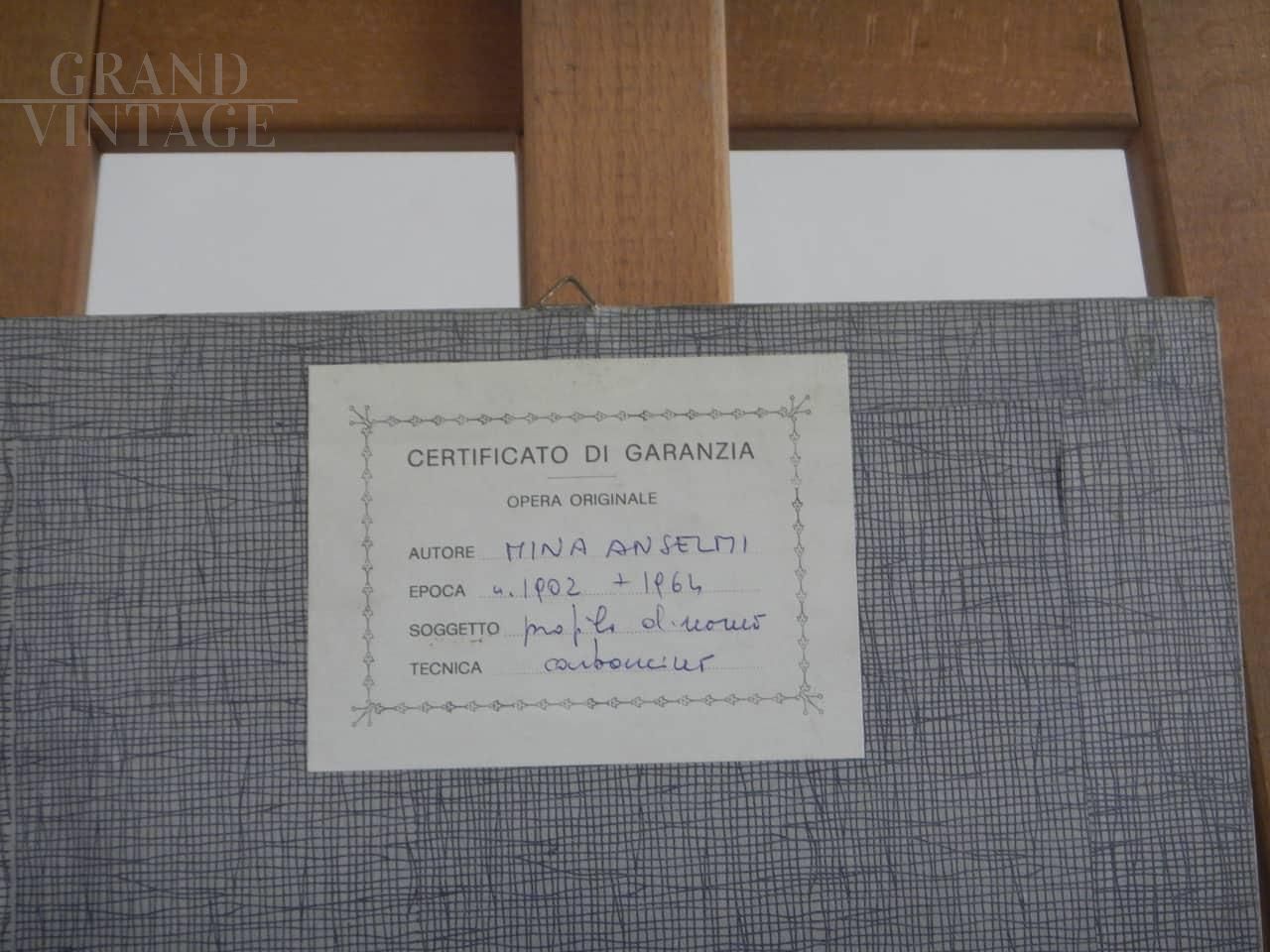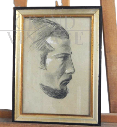 Portrait of a young man by Mina Anselmi titled Profiles of Man, charcoal on paper, complete with certificate of guarantee of the artwork, with brown and gold lacquered fir frame with glass. The back is plywood. The artwork measures 20x28 cm.