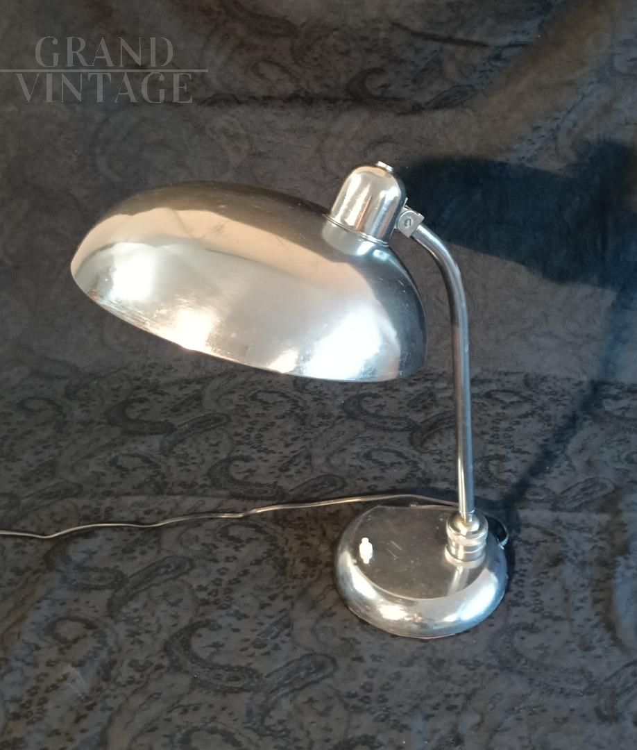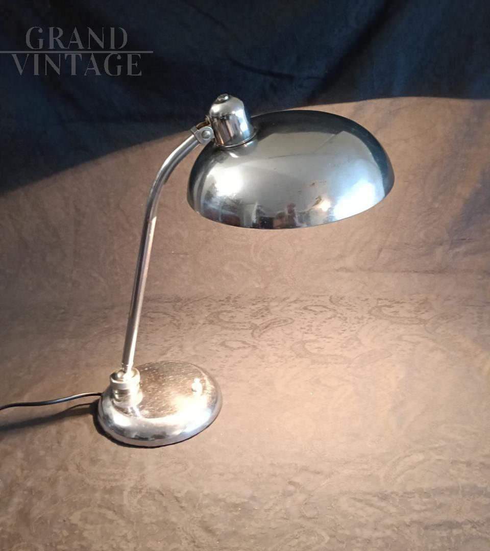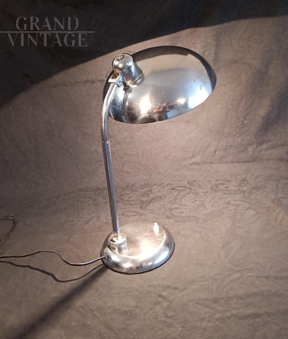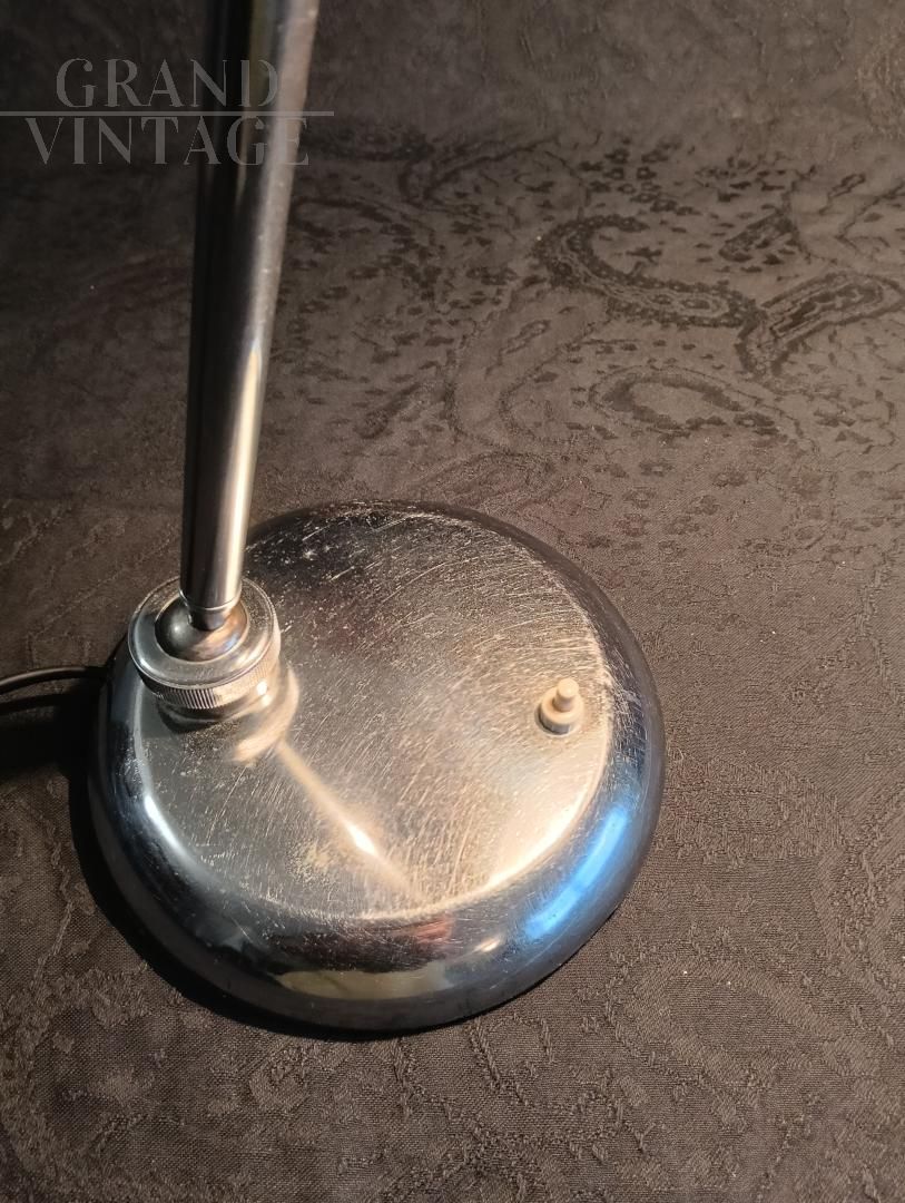 Ministerial table lamp, 1940s/1950s, attributed to Giovanni Michelucci for Lariolux, made of nickel-plated brass, adjustable in various directions. Switch on the base, E27 bulb socket. Rewired and in working order, leather has been glued under the base to protect the table. The lamp shows natural signs of use.