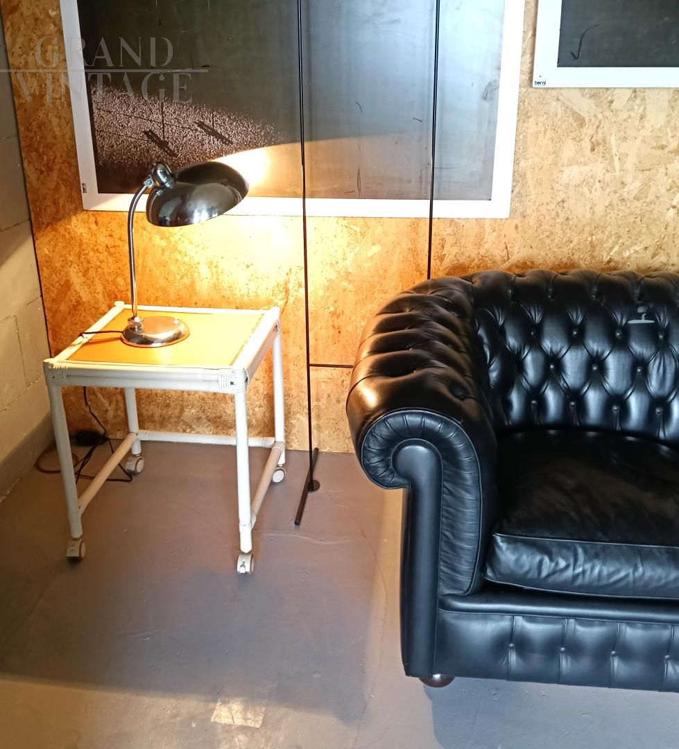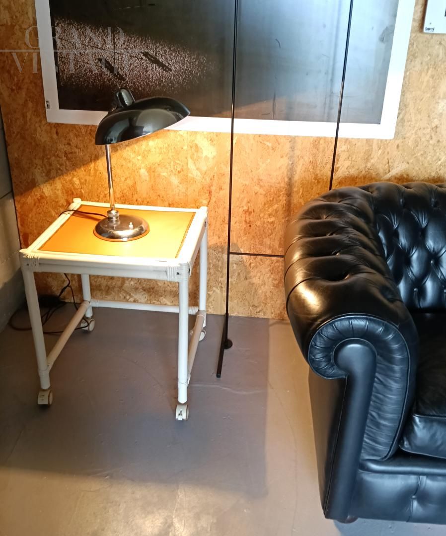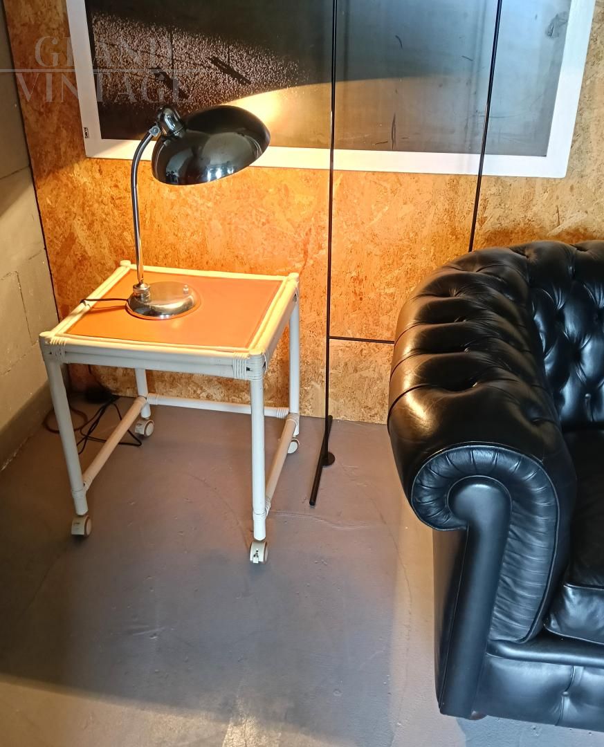 Ministerial table lamp, 1940s/1950s, attributed to Giovanni Michelucci for Lariolux, made of nickel-plated brass, adjustable in various directions. Switch on the base, E27 bulb socket. Rewired and in working order, leather has been glued under the base to protect the table. The lamp shows natural signs of use.