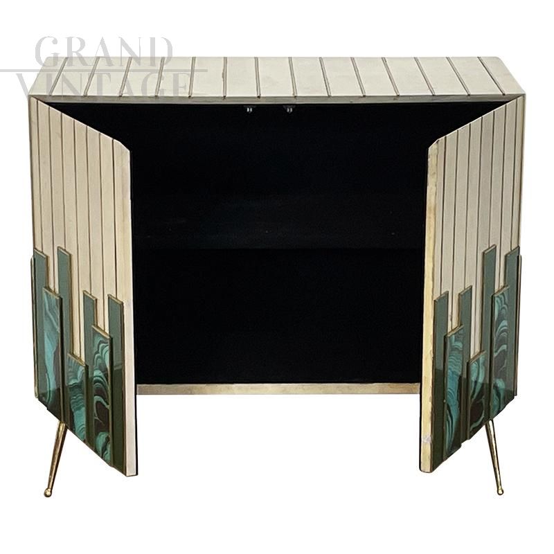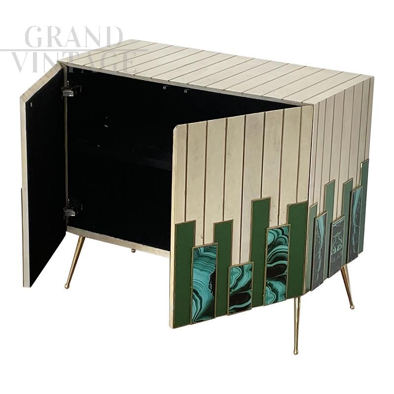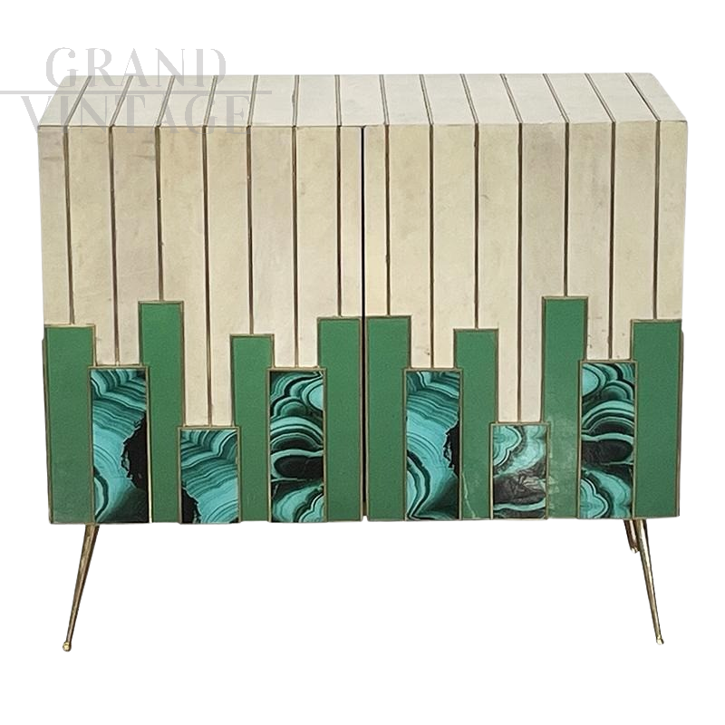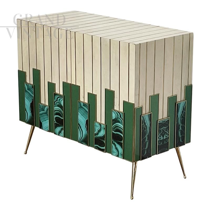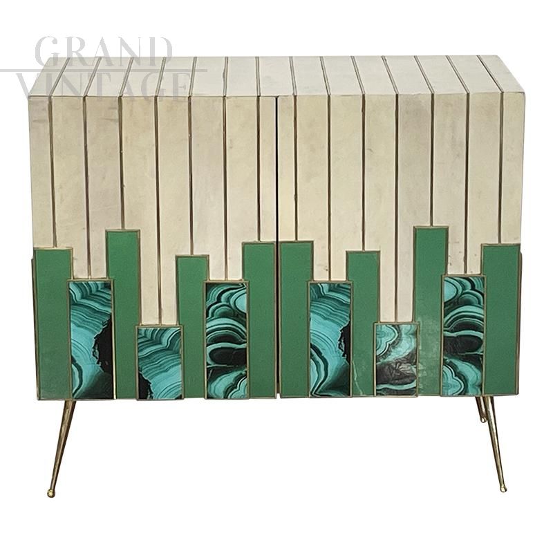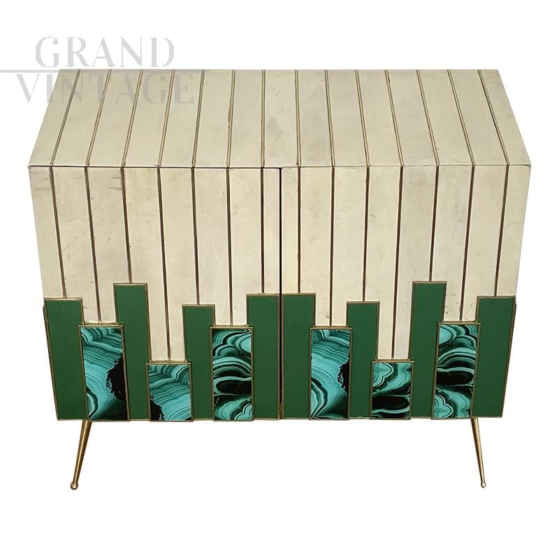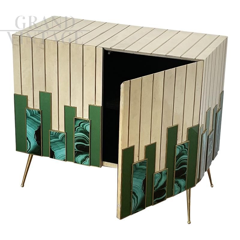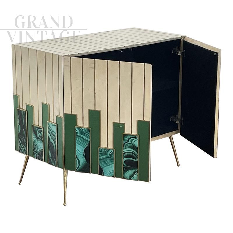 Small sideboard living room cabinet with two push-pull doors, entirely handmade, wooden structure covered with solid green glass elements alternating with malachite effect printed glass elements and natural parchment, profiles and feet in golden brass. An internal shelf.